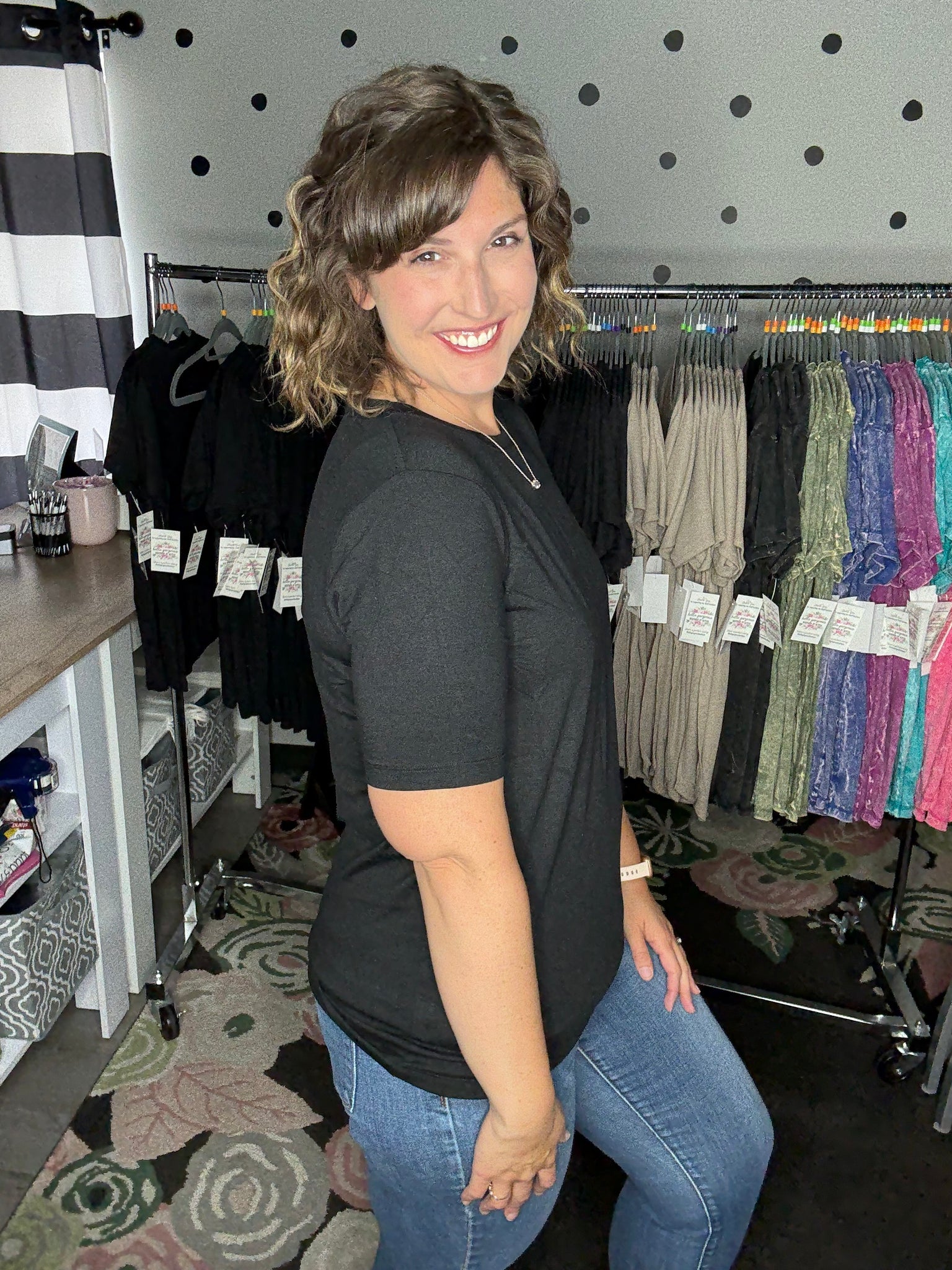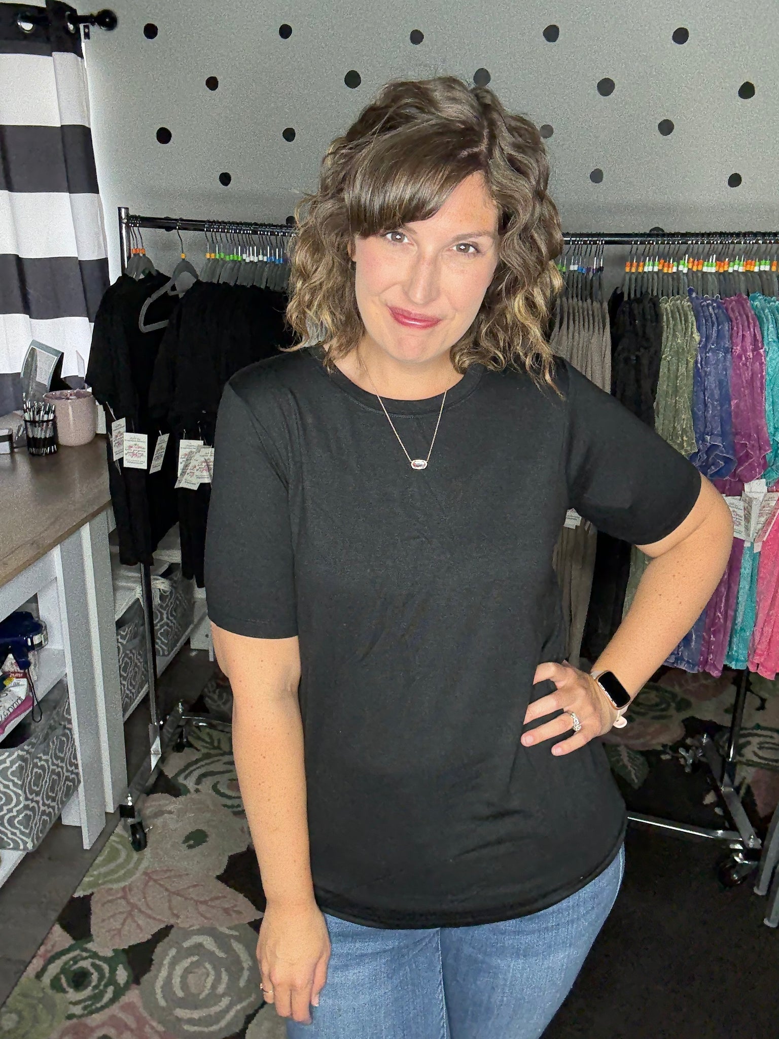 If you've been searching for the perfect basic black tee look no further! The round neck, the sleeve length, and the shape - all fantastic for layering or for wearing on its own. True to size. 57% polyester, 38% rayon, 5% spandex.