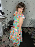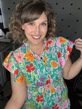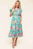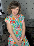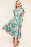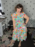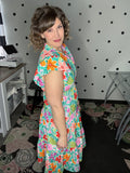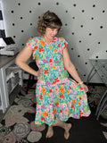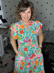 Perfect for Easter or Mother's Day! Aqua, red, pink, orange and purple floral printed midi dress with flutter sleeves and side pockets. This stunning dress features a smocked waist and tiered design. Midi length. The neckline is a frilled v-neck. The fabric is woven 100% polyester. The fit is true to size. Alyssa is a size 12/14 and wearing the medium here.