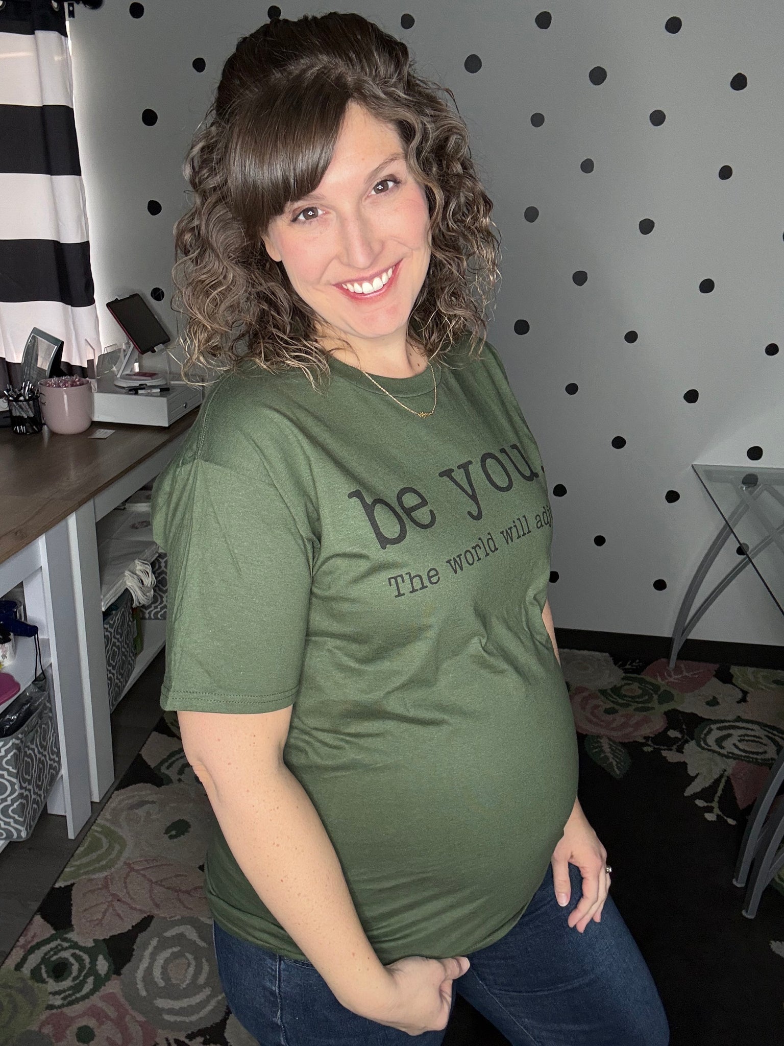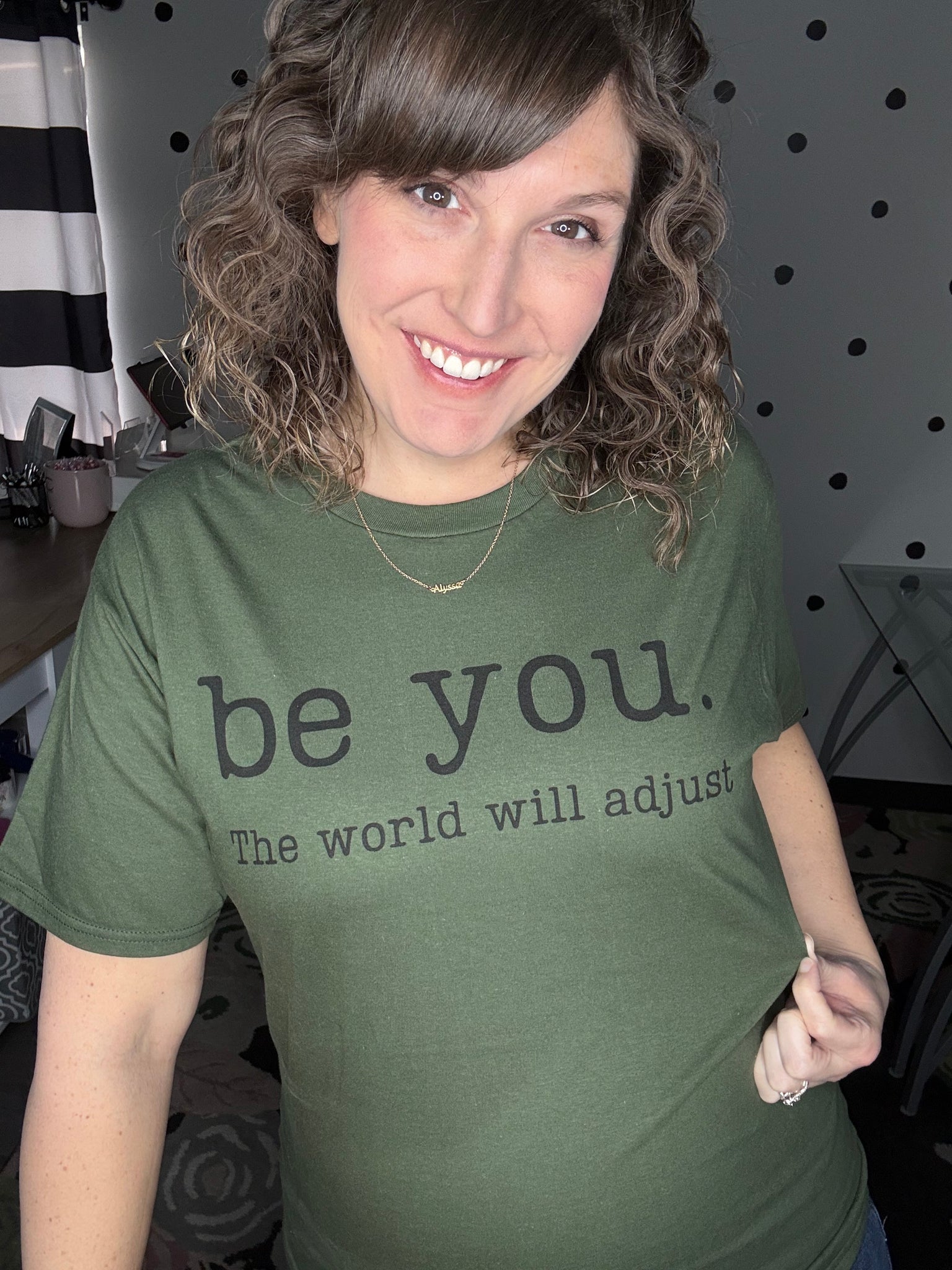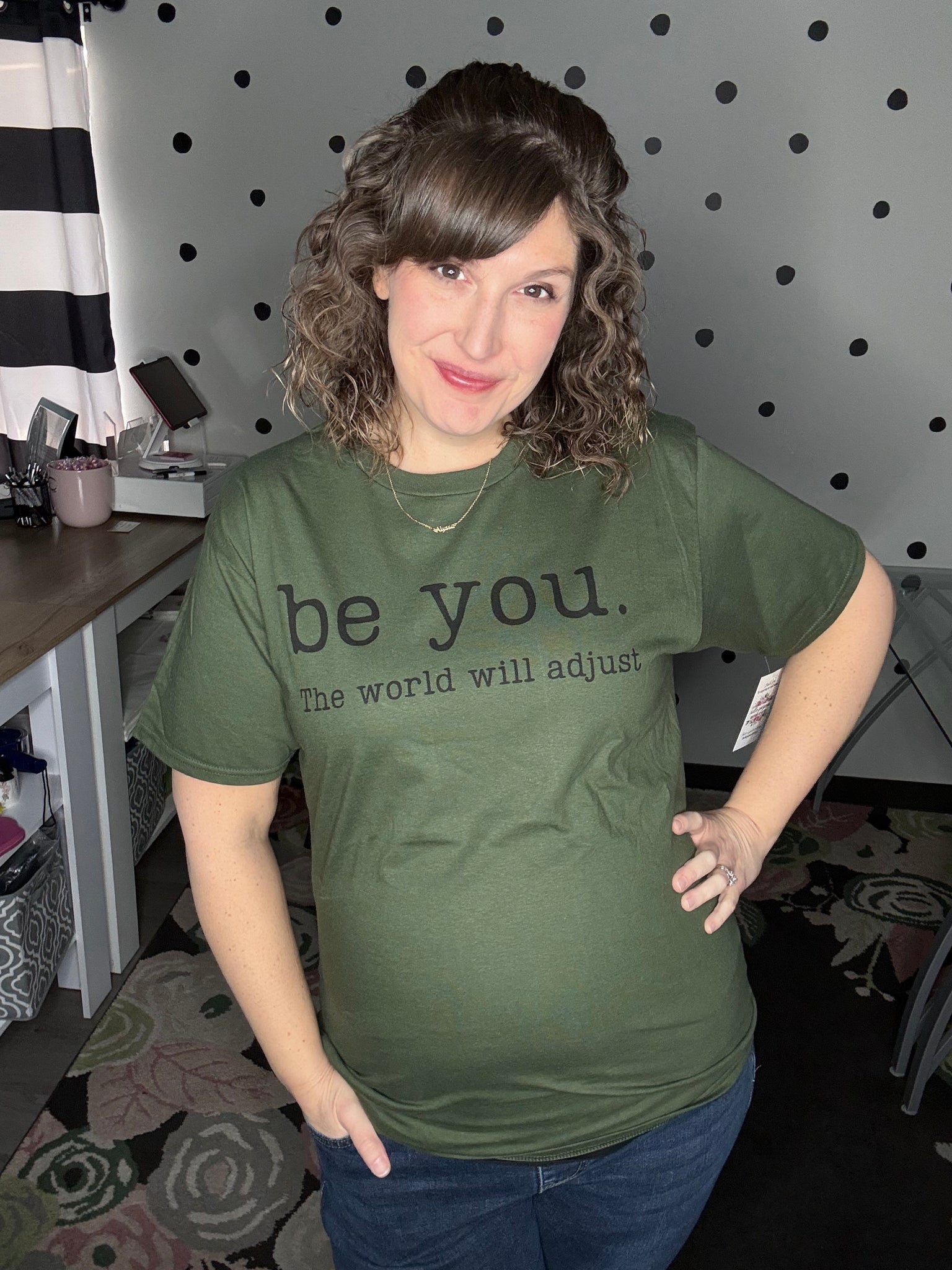 BE YOU THE WORLD WILL ADJUST printed on a military green short sleeve t-shirt. UNISEX FIT.