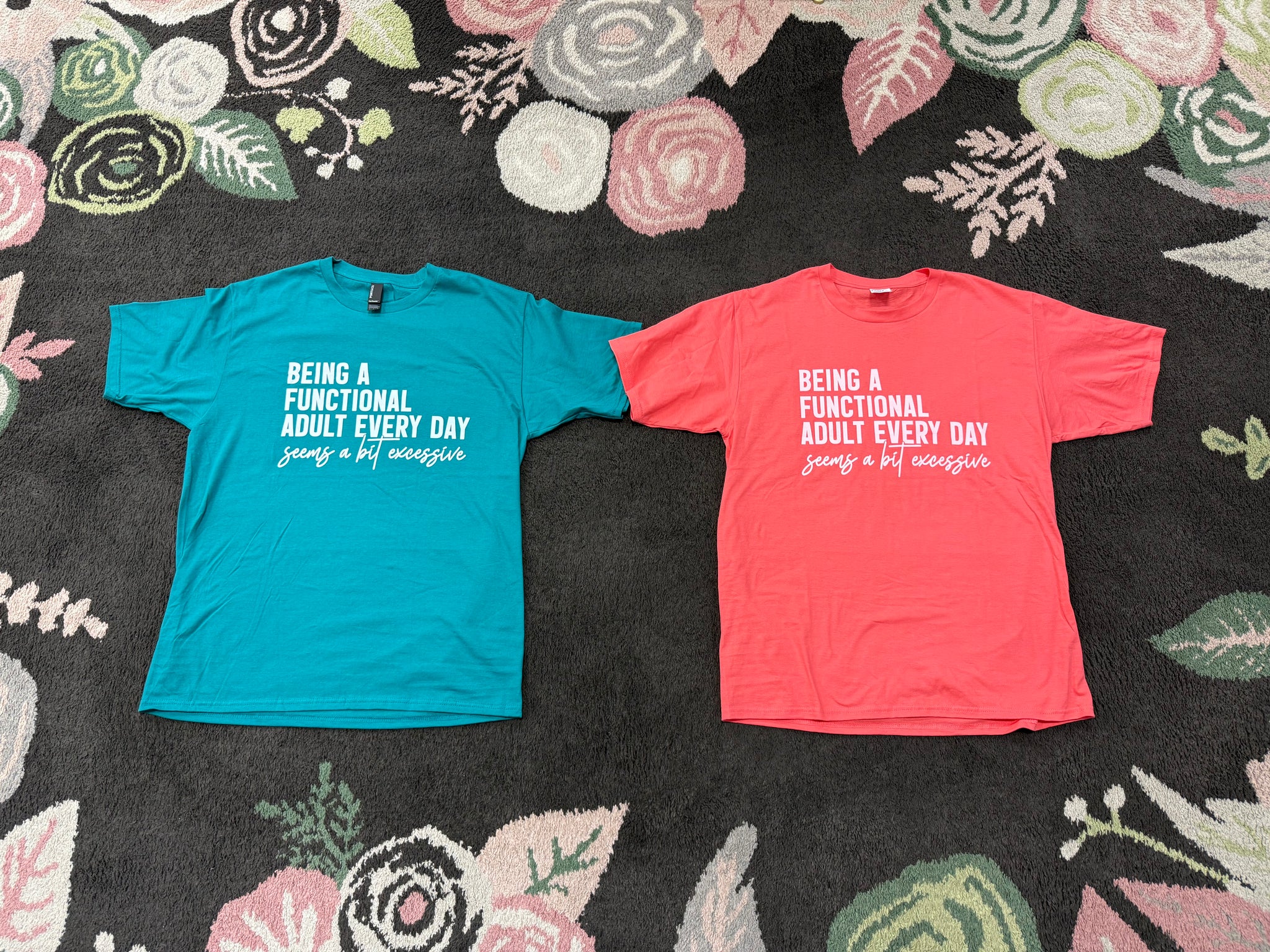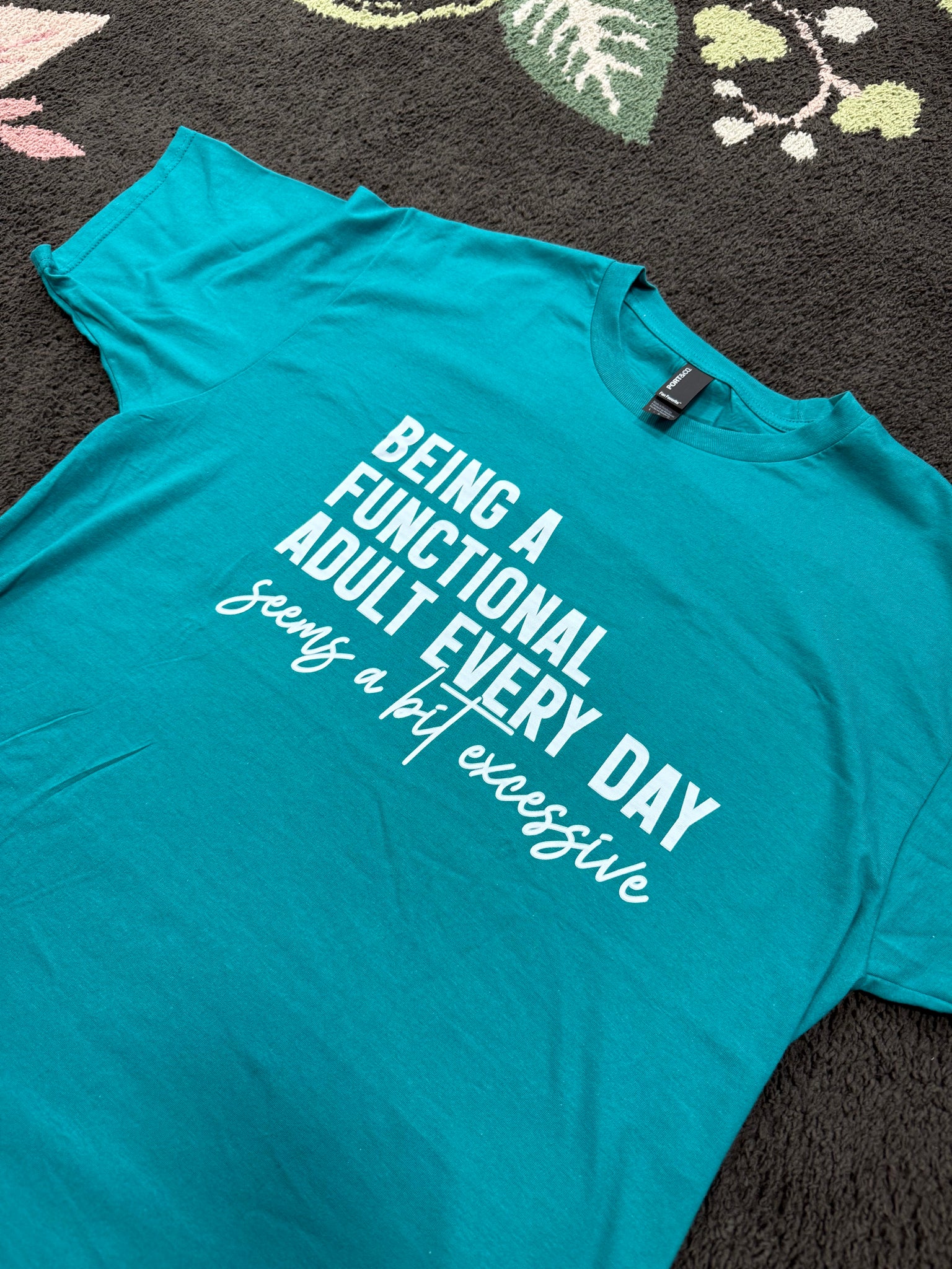 Being A Functional Adult Every Day Seems A Bit Excessive printed on a TEAL unisex fit short sleeve t-shirt.