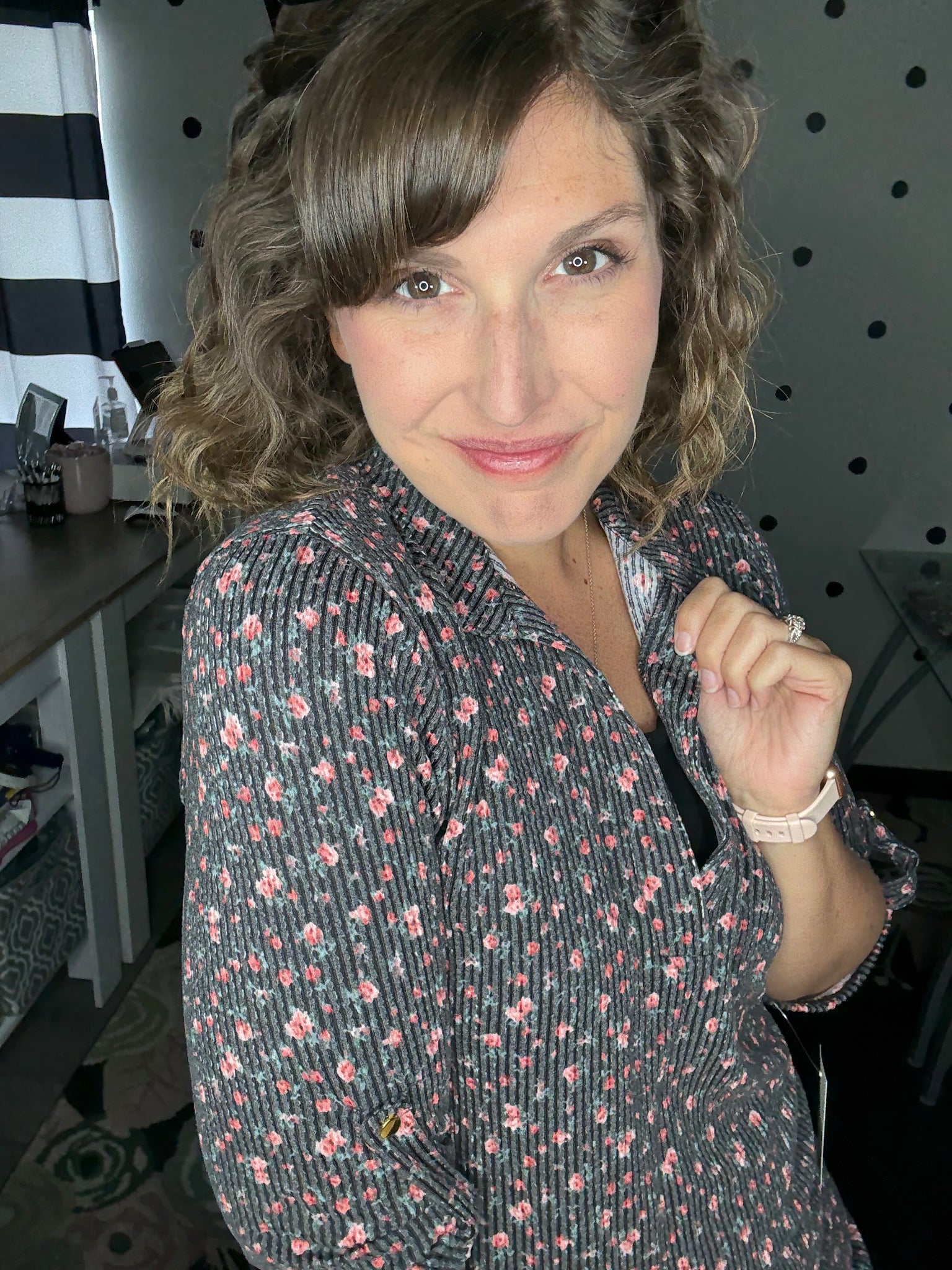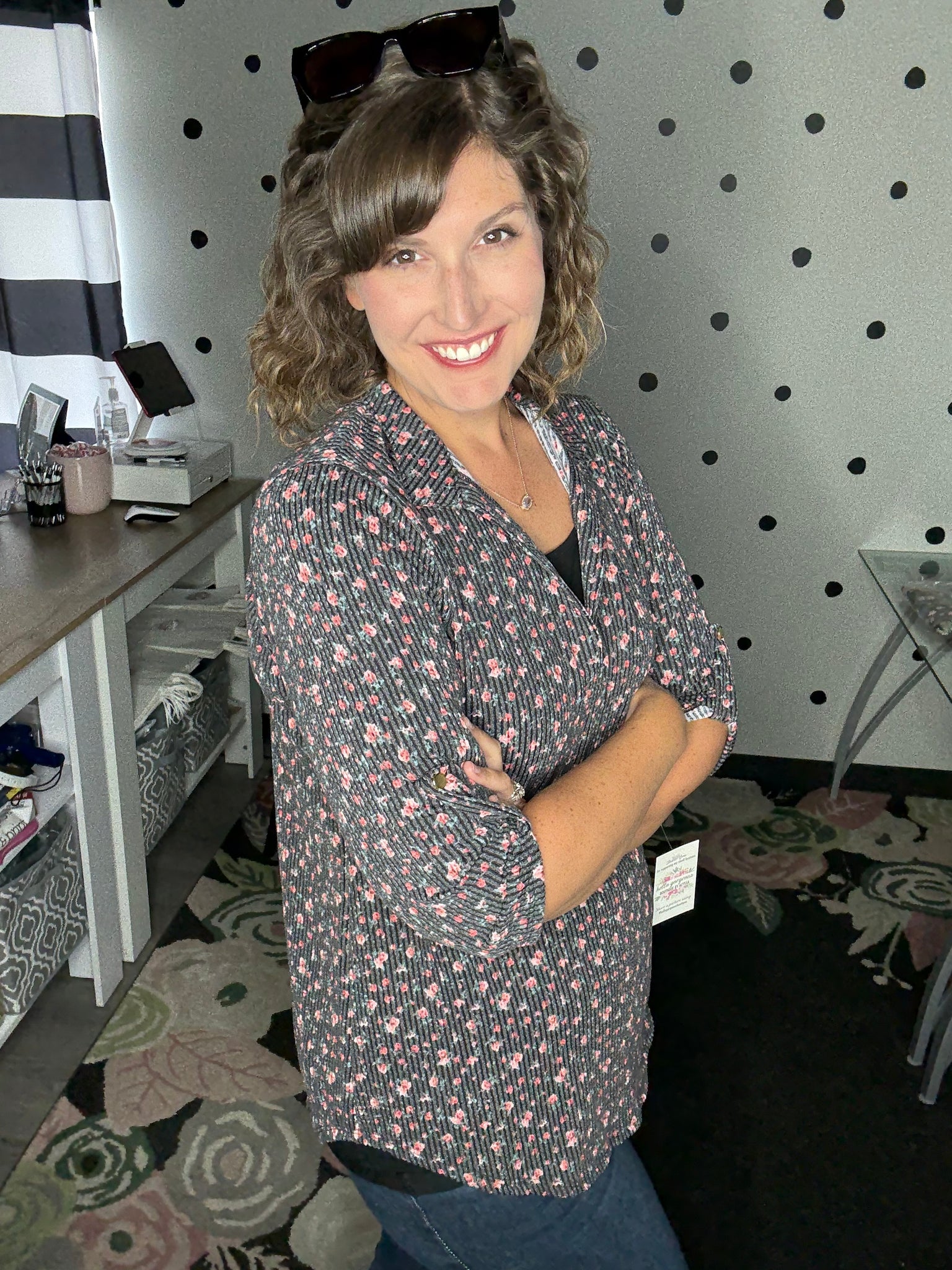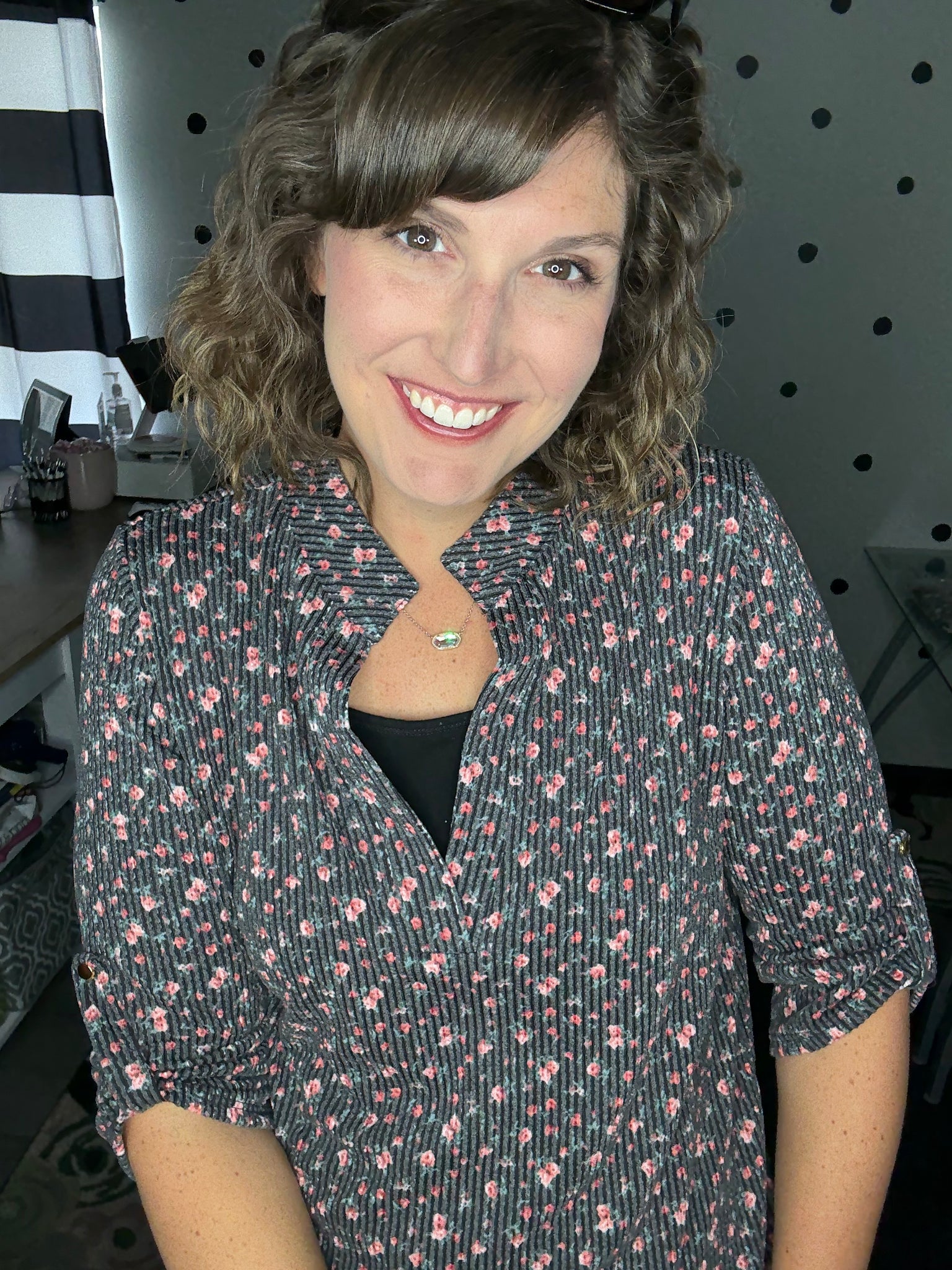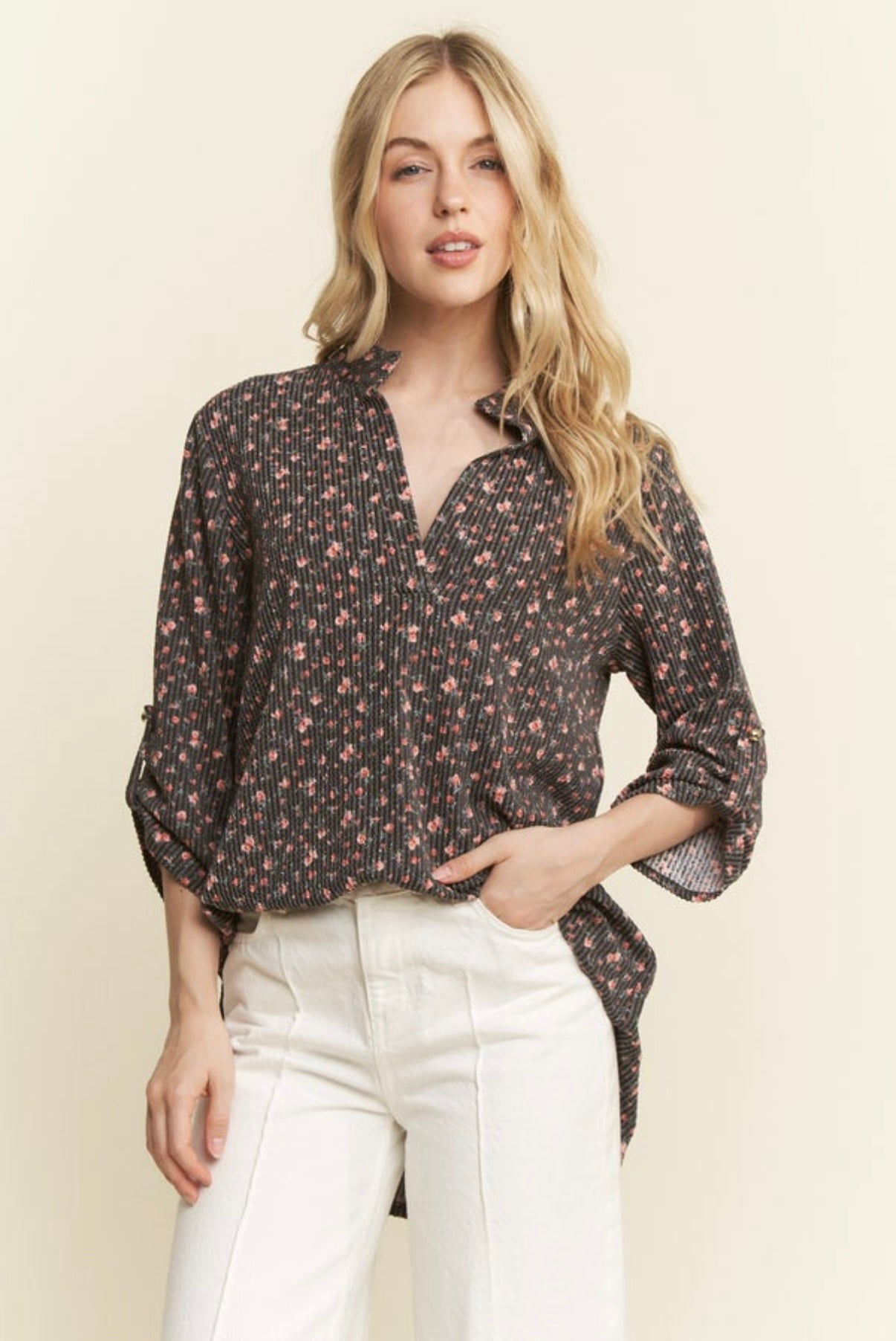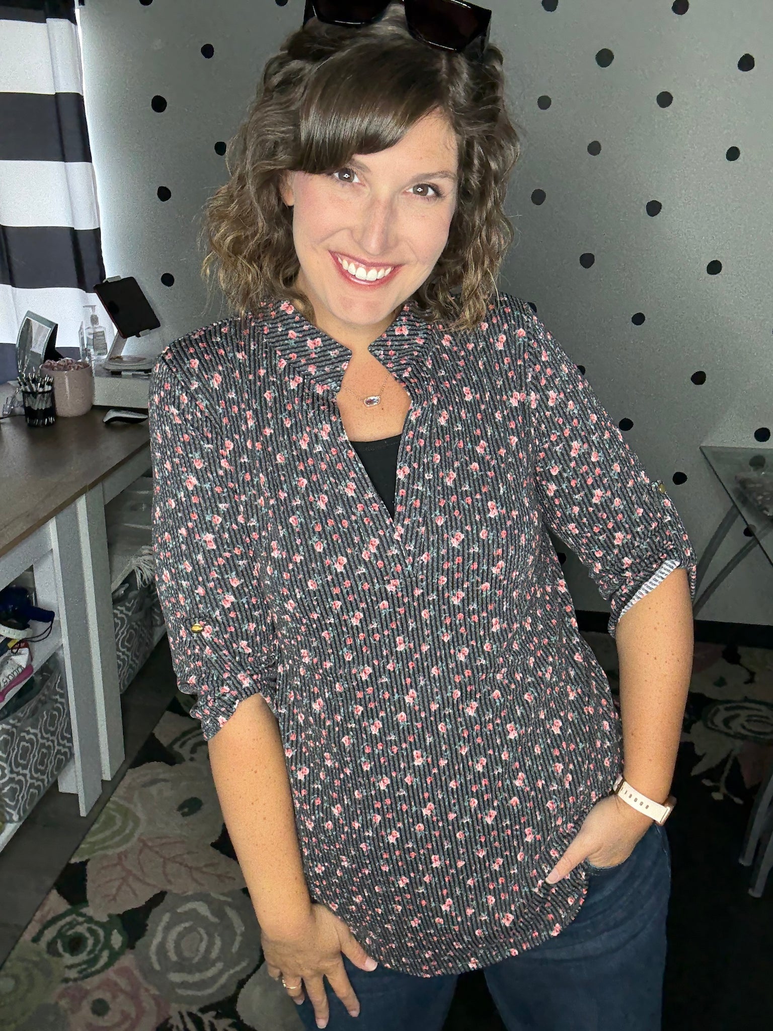 Black ribbed top with ditsy floral, this v-neck blouse features a half collared neckline and 3/4 length sleeves with faux buttons. The fabric is soft and ribbed. The fit is true to size. Alyssa is wearing a medium here.