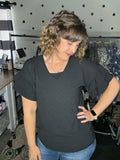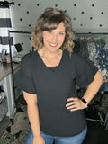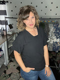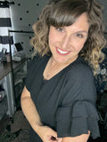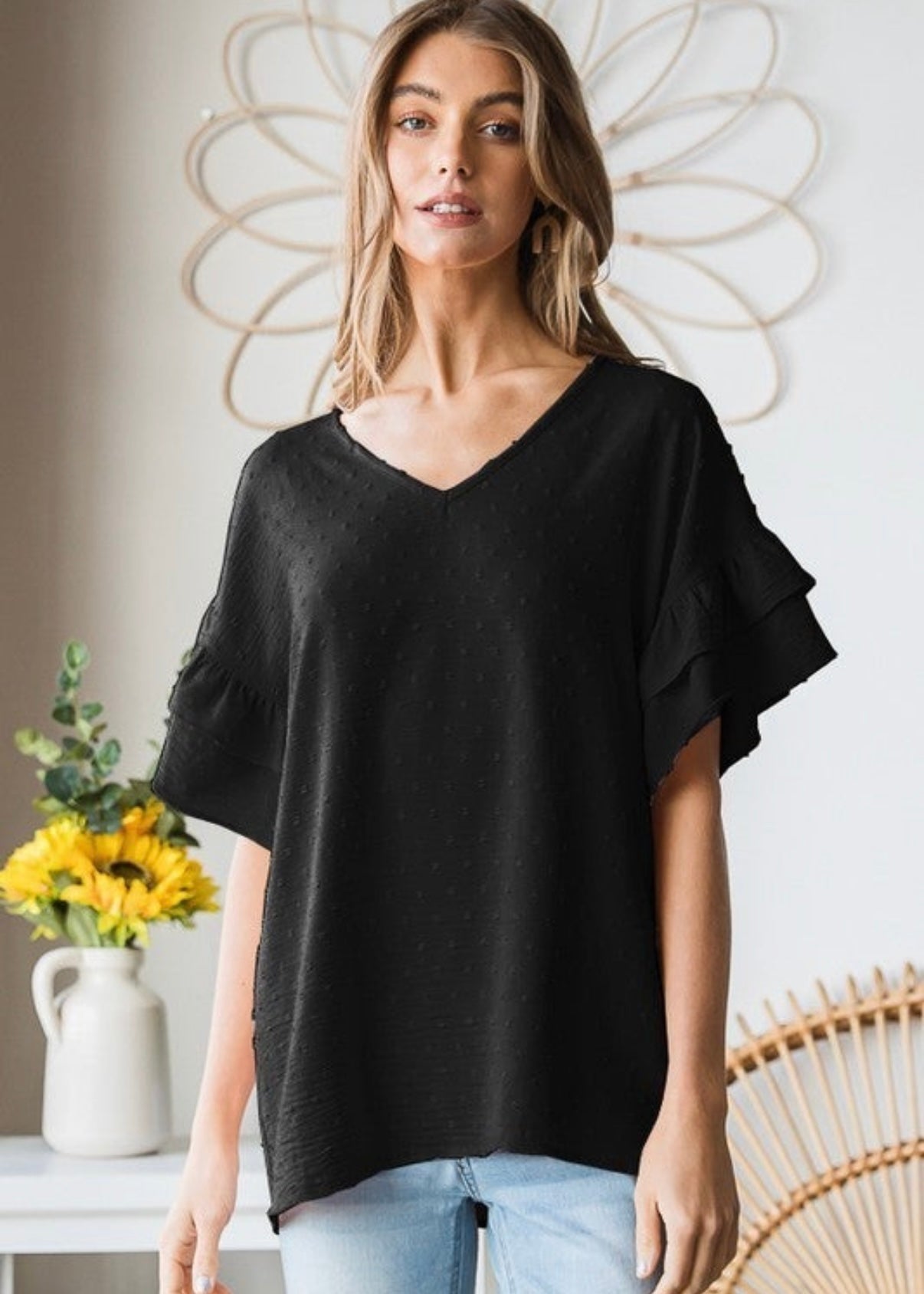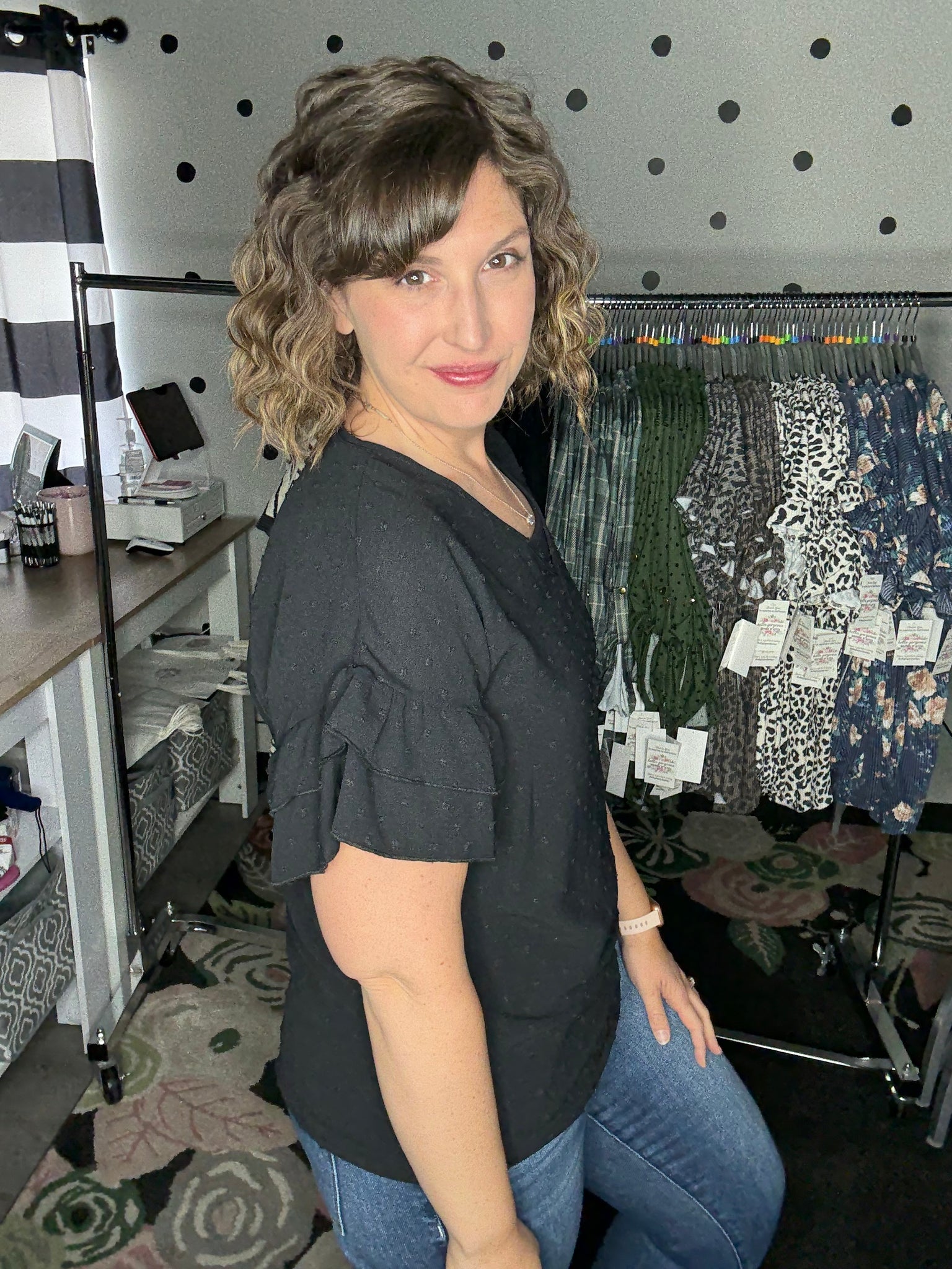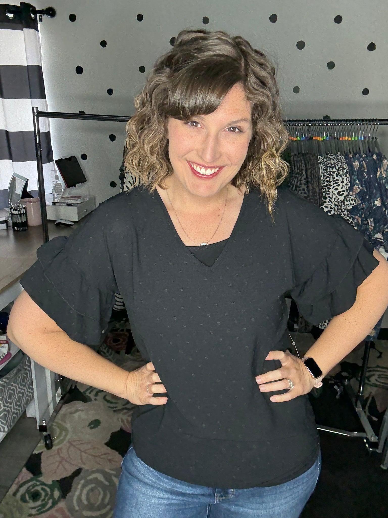 Swiss dot fabric is a lightweight cotton fabric characterized by small, raised dots created through techniques such as embroidery. This black dotted blouse features a slight v-neck and a double ruffle sleeve. The fabric is woven and blouse-like with no stretch. The fit is true to size, Alyssa is wearing a medium here.