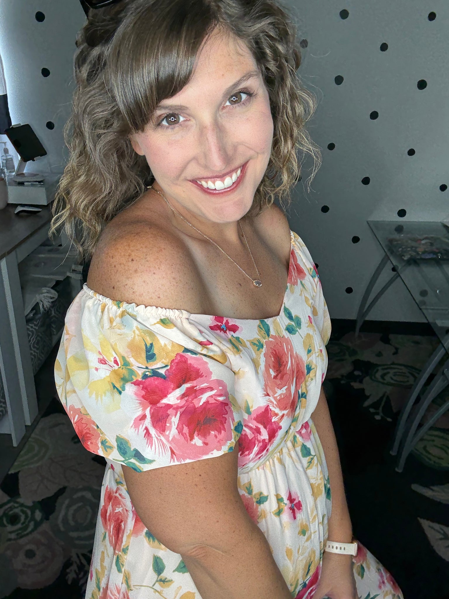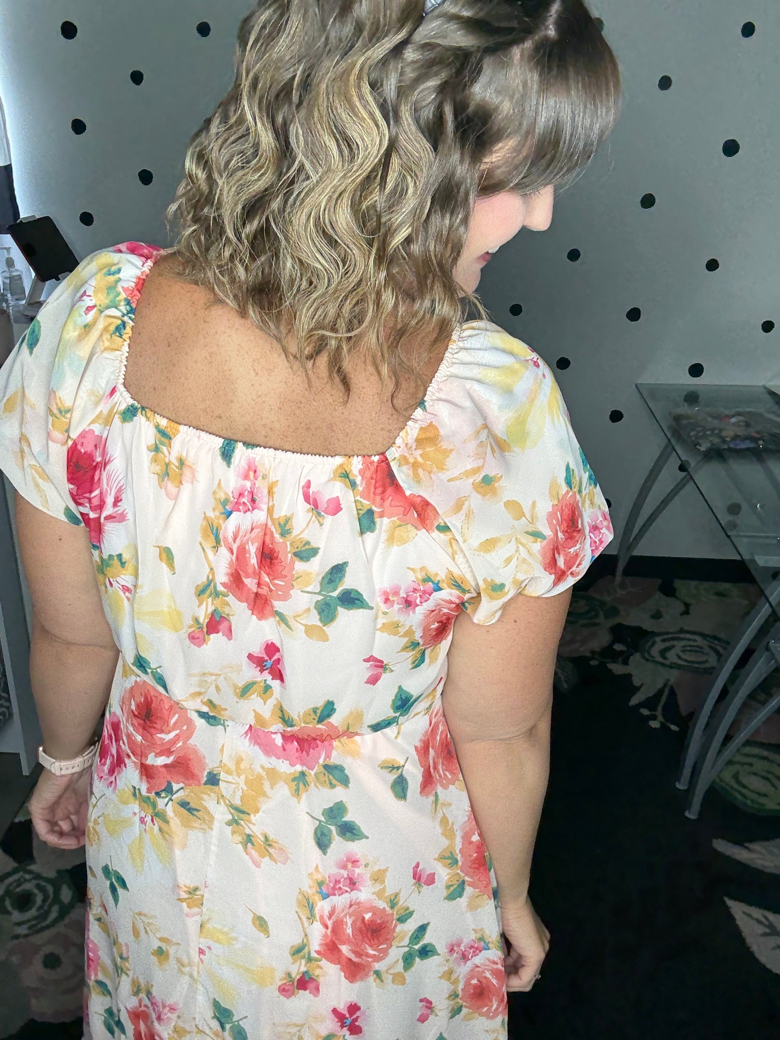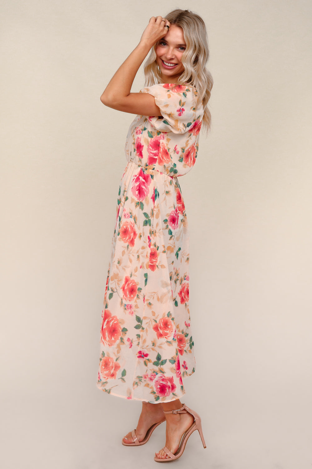 Gorgeous floral printed dress with a puff sleeve, elastic waist and slight v-neck. This chiffon dress is 100% polyester and lined. Midi length. True to size. Alyssa is wearing a medium here.