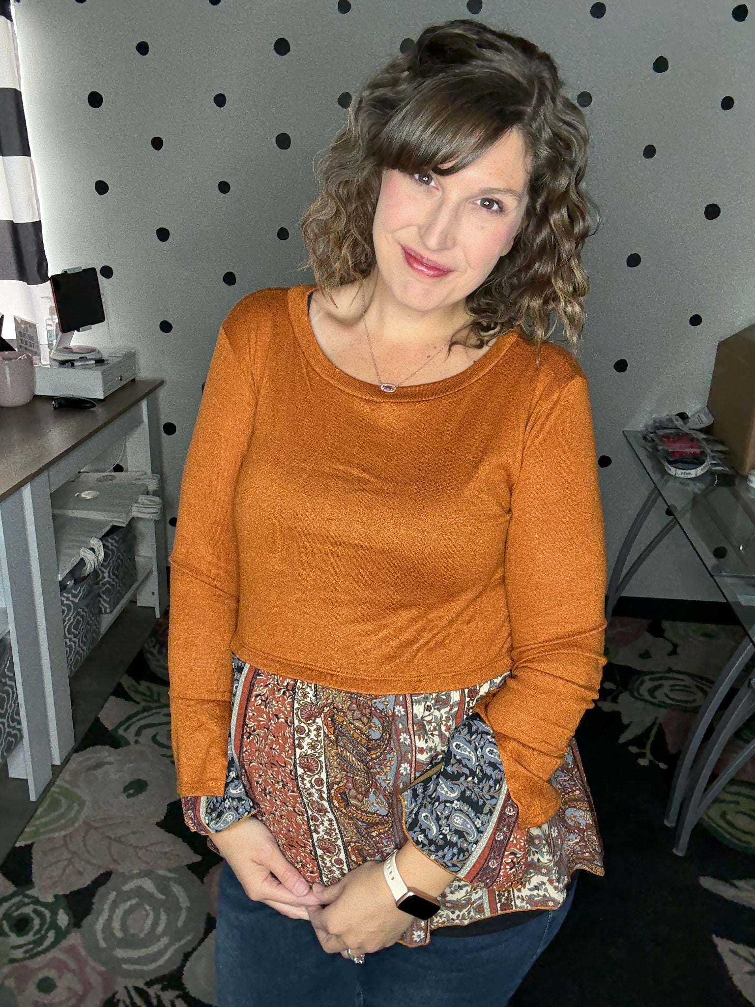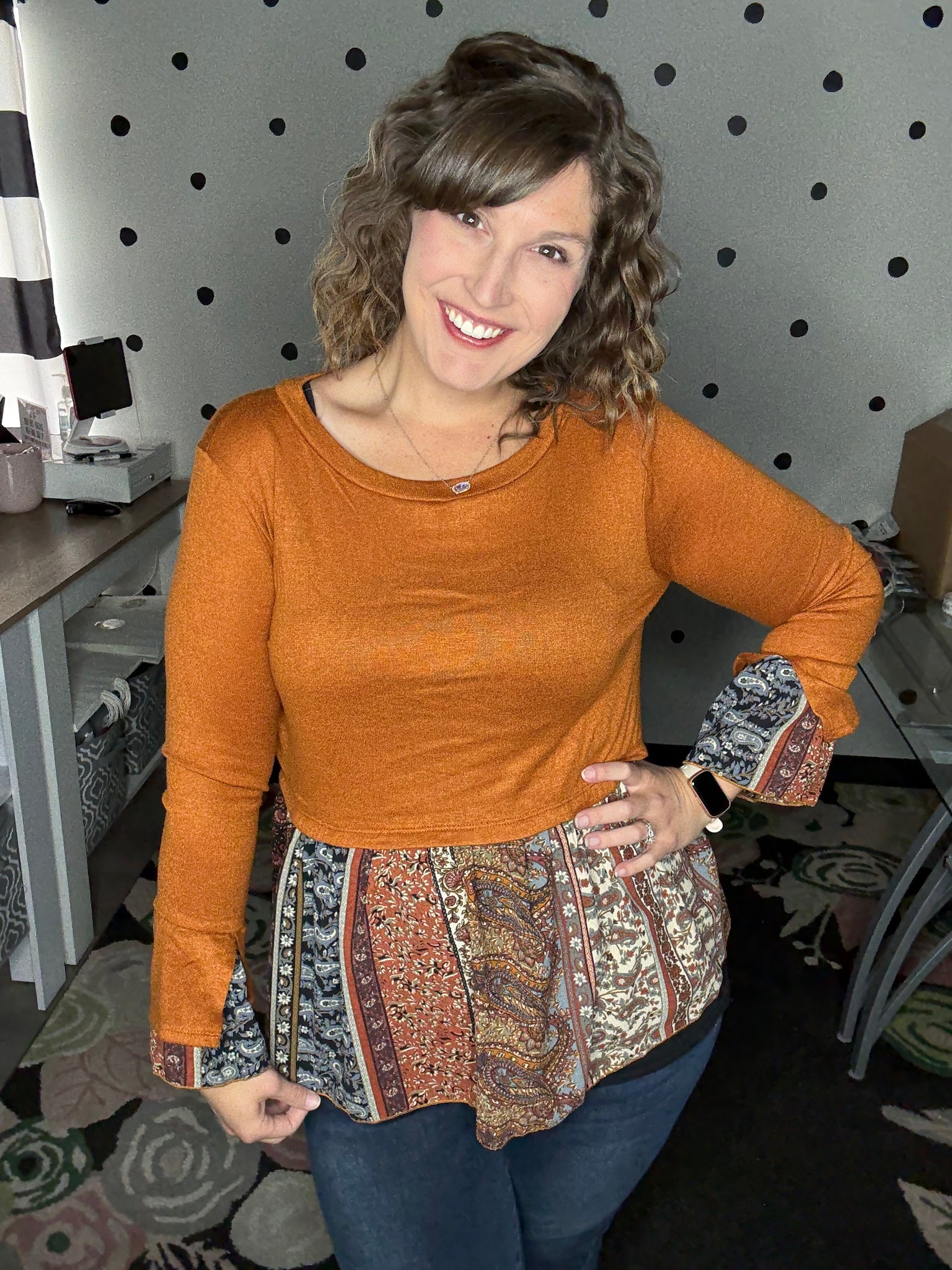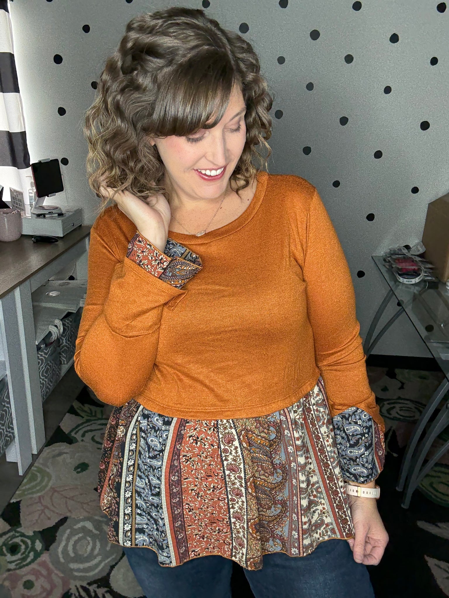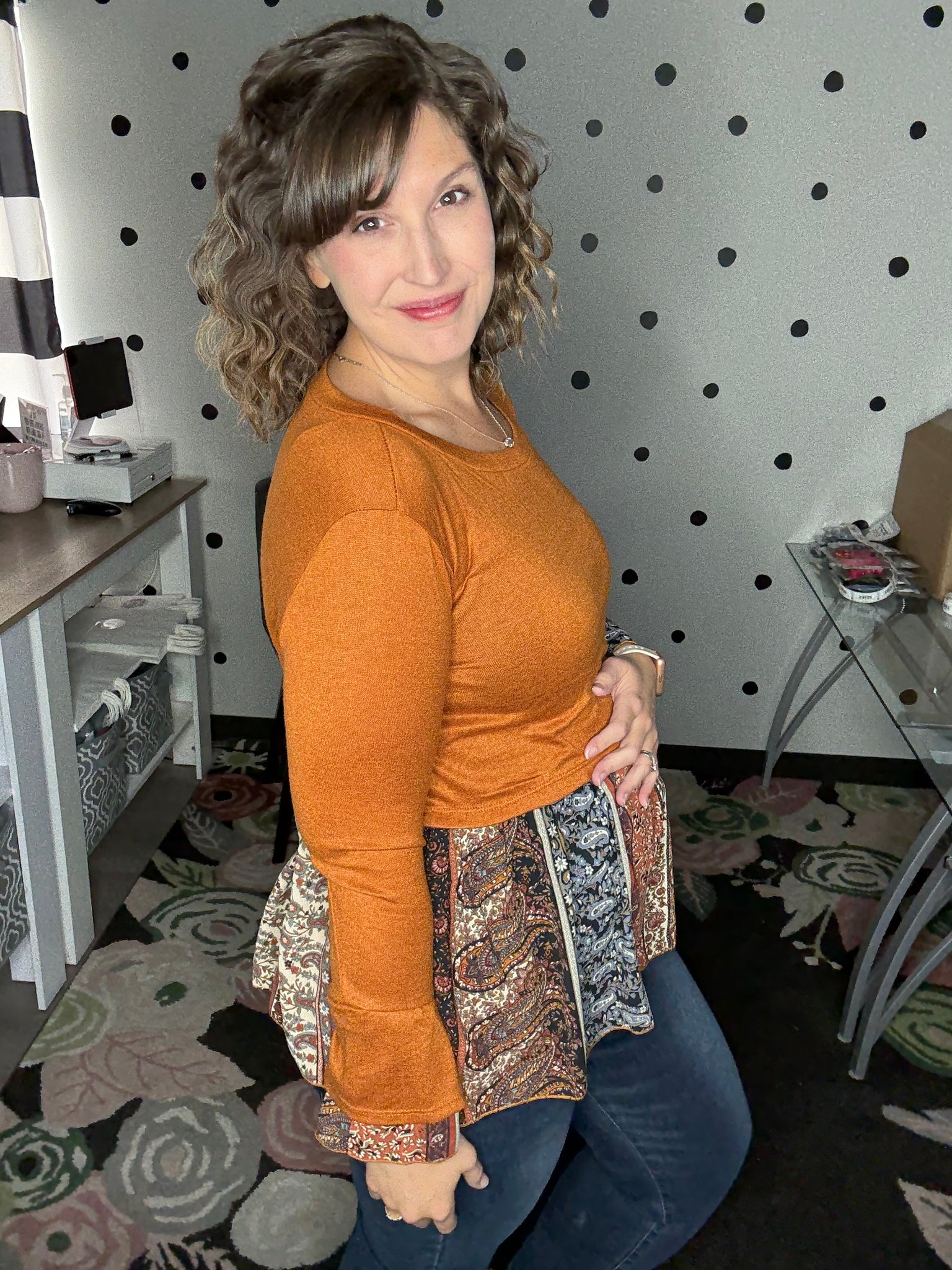 Soft brushed knit in a gorgeous rust color combined with a bohemian floral woven fabric - this babydoll style top features a long sleeve with a twofer bell design. Fit and flare. True to size. Alyssa is wearing a medium here.