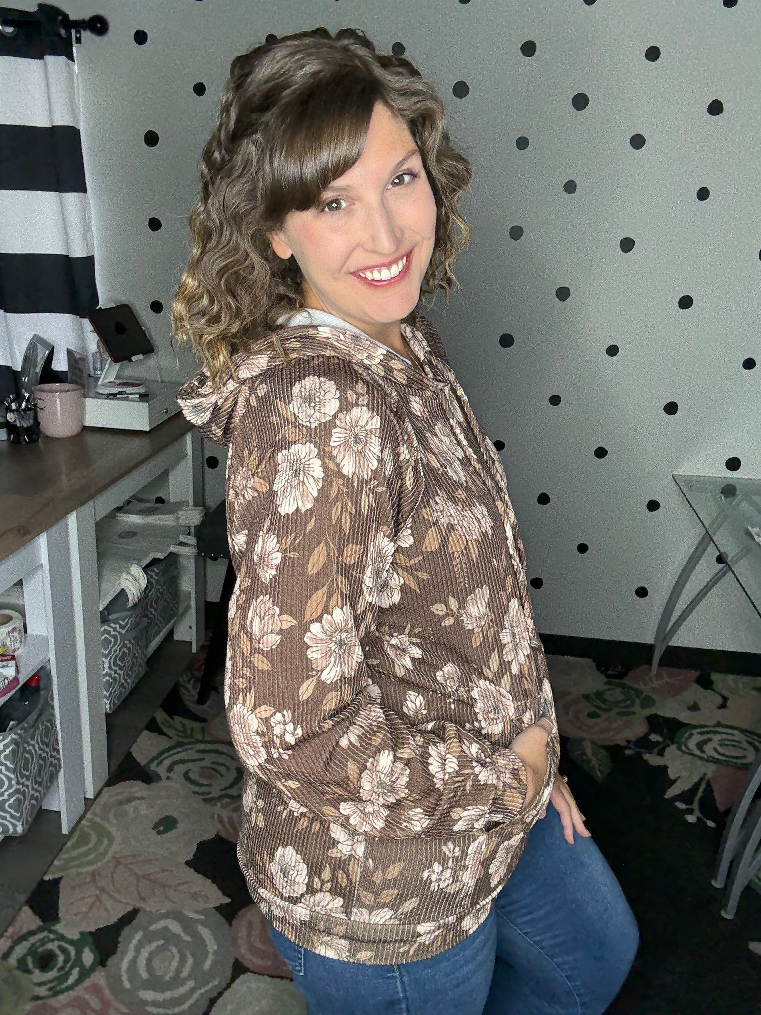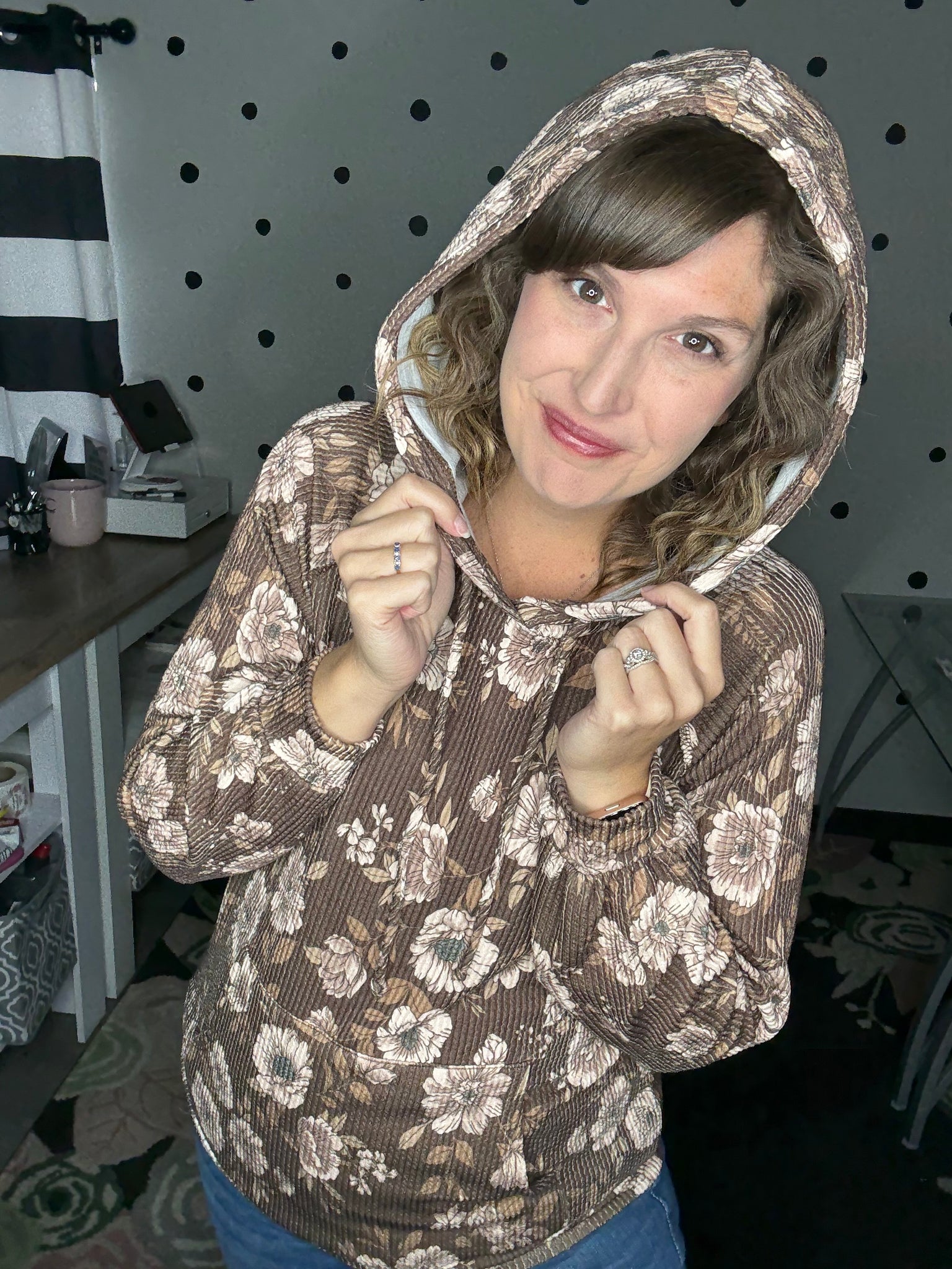 Gorgeous brown floral printed on a urban ribbed knit fabric, this one of a kind hoodie is soft and stylish! Long sleeves and a kangaroo pocket. This sweatshirt is relaxed fit. Alyssa is wearing her true size of a medium here.
