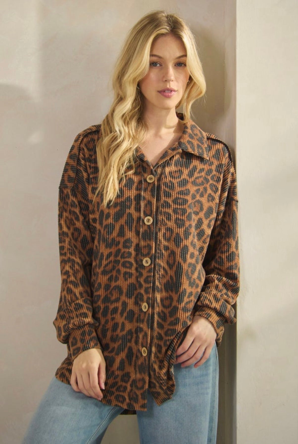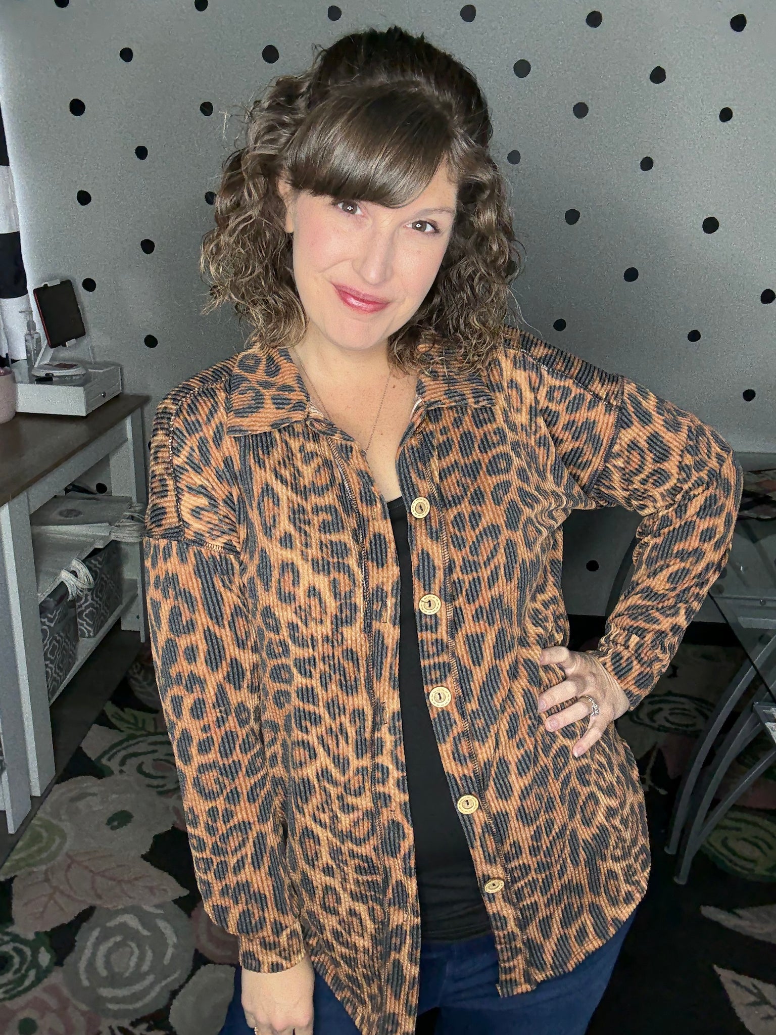 Classic brown leopard print on a stretchy and soft ribbed fabric. This button up shirt is long sleeved and true to size. Alyssa is wearing a medium here.
