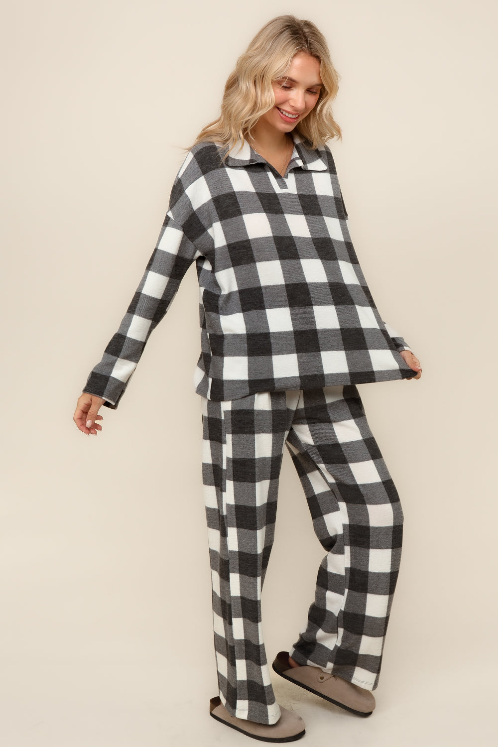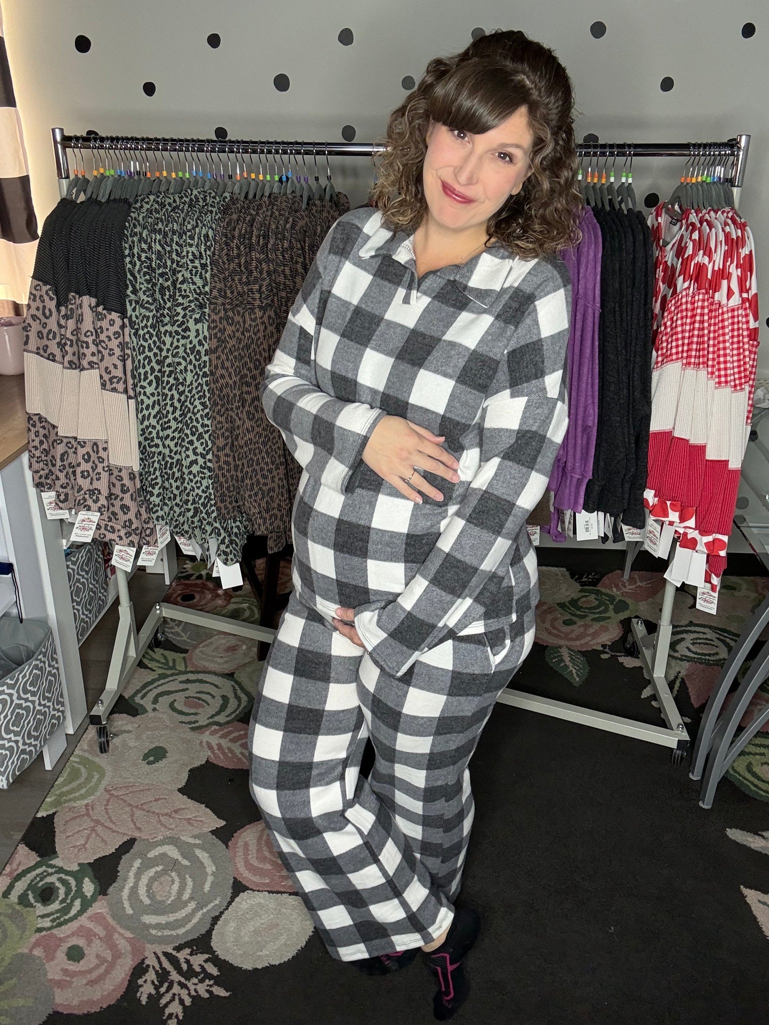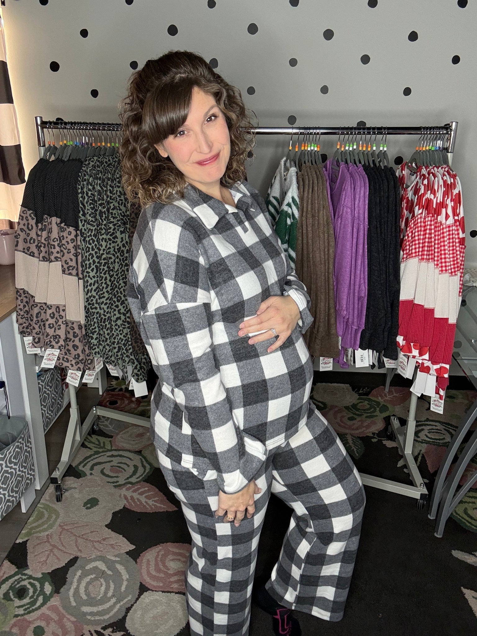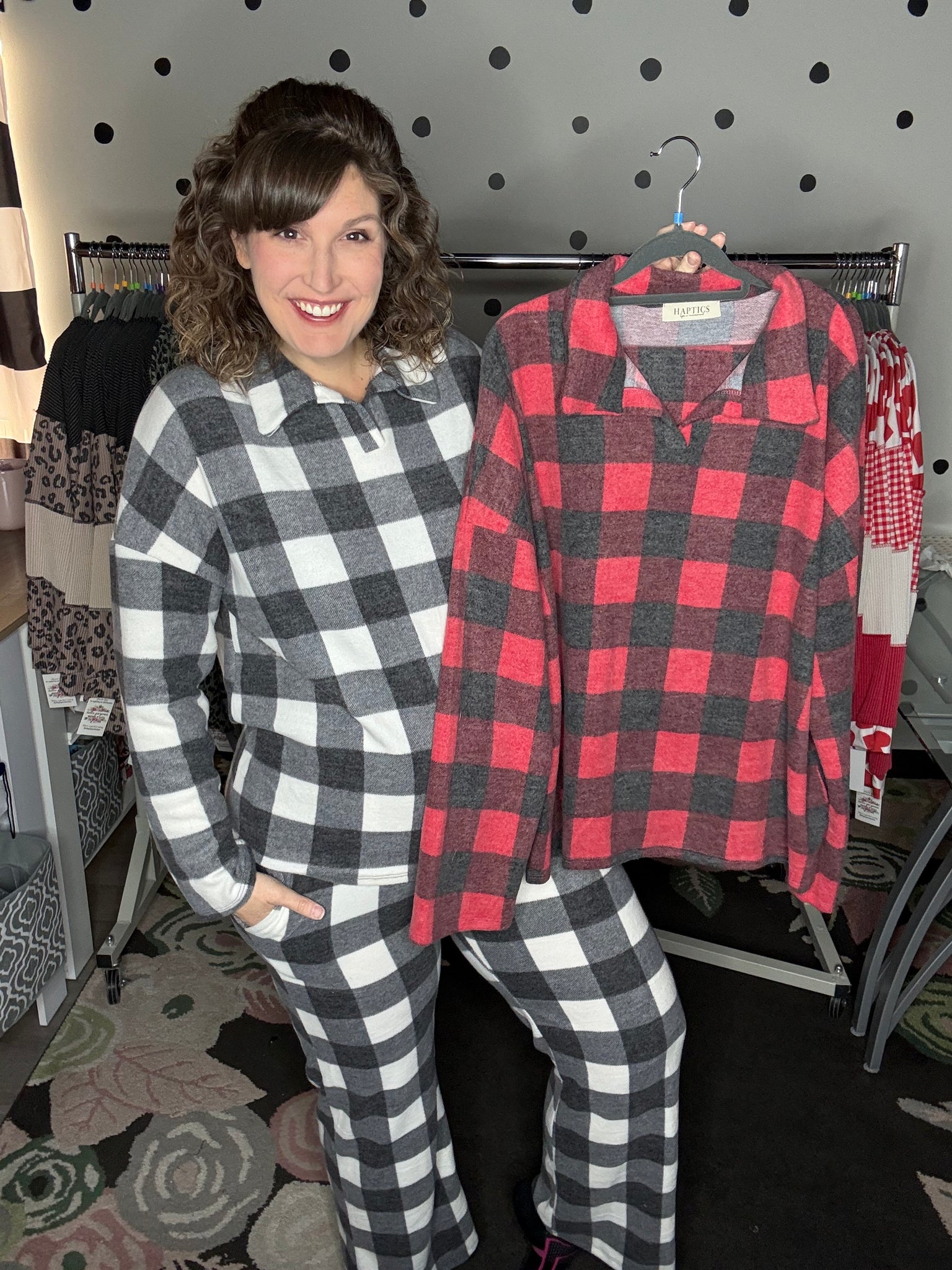 Stay cozy this season in your buffalo plaid pajamas! This matching top and bottom set features long sleeves, collared neckline, elastic waistband, and side pockets. The fabric is a brushed knit and OH SO SOFT! The fit is true to size. Alyssa is wearing her normal loungewear size of a large here.