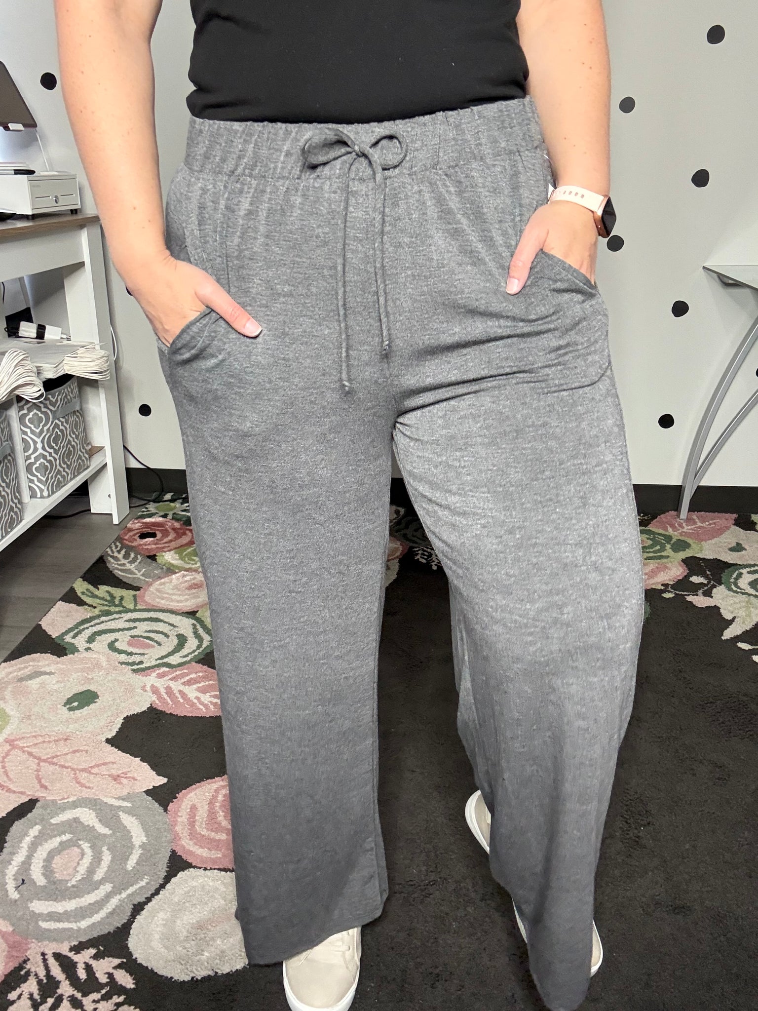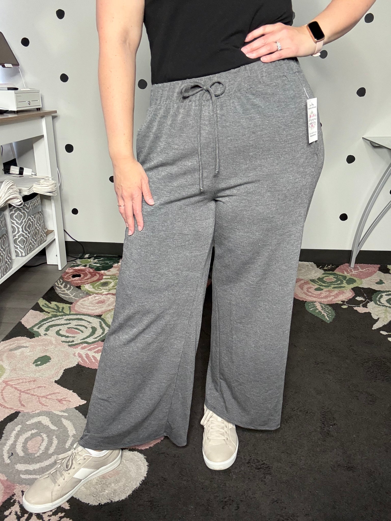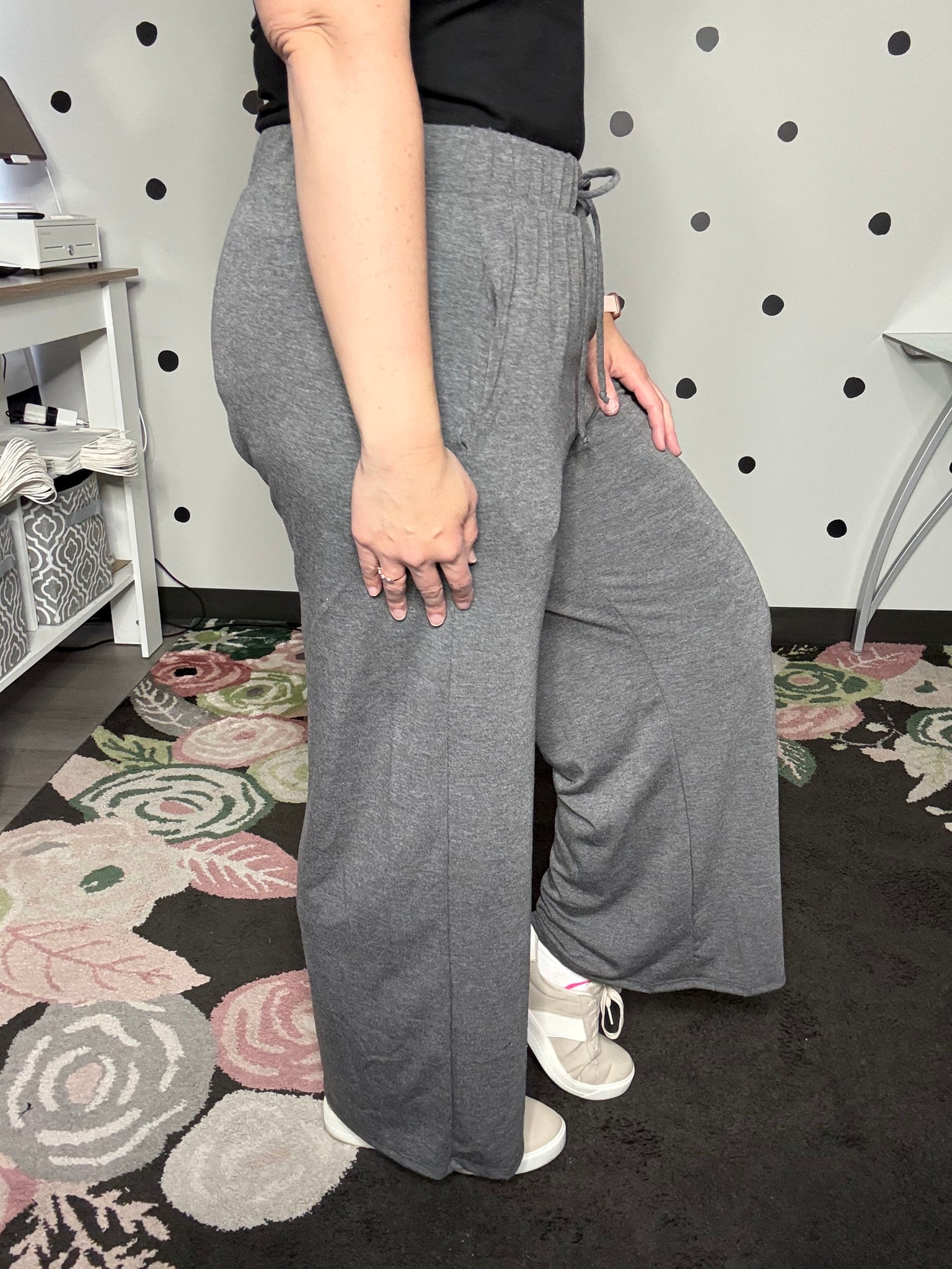 Charcoal grey wide leg pants with an elastic waist and side pockets. These pants can easily be worn casual or dressy depending on how you style them! The fabric is french terry 70% polyester 26% rayon 4% spandex. The fit is true to size. Alyssa is wearing the medium.