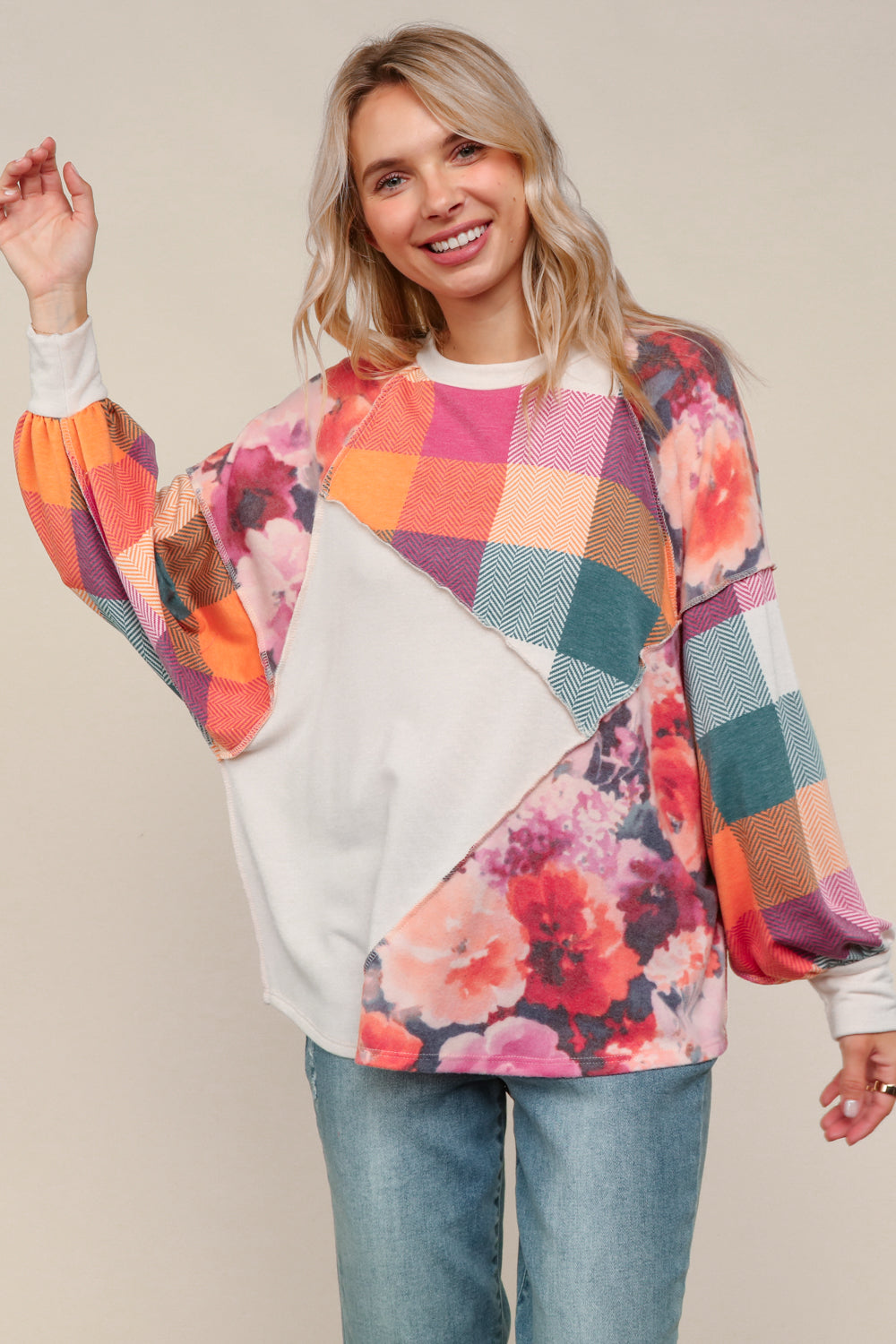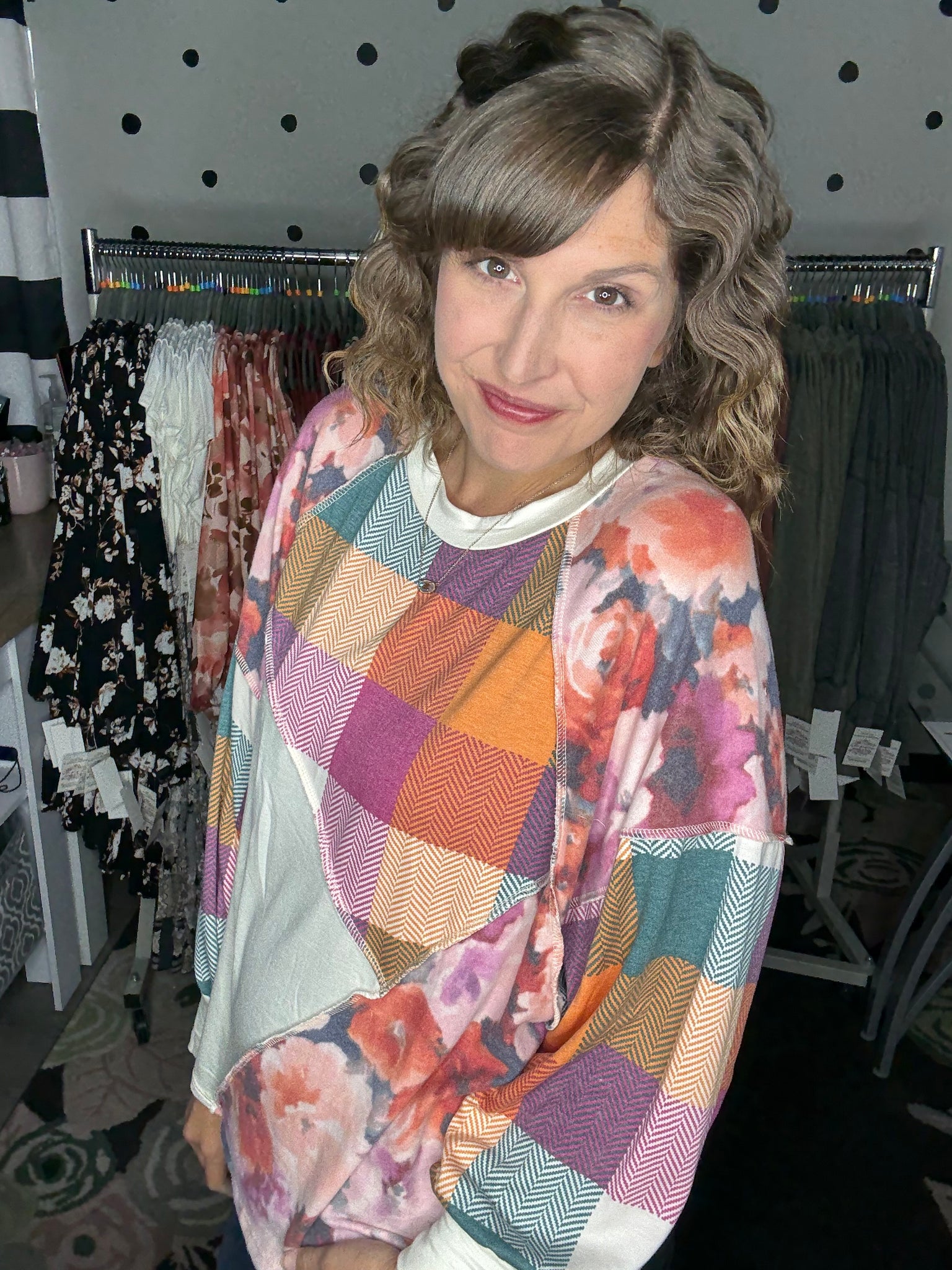Magenta checkered, floral, and ivory color blocked top with an asymmetrical design. Long sleeves and crew neckline. French terry knit. 62% polyester 34% rayon 4% spandex. The fit is very relaxed. Alyssa sized down to a small in this style.