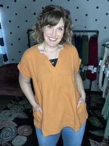 Super trendy and super soft -- these raw edge gauze tunics are made from 100% cotton. Available in 6 colors. Short sleeved, v-neck, very generous in size. Alyssa is sized down to the small here.