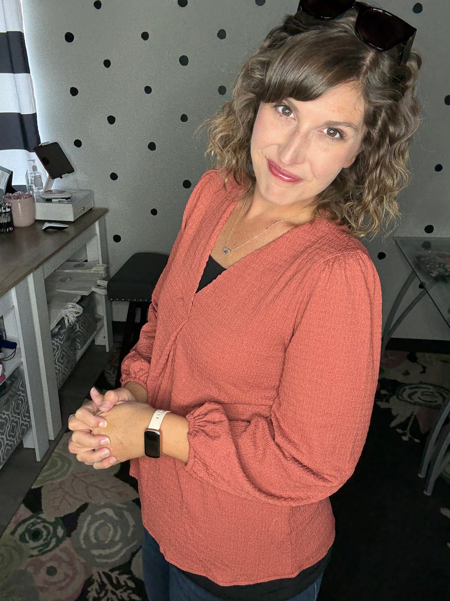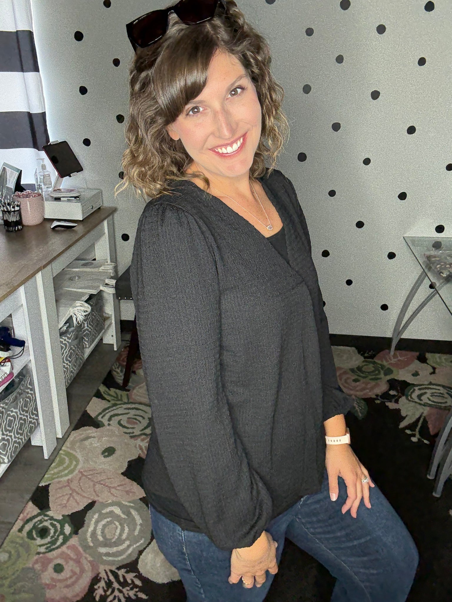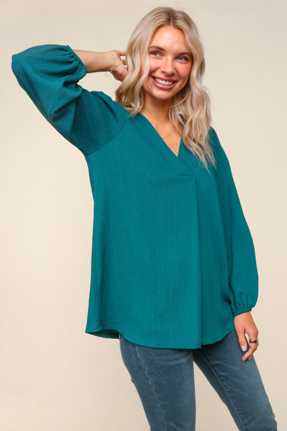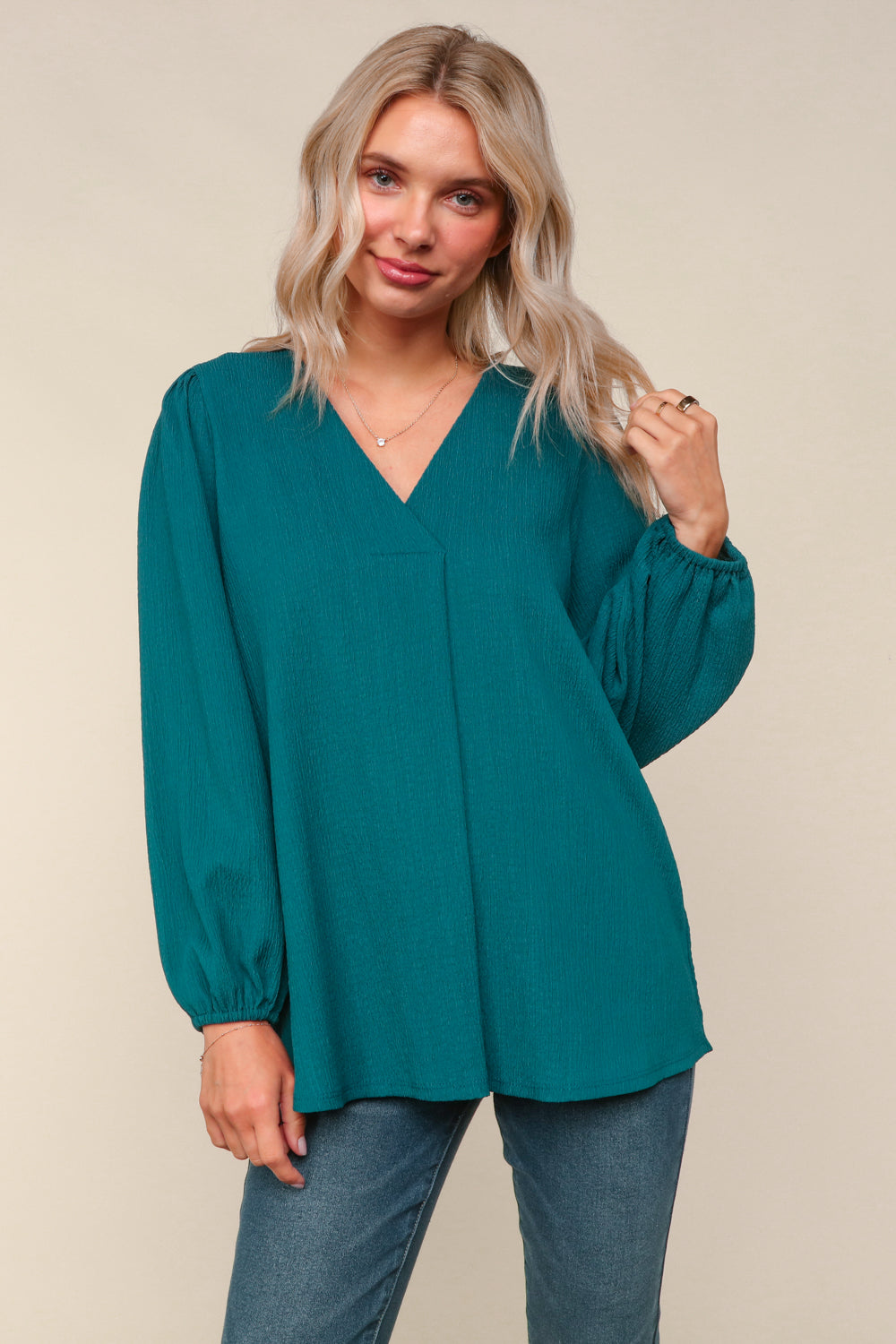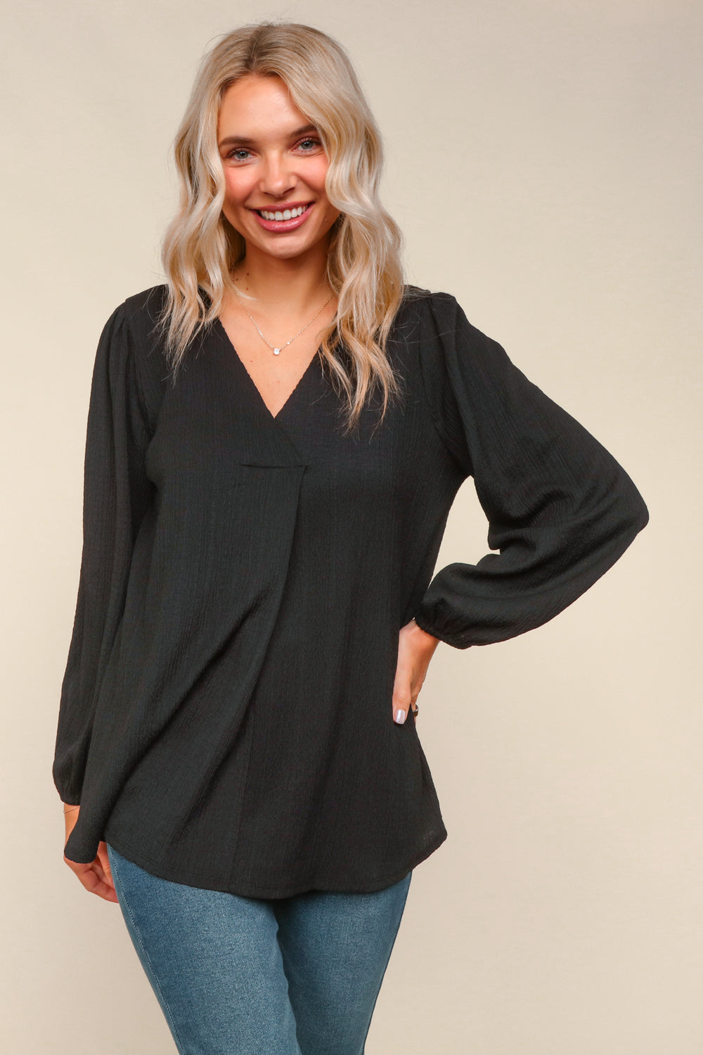 3 solid colors available in this textured woven blouse - this top features a v-neck and a elastic long sleeve. 95% polyester 5% spandex. The fit is true to size. Alyssa is wearing the medium here.