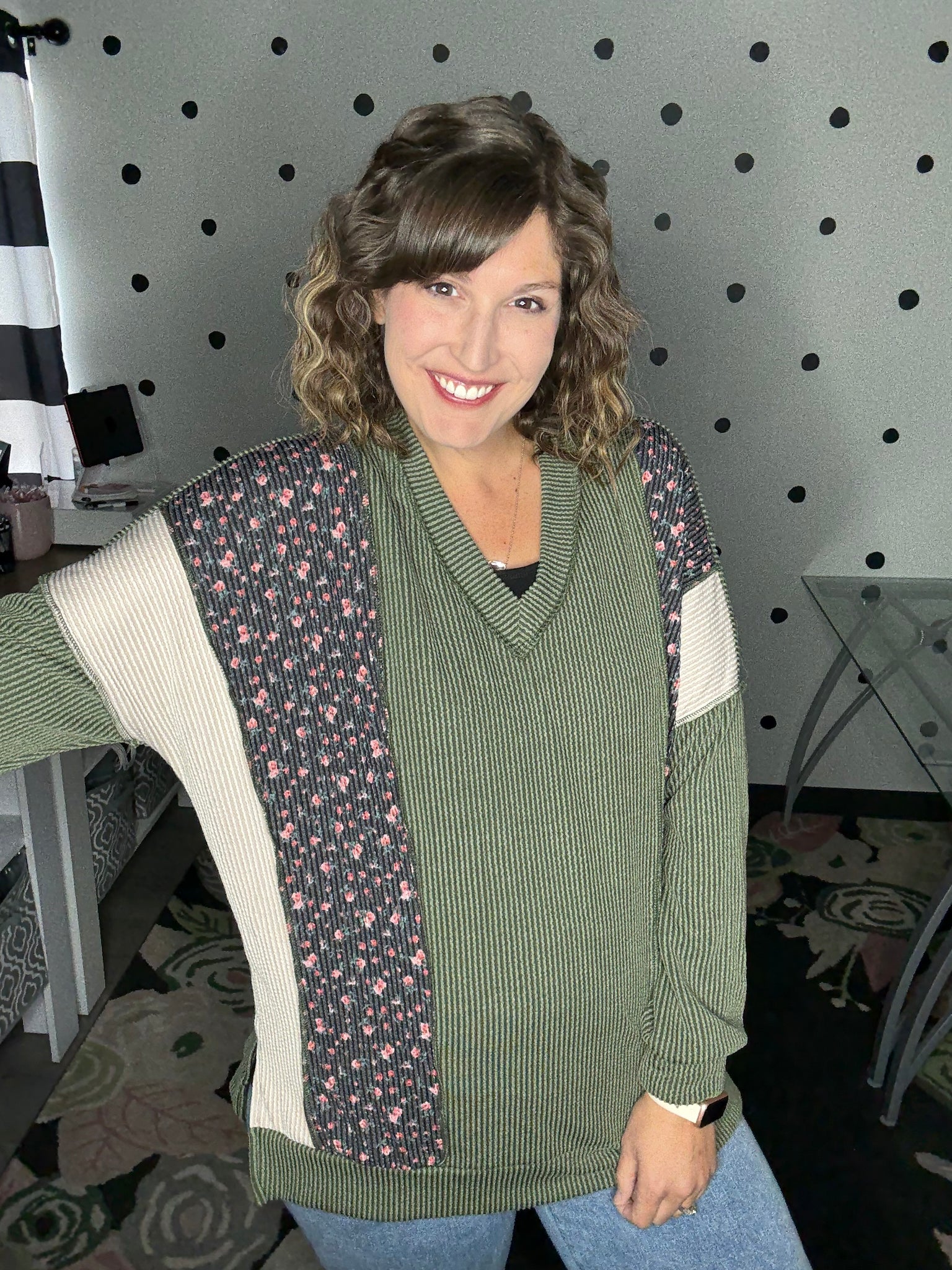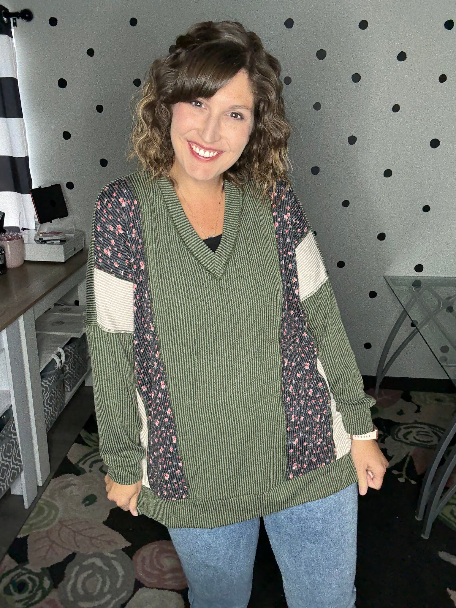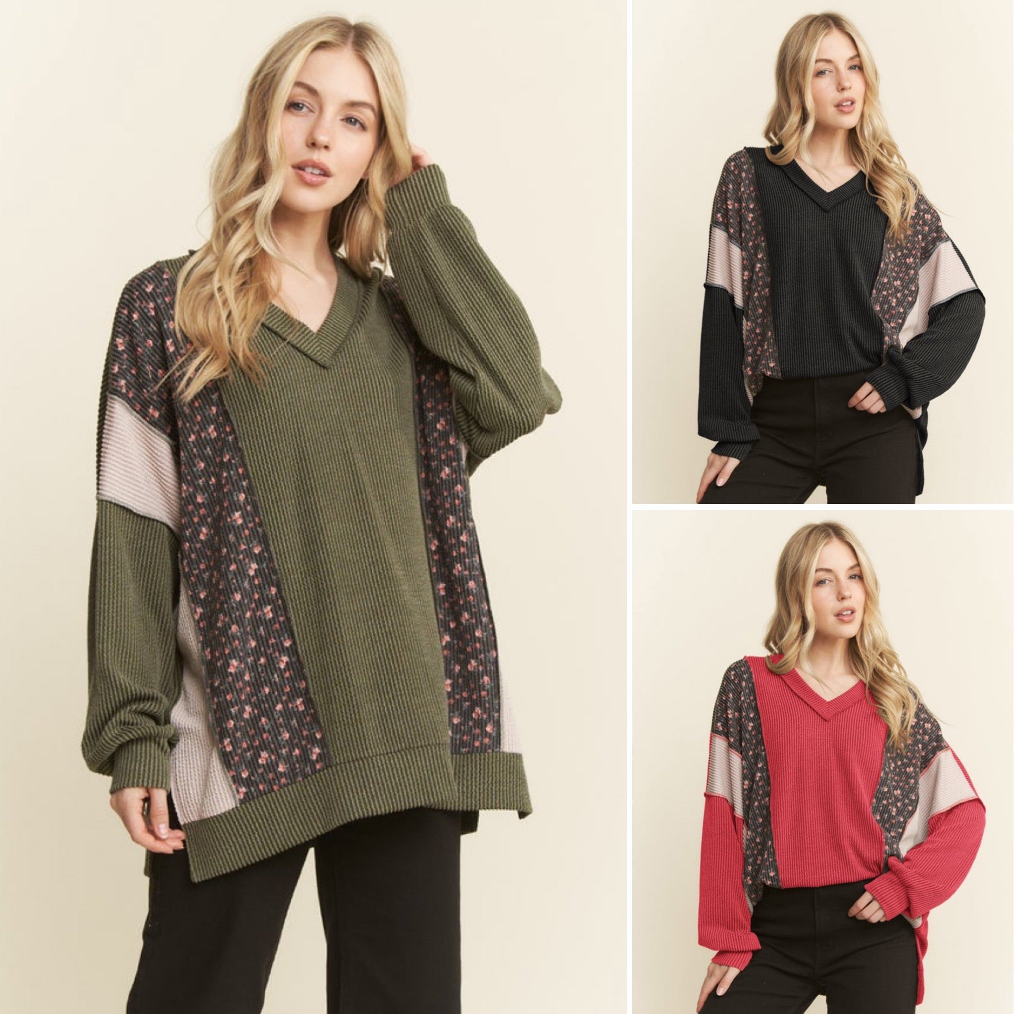 Solid black, red or olive pairs with a floral print and a cream in this color block design. This long sleeve tunic is OVERSIZED and features a v-neckline as well as ribbed knit fabric. Alyssa is shown wearing her true size of a medium here to feature the GENEROUS fit of this style. Ladies who prefer a more true to size fit should size down one.