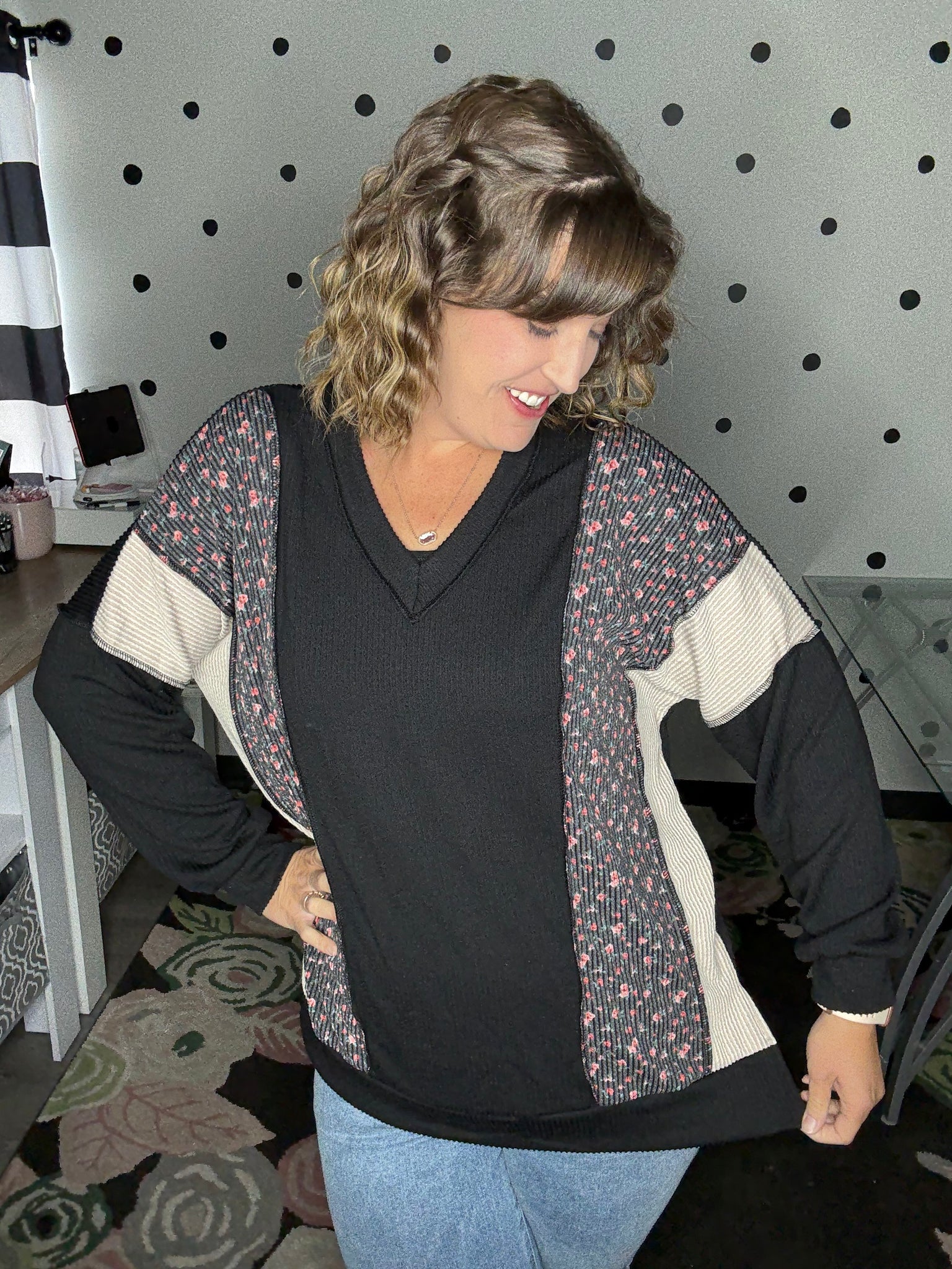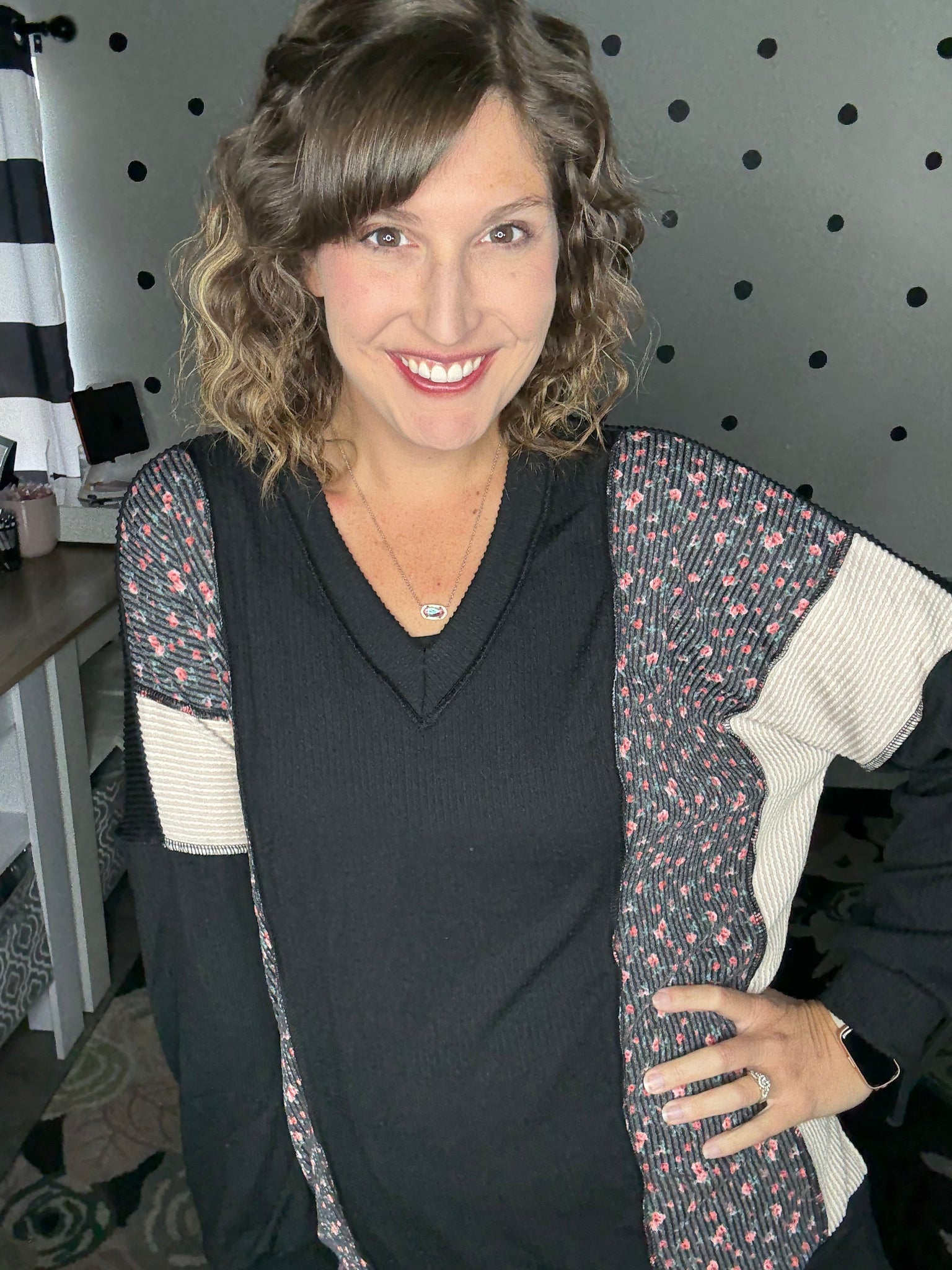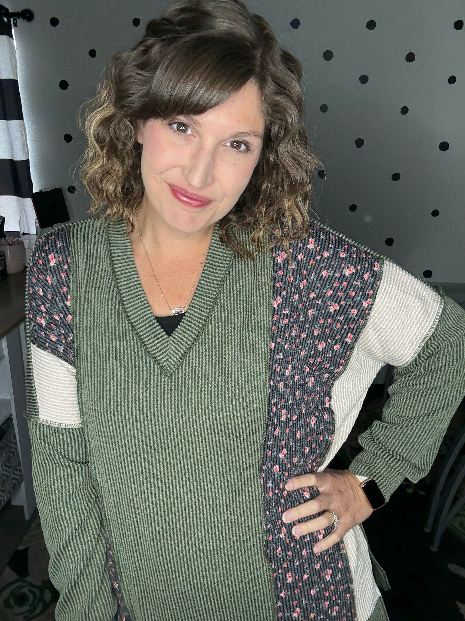 Solid black, red or olive pairs with a floral print and a cream in this color block design. This long sleeve tunic is OVERSIZED and features a v-neckline as well as ribbed knit fabric. Alyssa is shown wearing her true size of a medium here to feature the GENEROUS fit of this style. Ladies who prefer a more true to size fit should size down one.