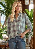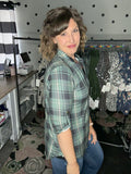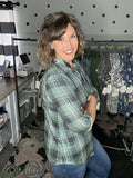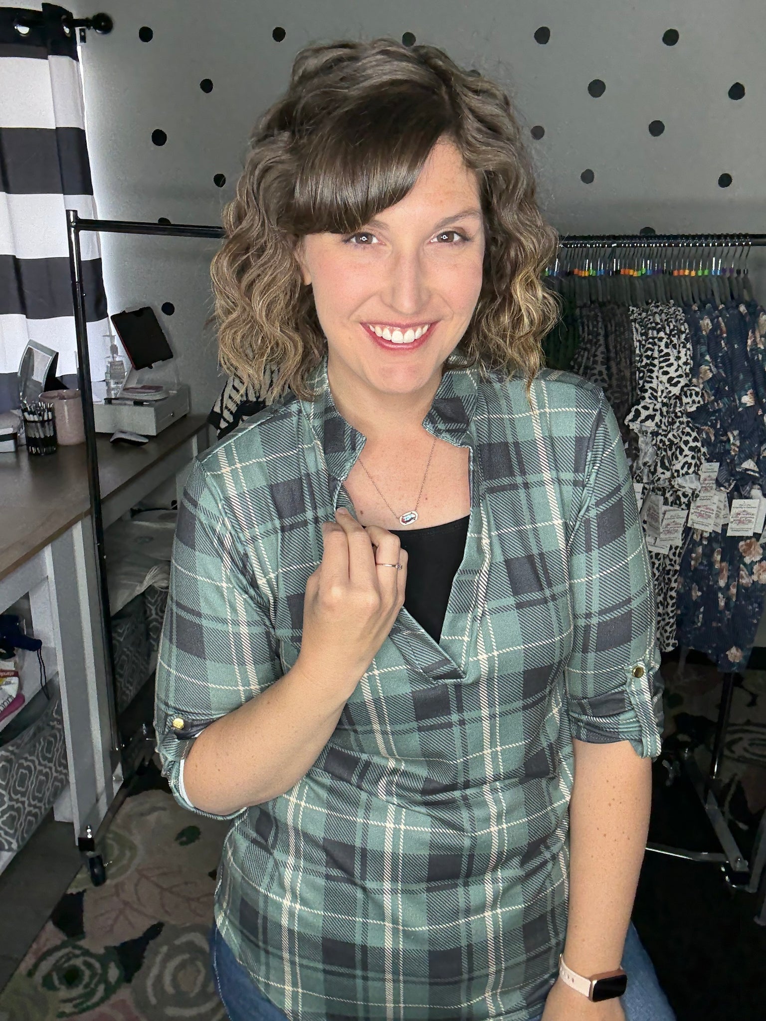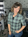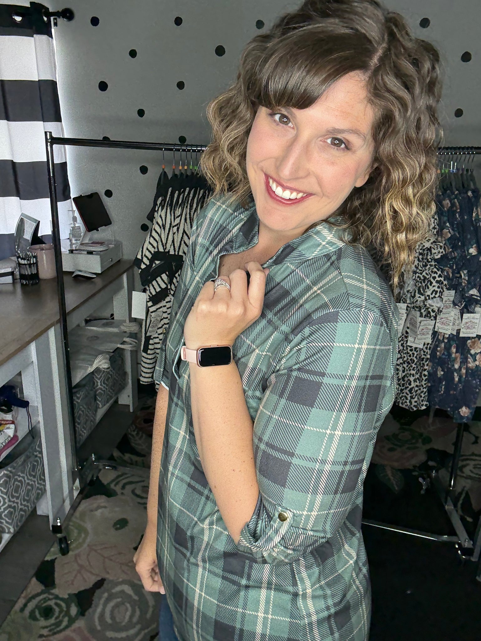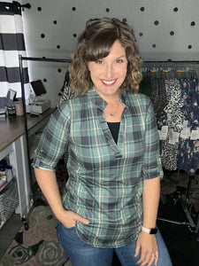 Green, navy and white plaid, this v-neck blouse features a half collared neckline and 3/4 length sleeves with faux buttons. The fabric is a super soft brushed knit. The fit is true to size. Alyssa is wearing a medium here.