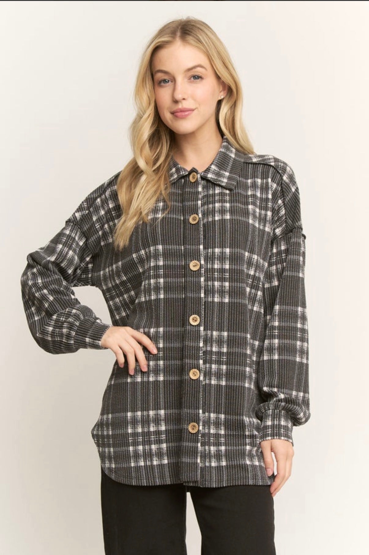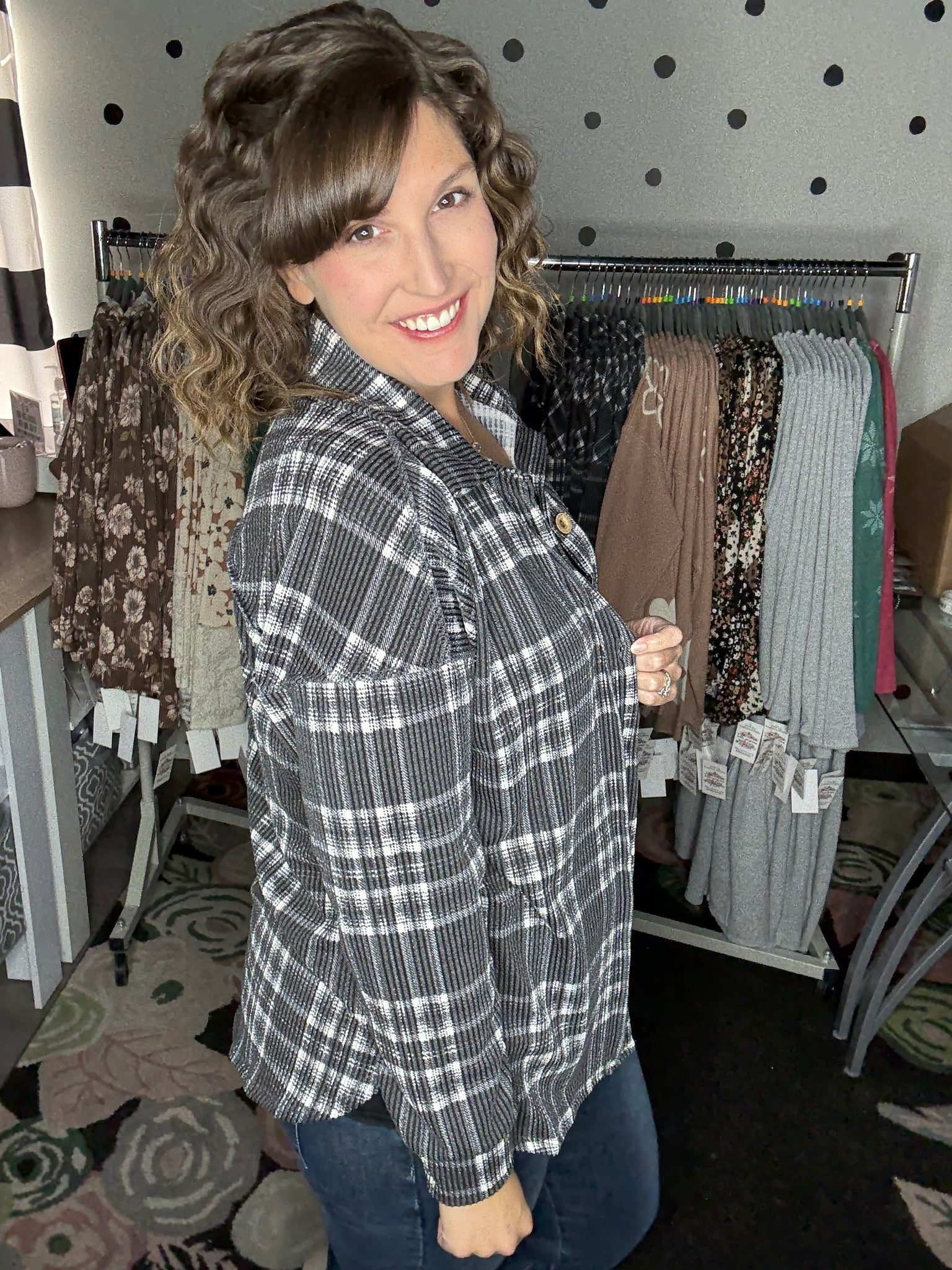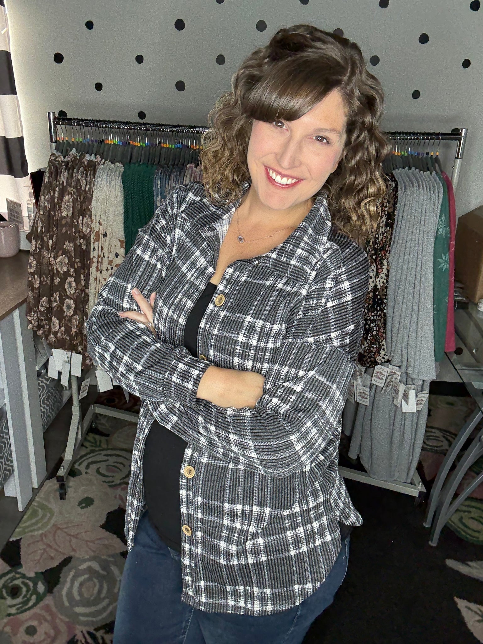 Black, charcoal, and ivory plaid print on a stretchy and soft ribbed fabric. This button up shirt is long sleeved and true to size. Alyssa is wearing a medium here.