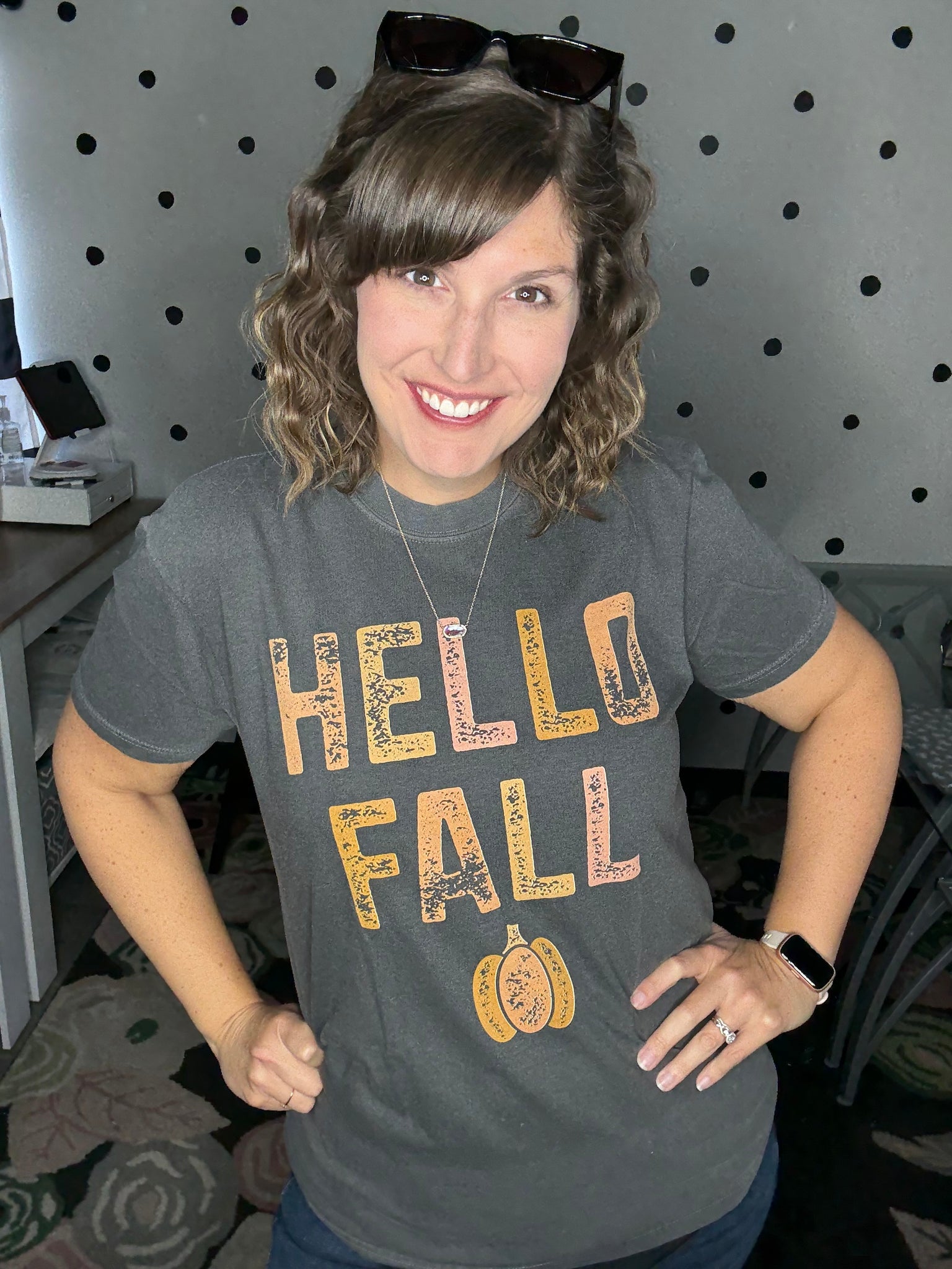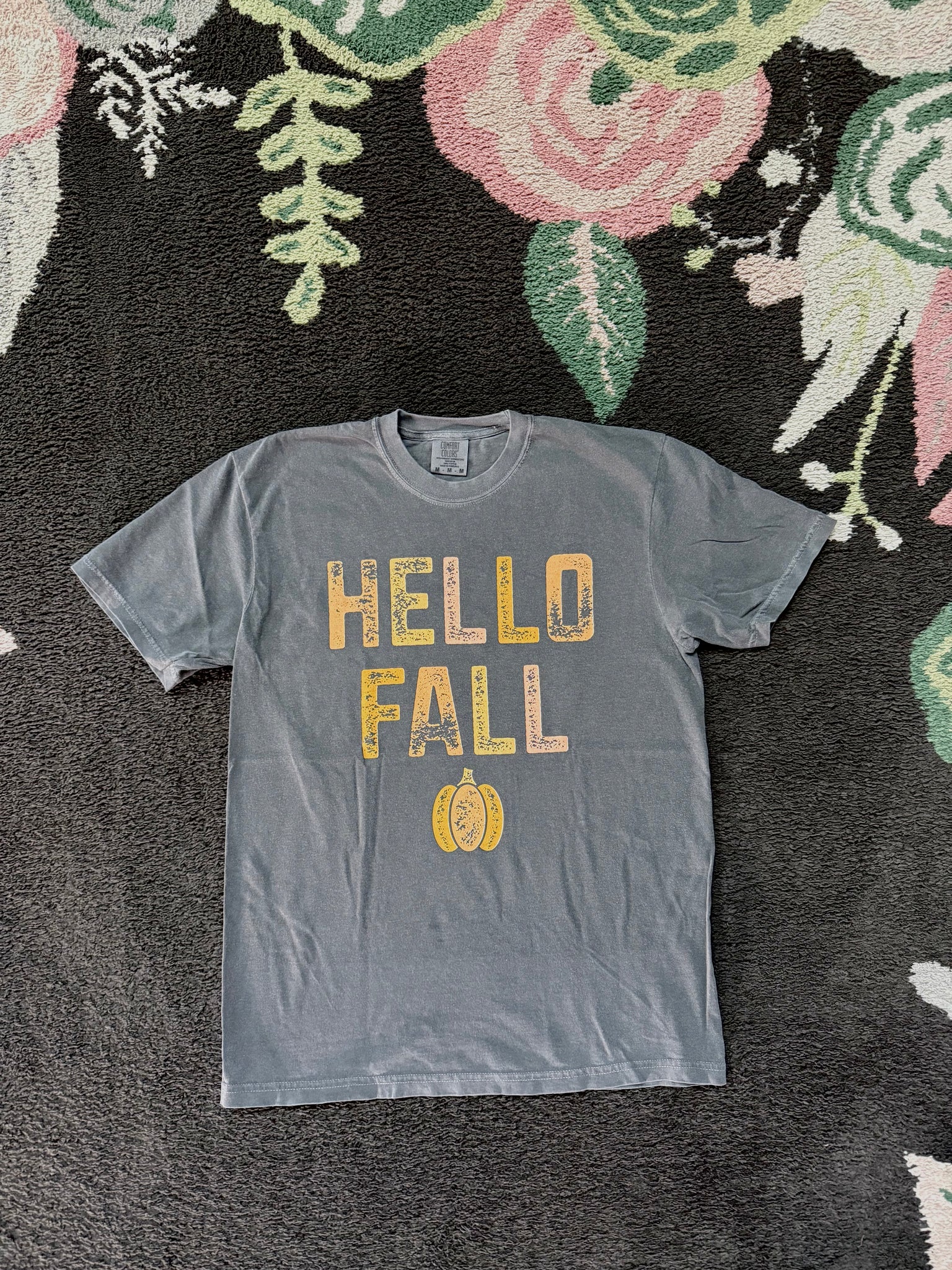 Hello Fall printed on a PEPPER Comfort Colors t-shirt. Unisex fit. True to size. 100% cotton.