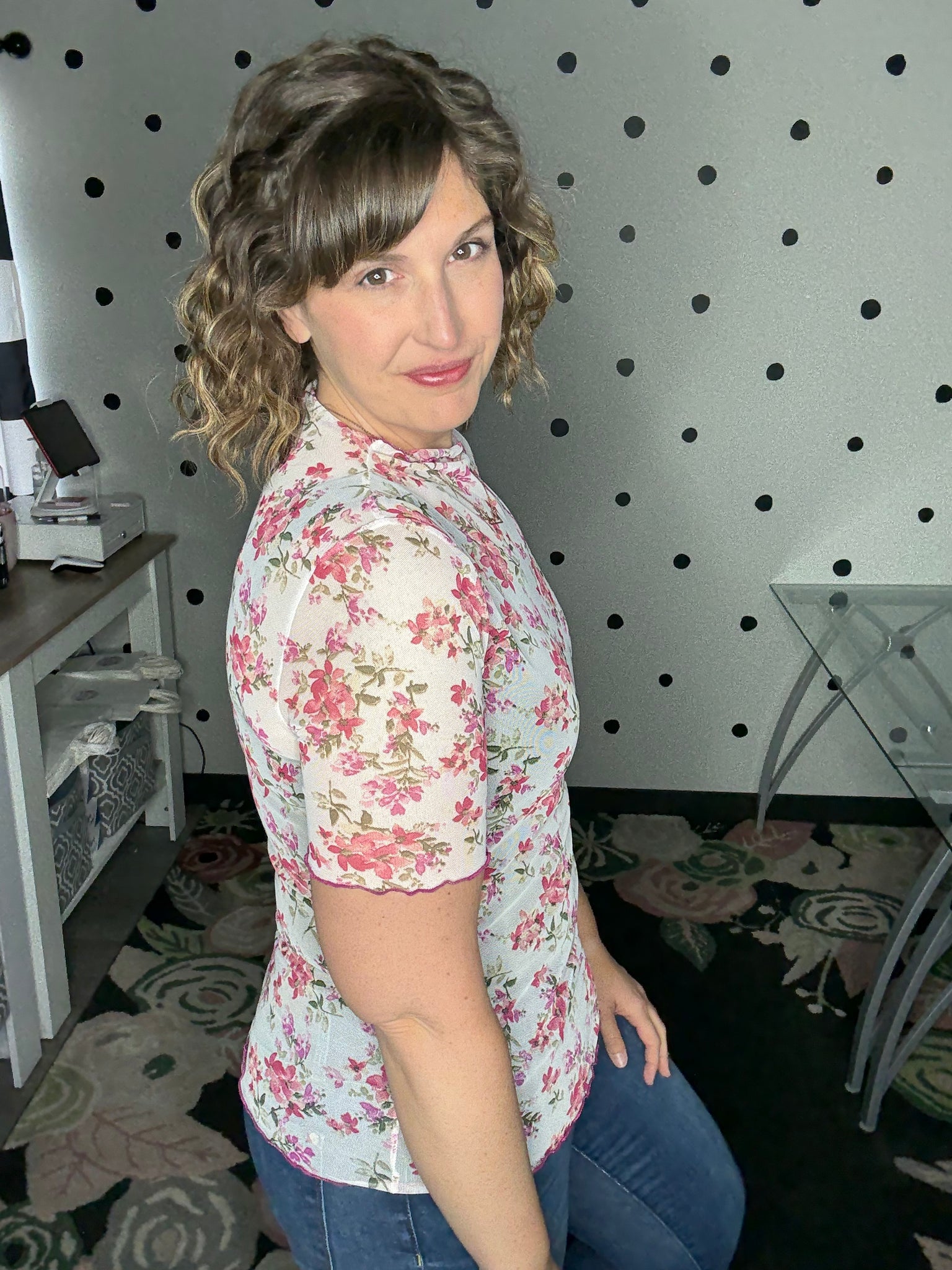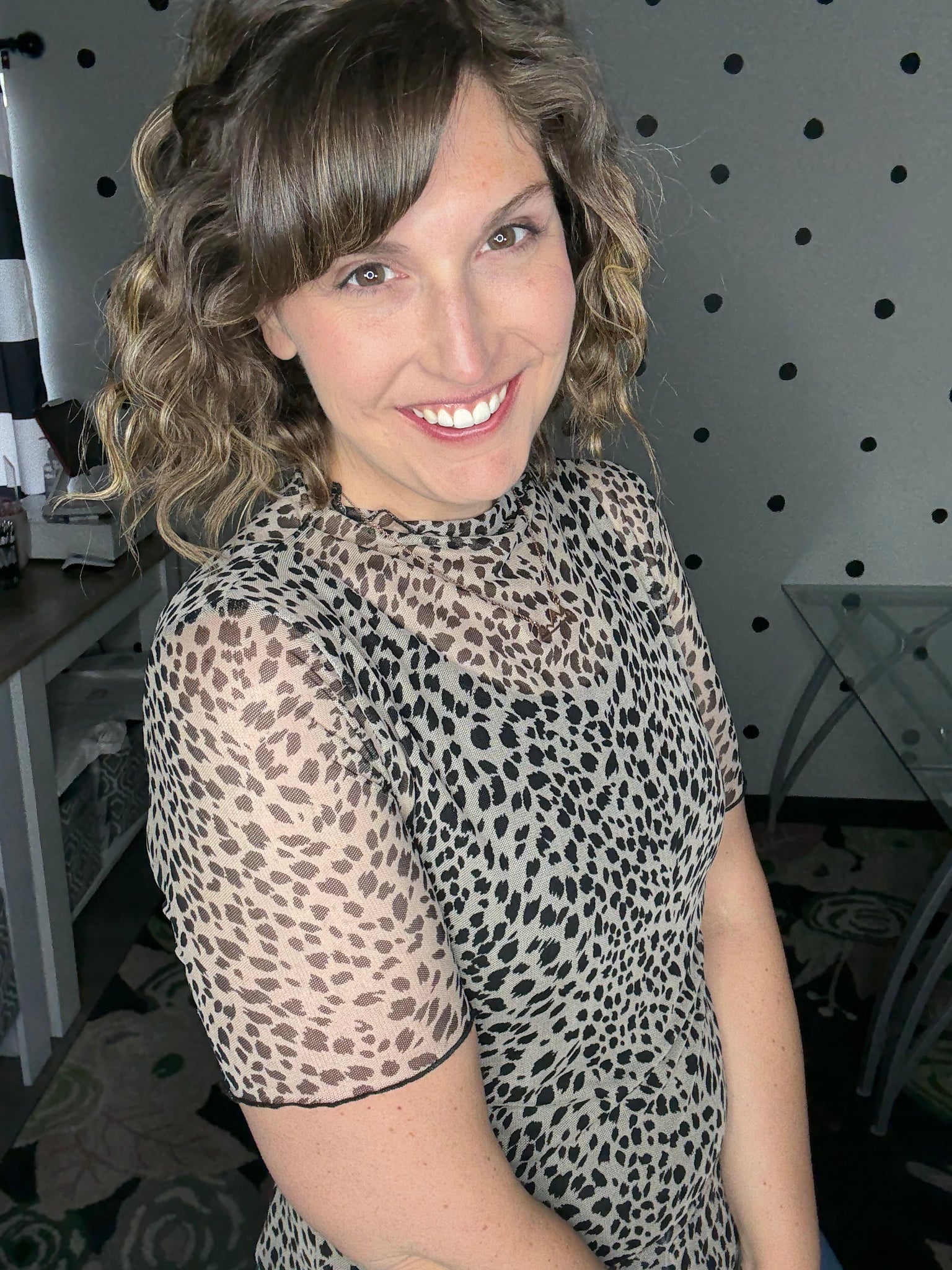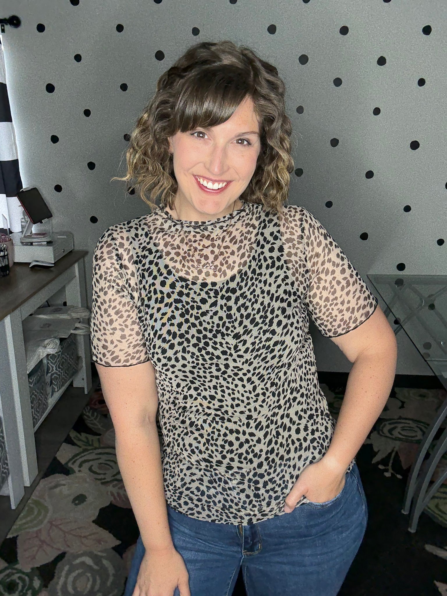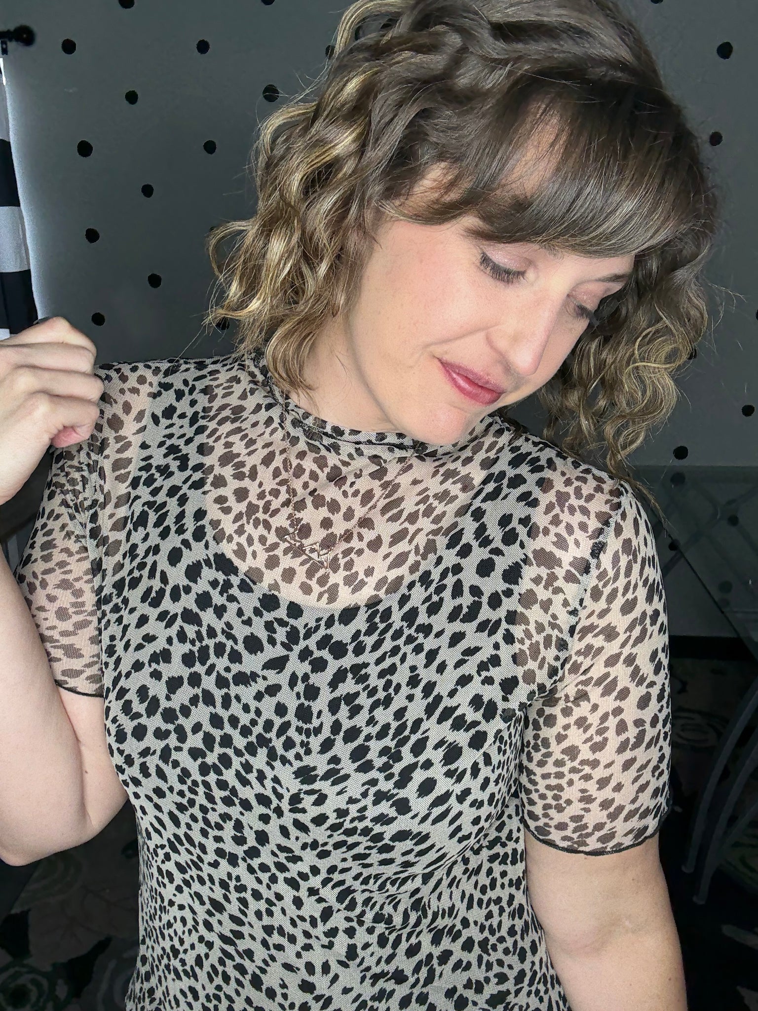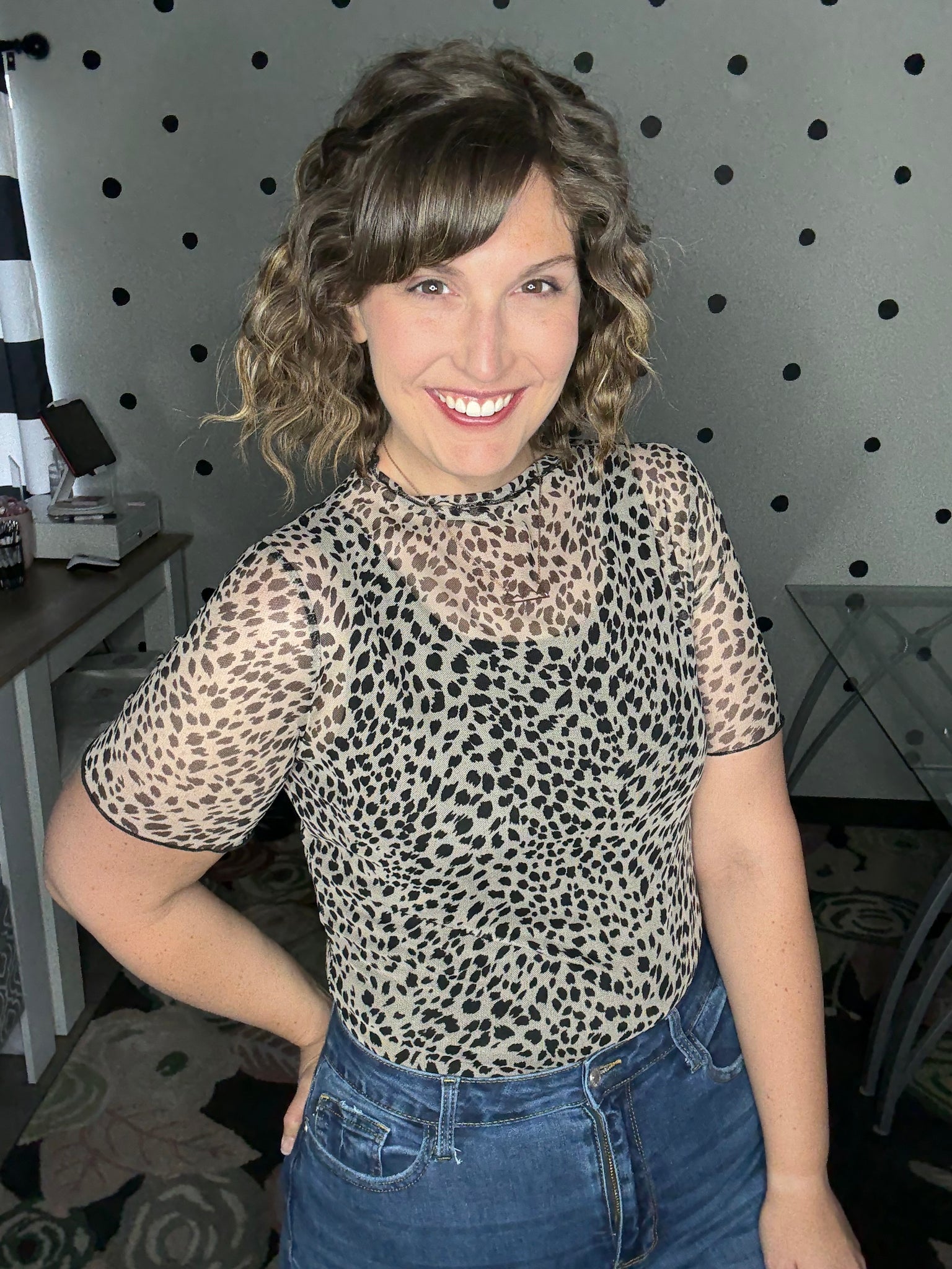 High neck short sleeve mesh top printed with FLORAL or LEOPARD. This layering piece is semi sheer but stretchy. You could wear something under it or over it. The fit is SLIM. Some ladies will prefer to size up. Alyssa is normally a medium and wearing the large here. 92% POLYESTER 8% SPANDEX