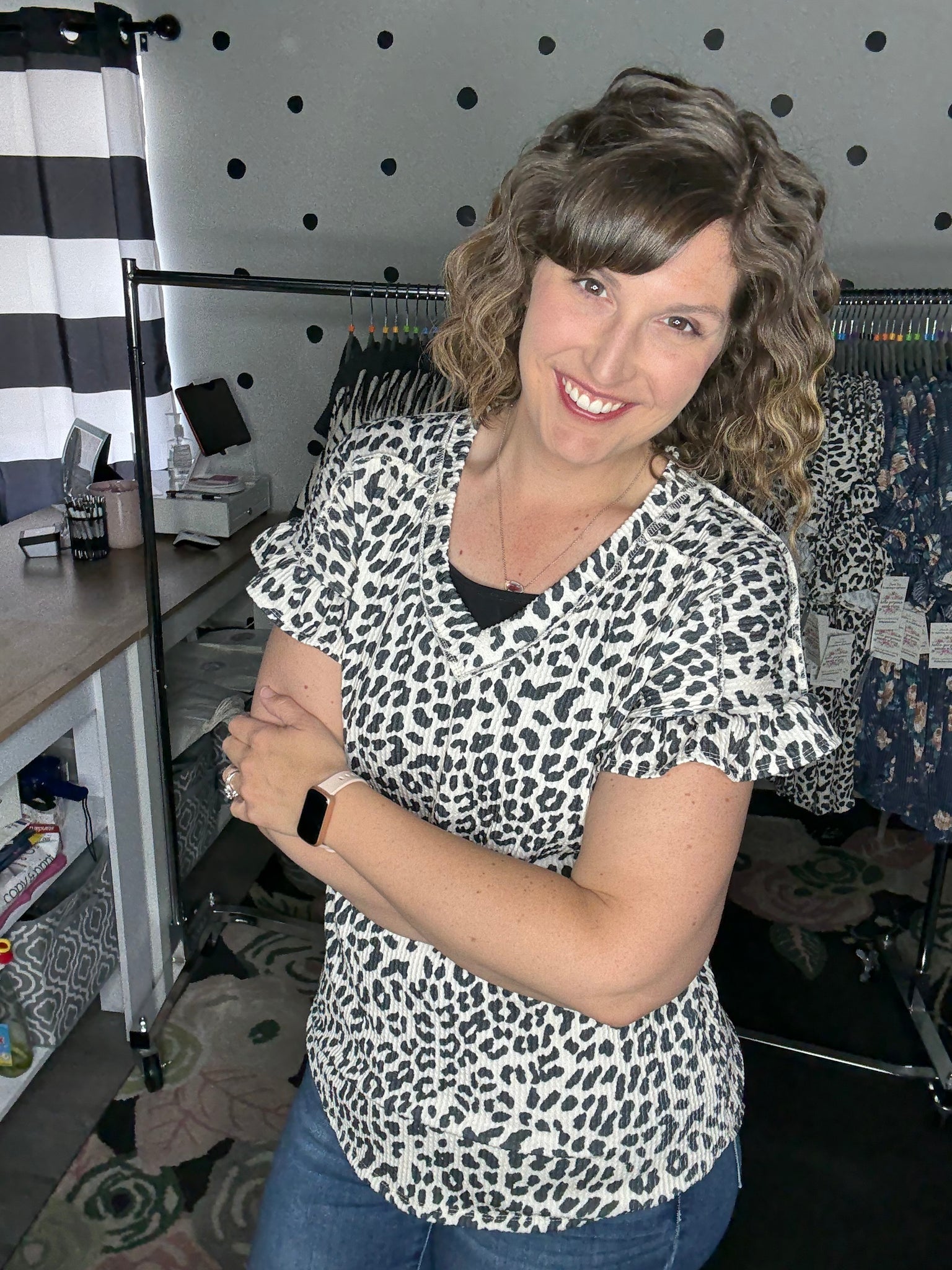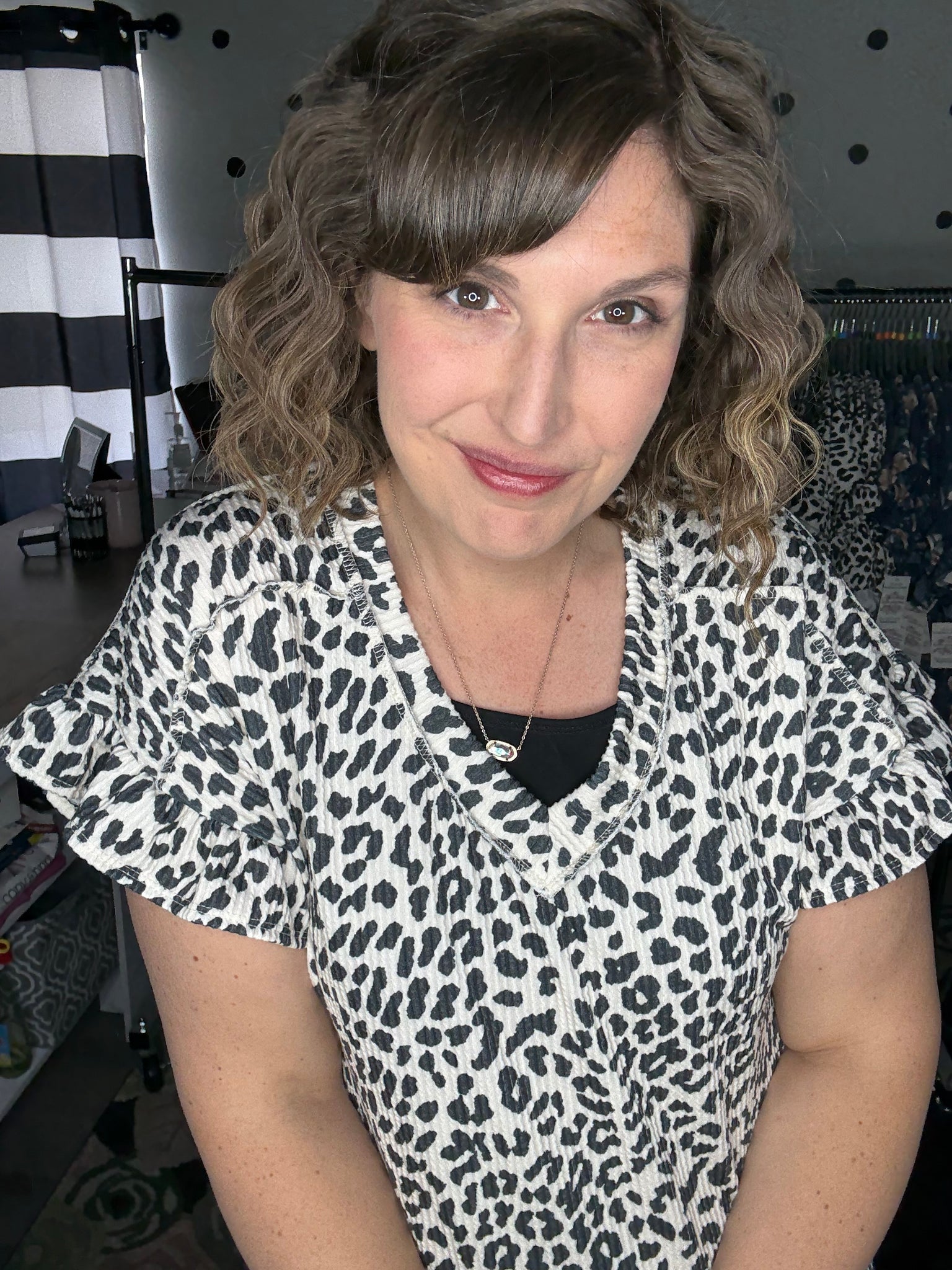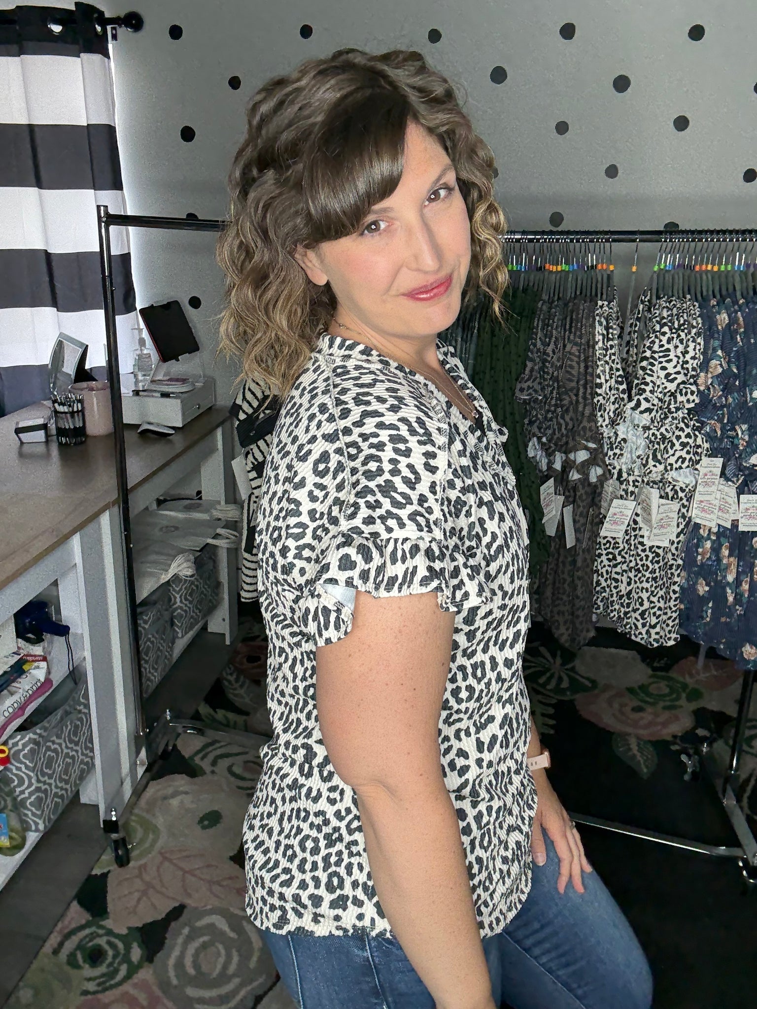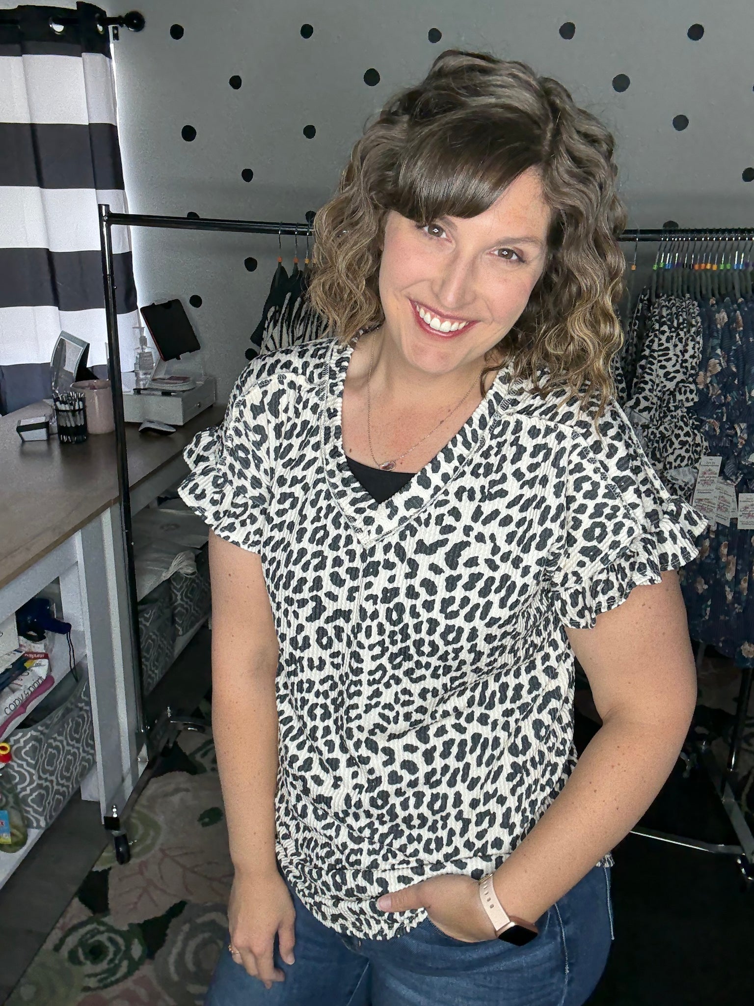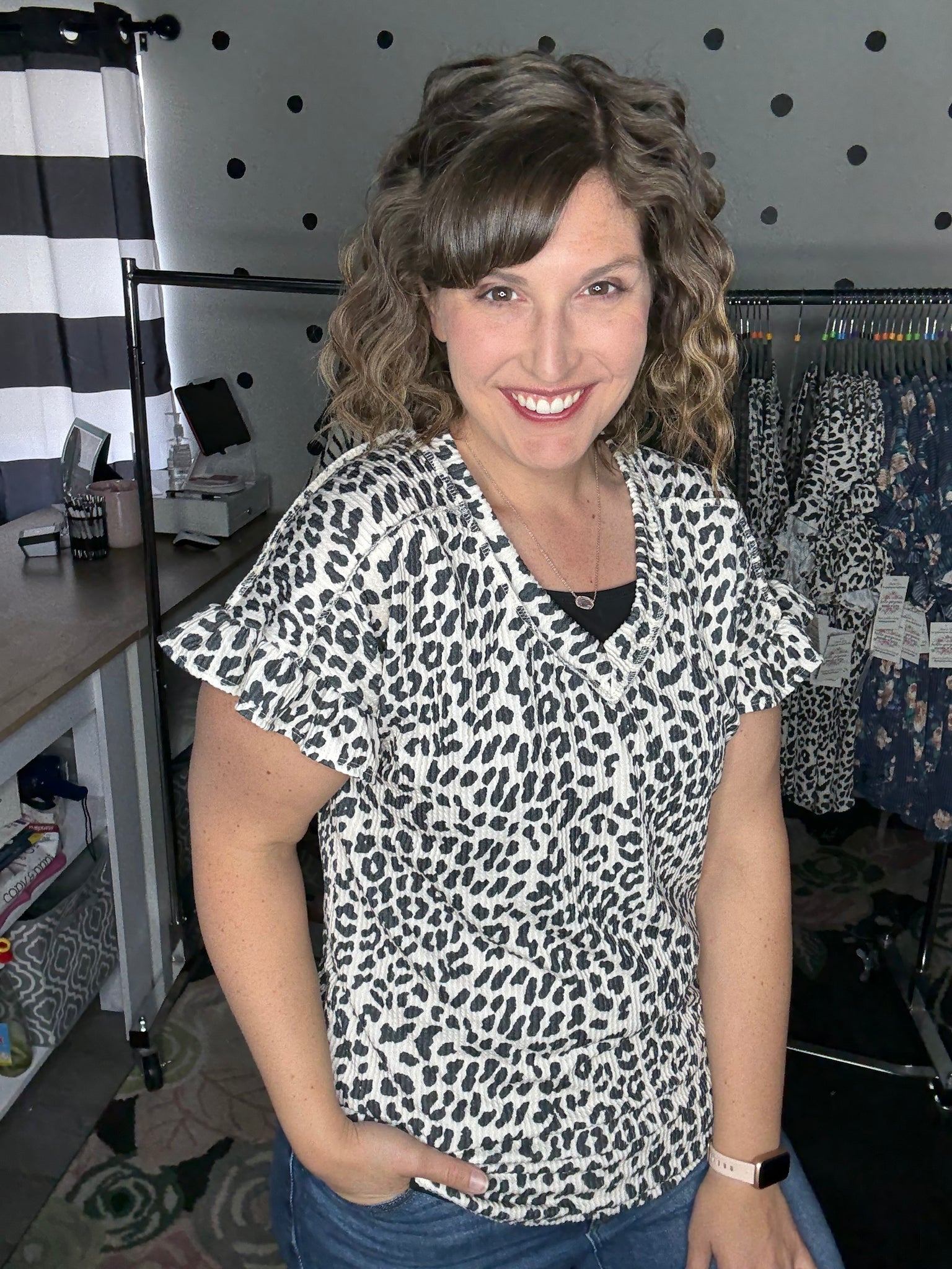 Ivory leopard print in a stretchy urban ribbed fabric. This v-neck top features short sleeves with a ruffle detail for that extra little flare. The fit is true to size. Alyssa is wearing a medium here.