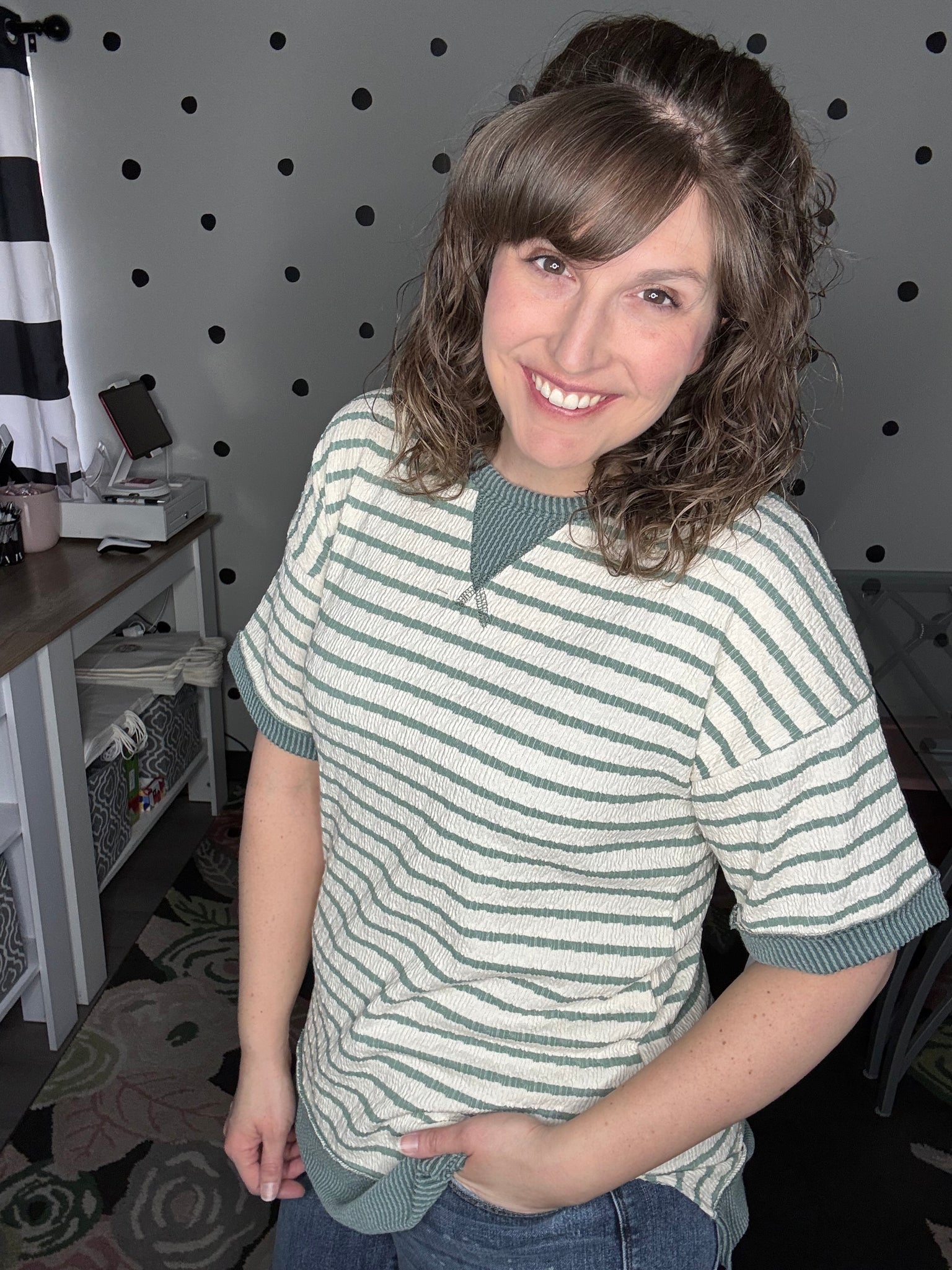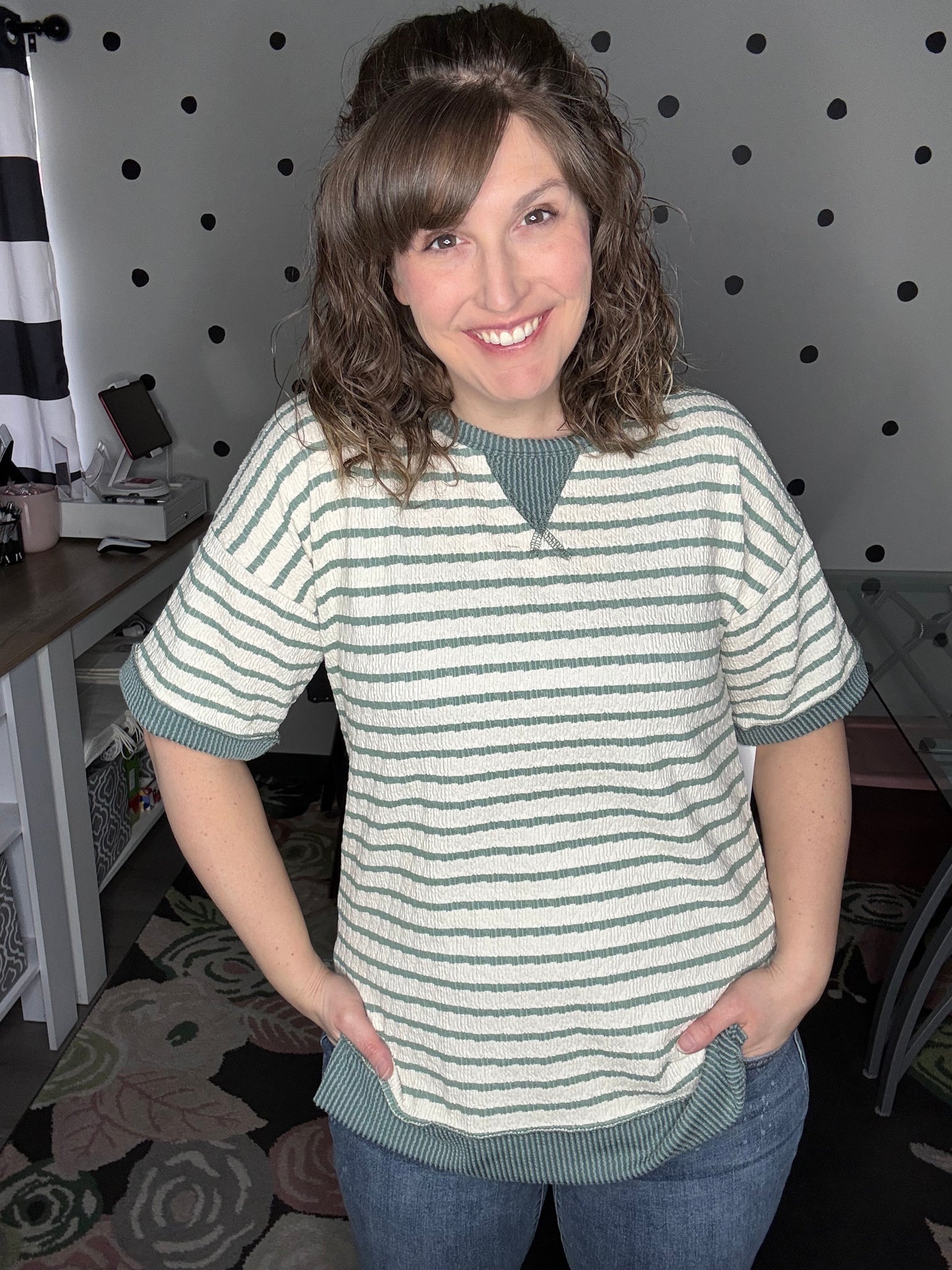 Available in green or mocha this striped top features a jacquard knit design, short sleeves, and crew neck. Raised ribbed knit fabric is used to accent the bottom hem, sleeve cuffs, and neckline. The top is mostly true to size and relaxed in the arms and sleeves. Alyssa is wearing her true size of a medium here.