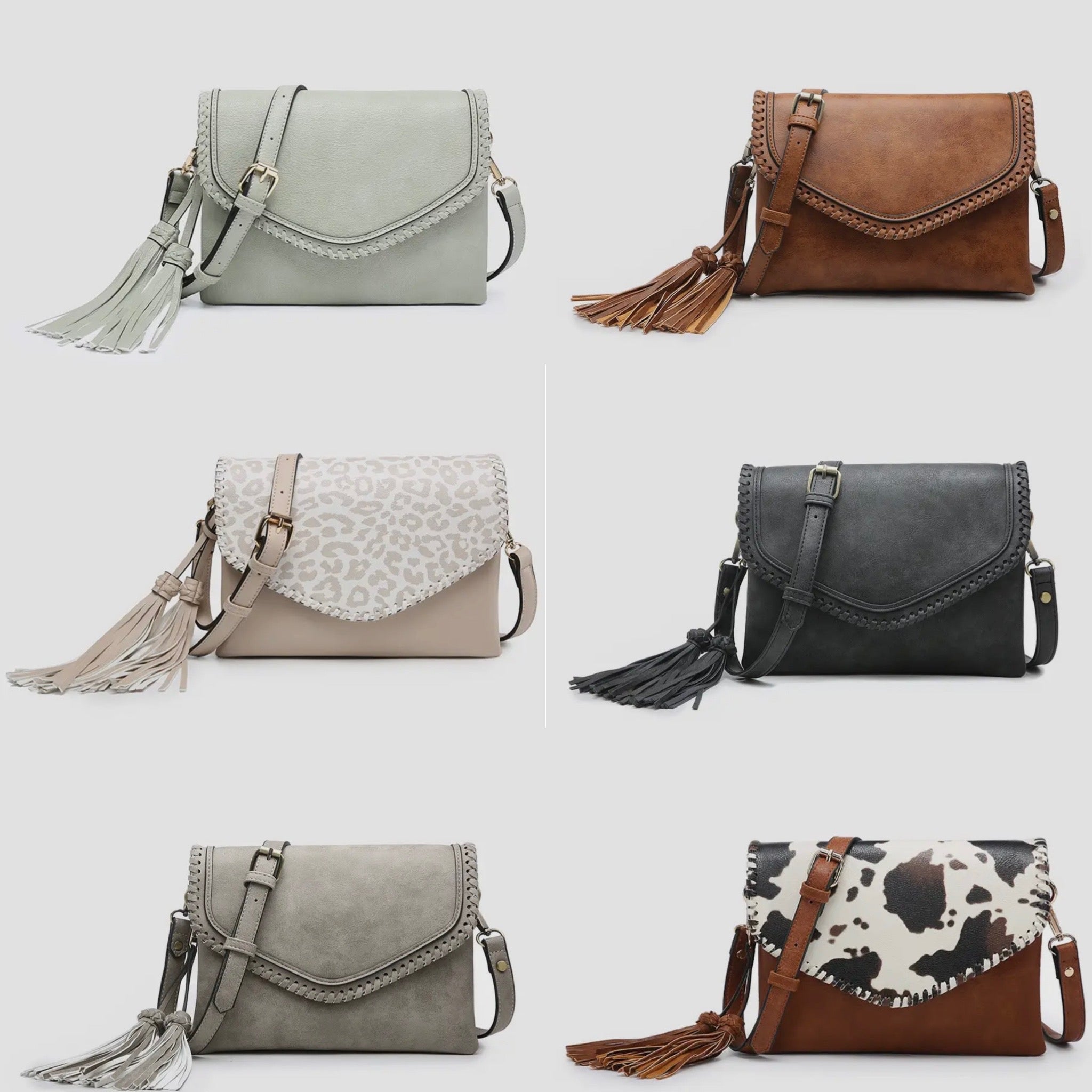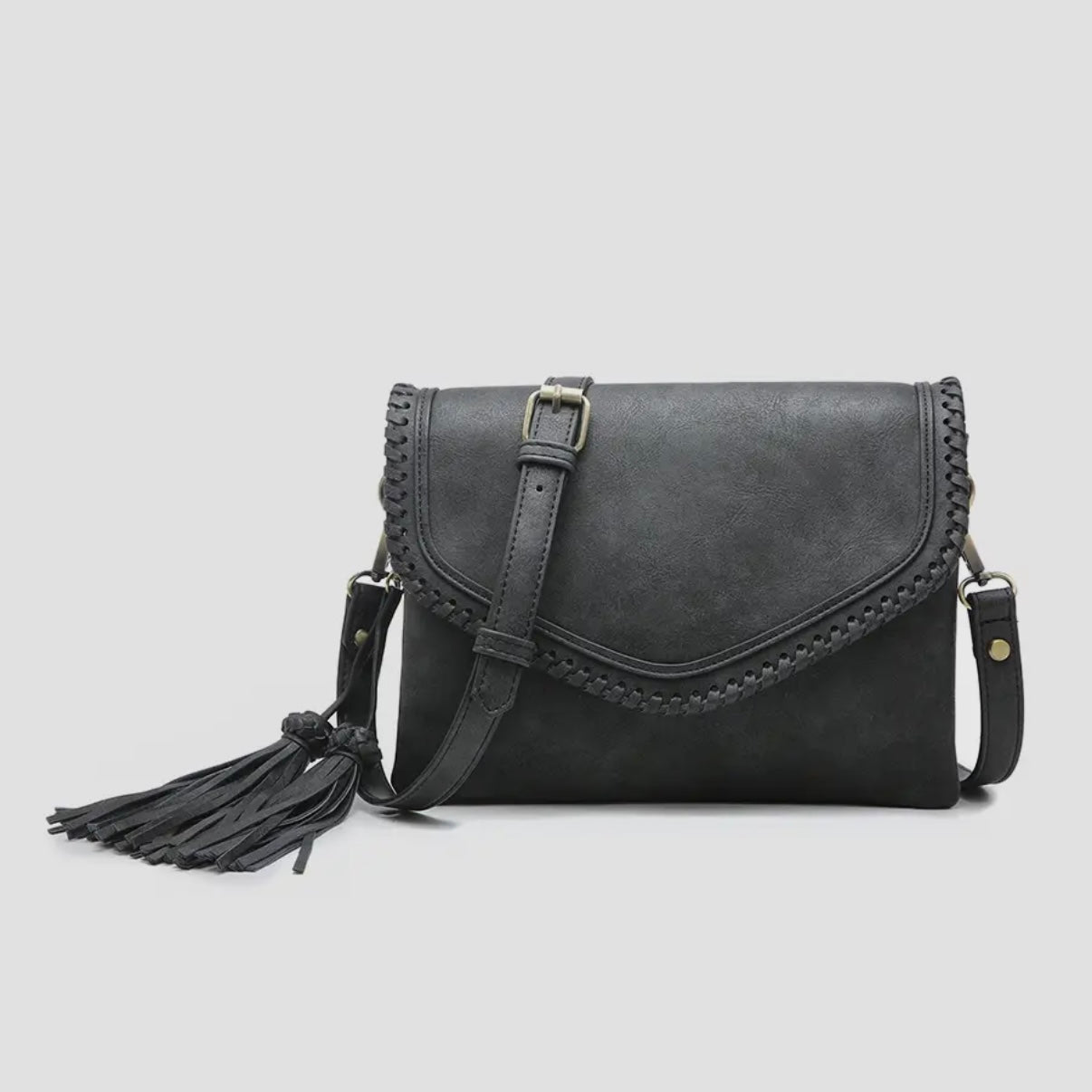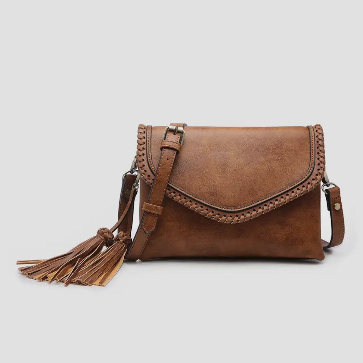 The Sloane Flapover Crossbody offers a blend of bohemian charm and practicality. With its braided/whipstitch edges and fringe tassel trim, it adds a stylish touch to any outfit. Crafted from vegan leather, this crossbody embodies both fashion and compassion.