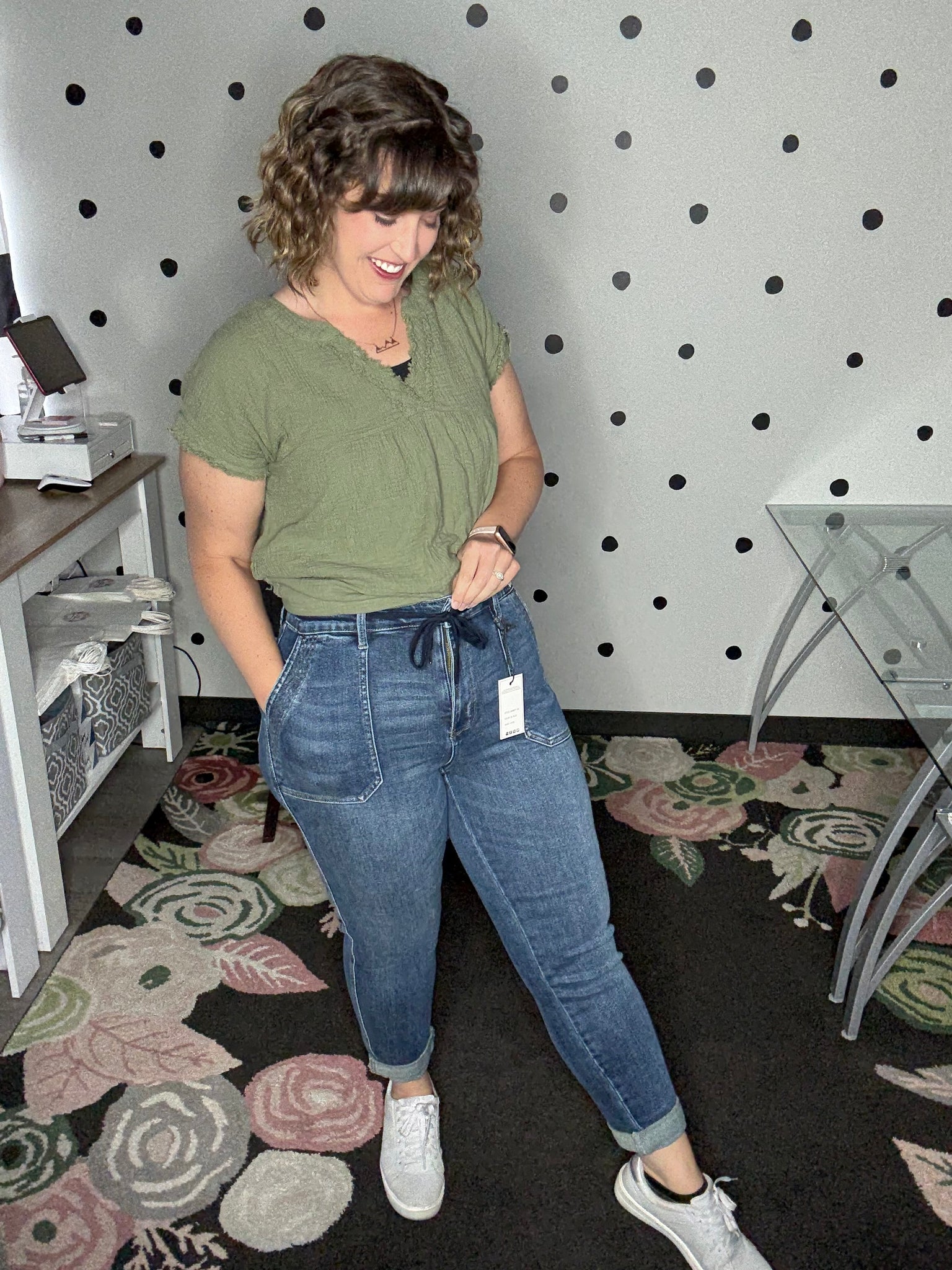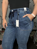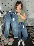 Style: Vintage wash, high rise, joggers with elastic tie waist. No rips or tears but there is some slight distressing on the two back pockets. These joggers are relaxed through the hip and thigh then taper from the knee down. Cuffed hem that can also be worn uncuffed. Traditional zipper and button closure. Extra deep front pockets. Style 88971.