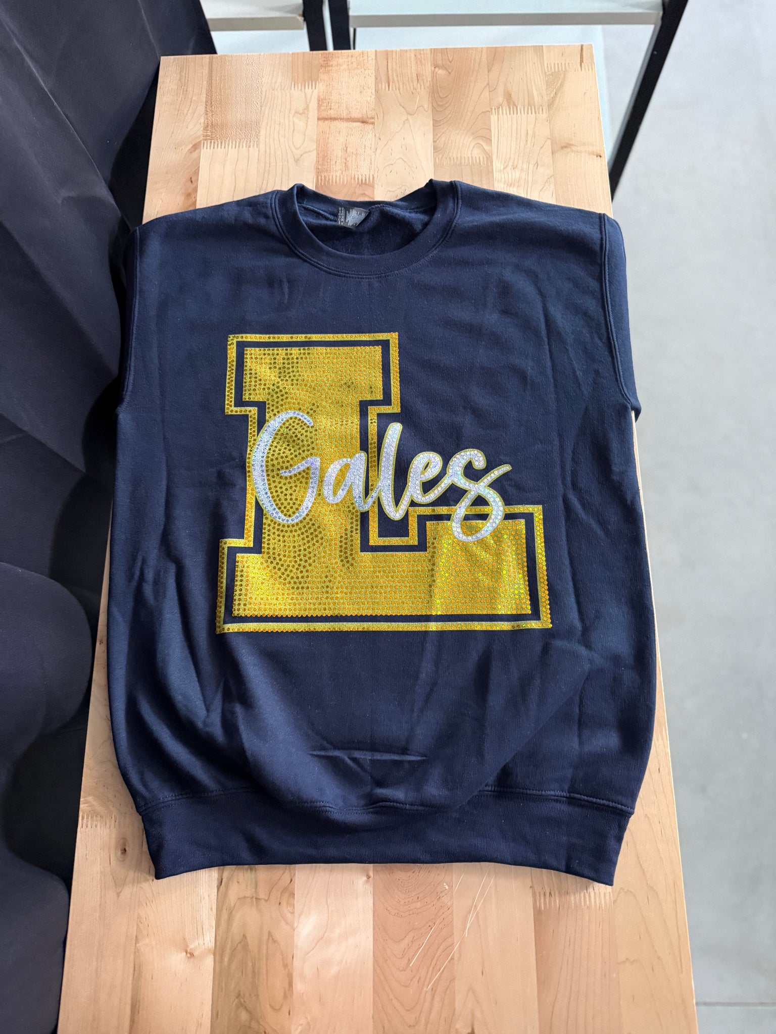 Spangled L and GALES printed on a unisex fit NAVY fleece sweatshirt.