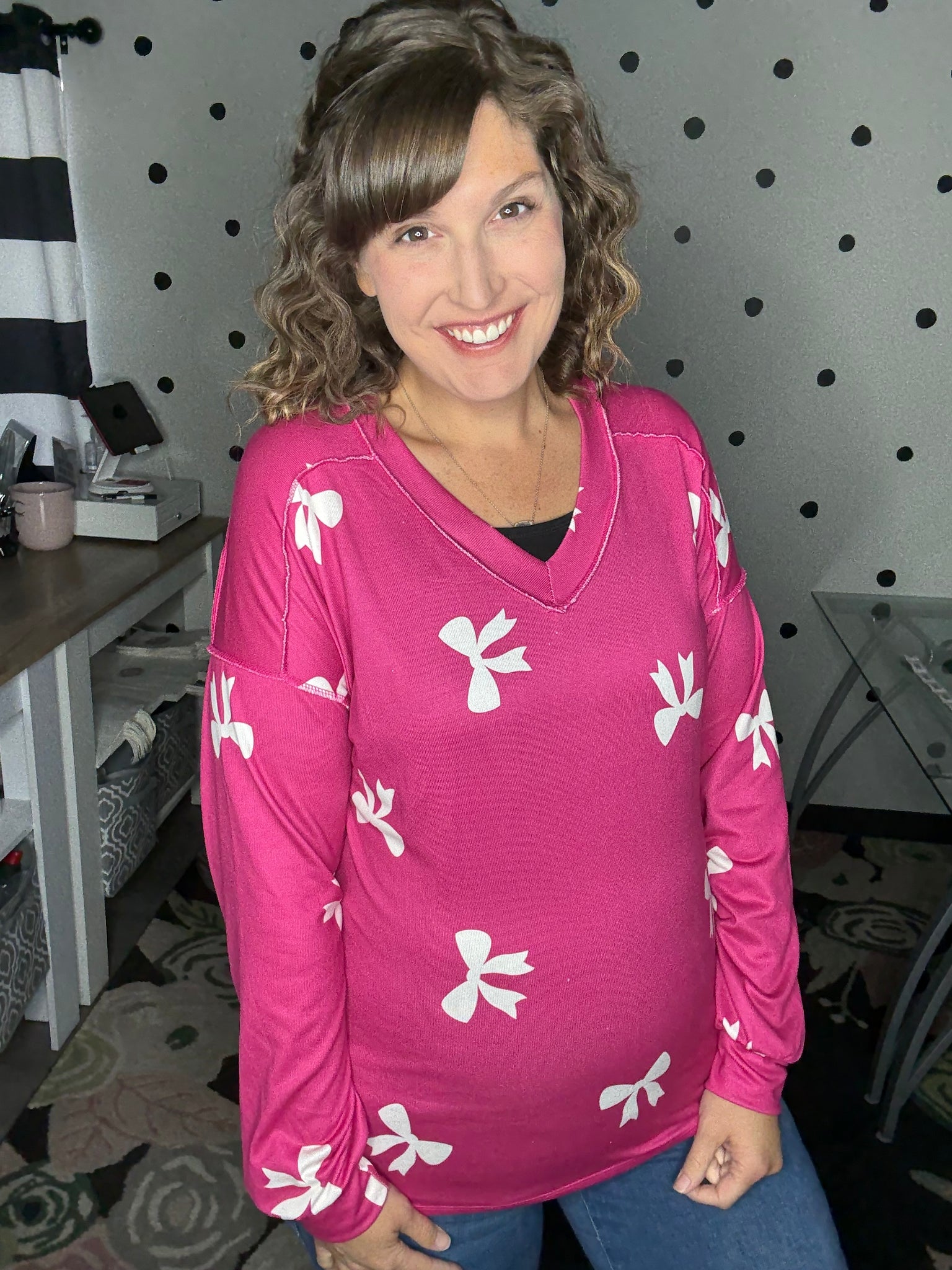 This stunning magenta top has the cutest white bows printed all over. Long sleeves, and v-neck this top is true to size and buttery soft. The fabric is a brushed knit making it cozy feeling but still lightweight. Alyssa is wearing her true size of a medium here.