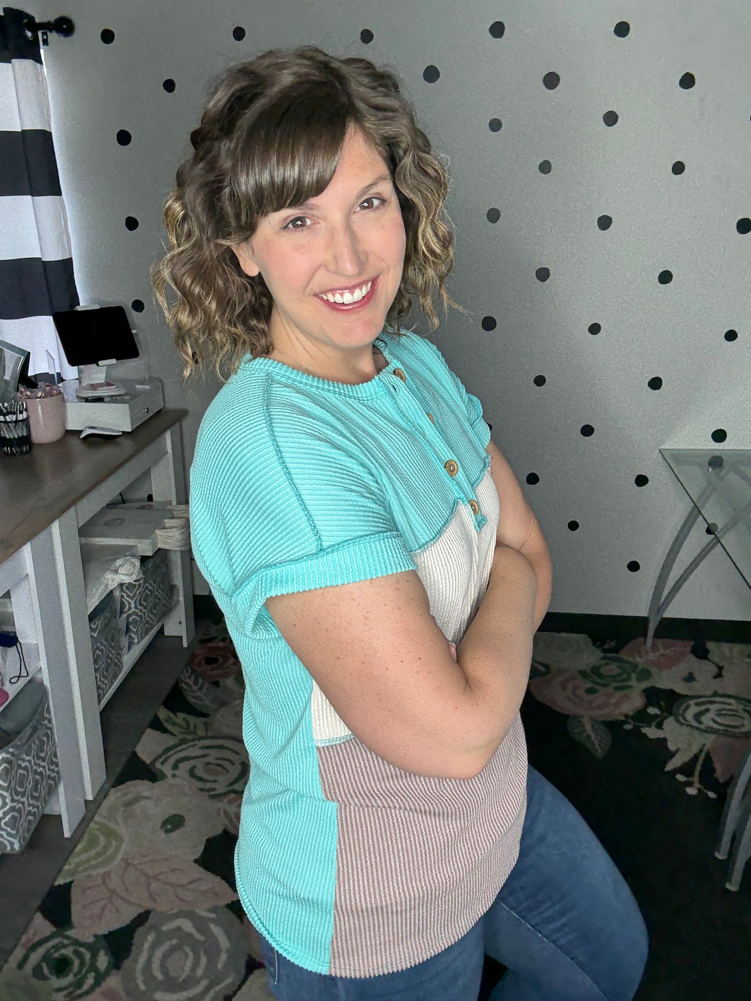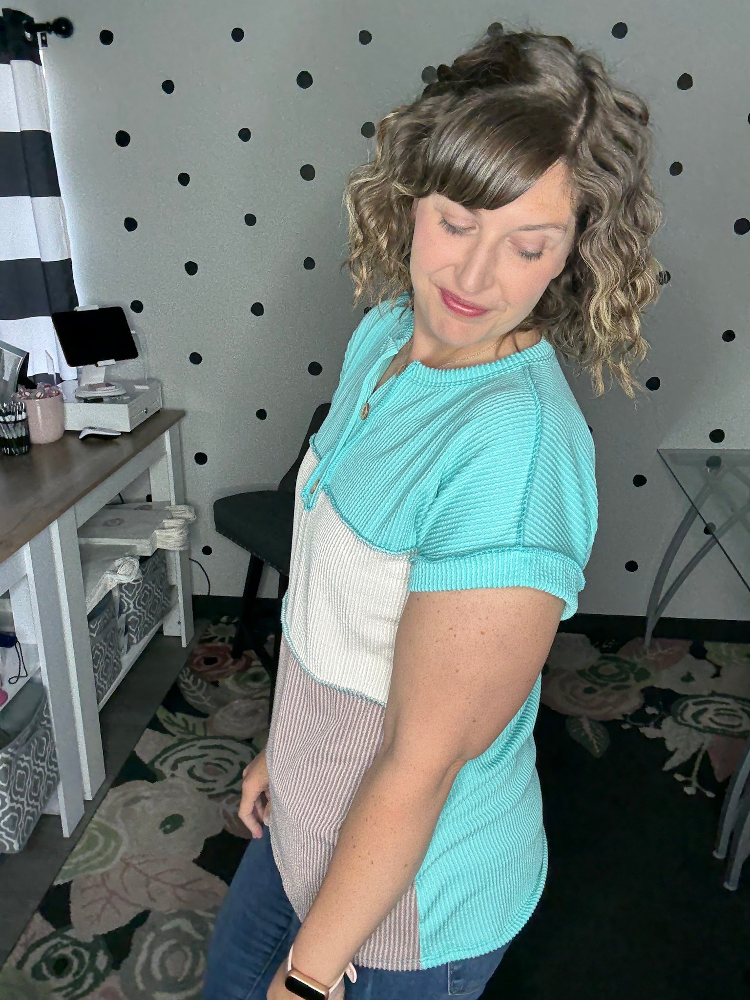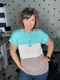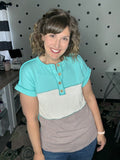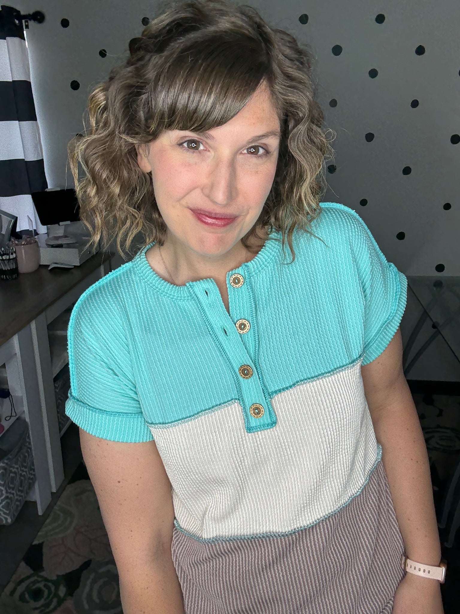 Mint, ivory and tan come together in this color blocked top. This short sleeve tee features a functional button up neck line, and soft urban ribbed knit fabric. The fit is true to size. Alyssa is wearing a medium here.