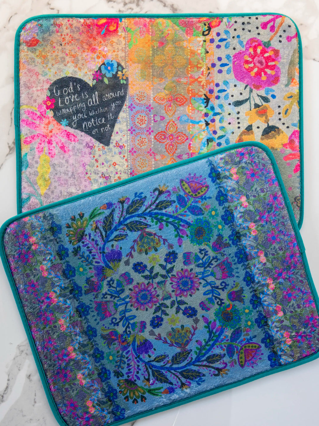 Dishwashing is a chore but drying them on our Reversible Drying Mat makes it bearable...and almost fun! While your dishes dry, the colorful boho artwork brightens up your kitchen. We made it from a special cushioned foam to keep your dishes protected and securely in place. It dries super quick, and cleanup is a breeze. We like to use them all over our house too! Place one under your pet’s dish, and doggy water splashes and dribbles get soaked right up! You can even use one under your laptop at your desk or put it underneath that plant that always leaks a little. We made it reversible so you can choose which artwork you want to enjoy that day!