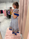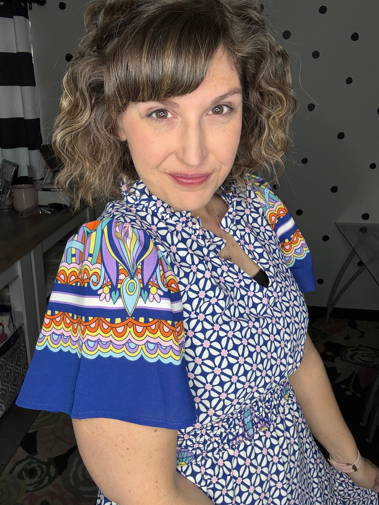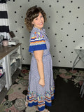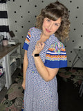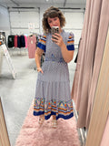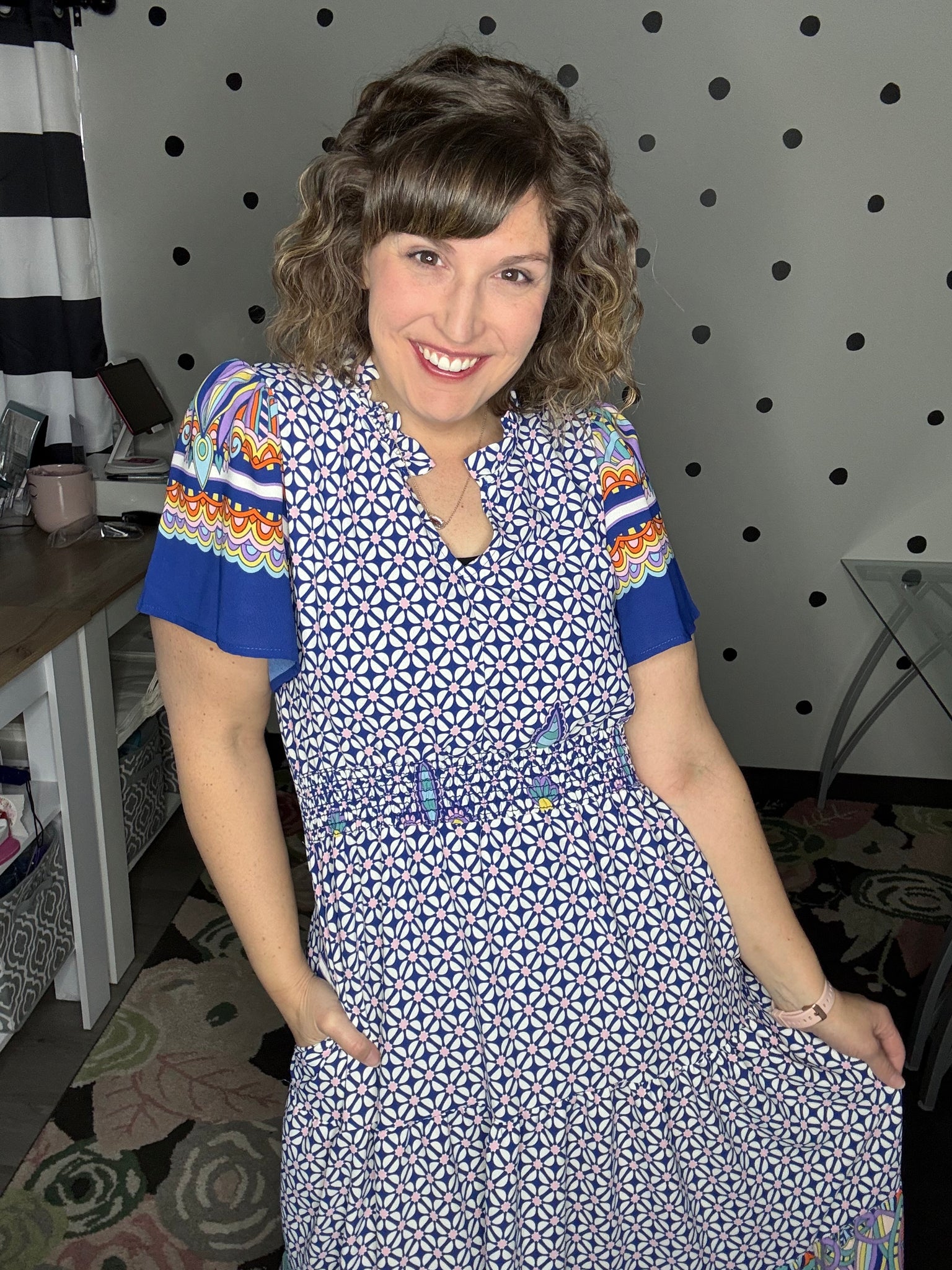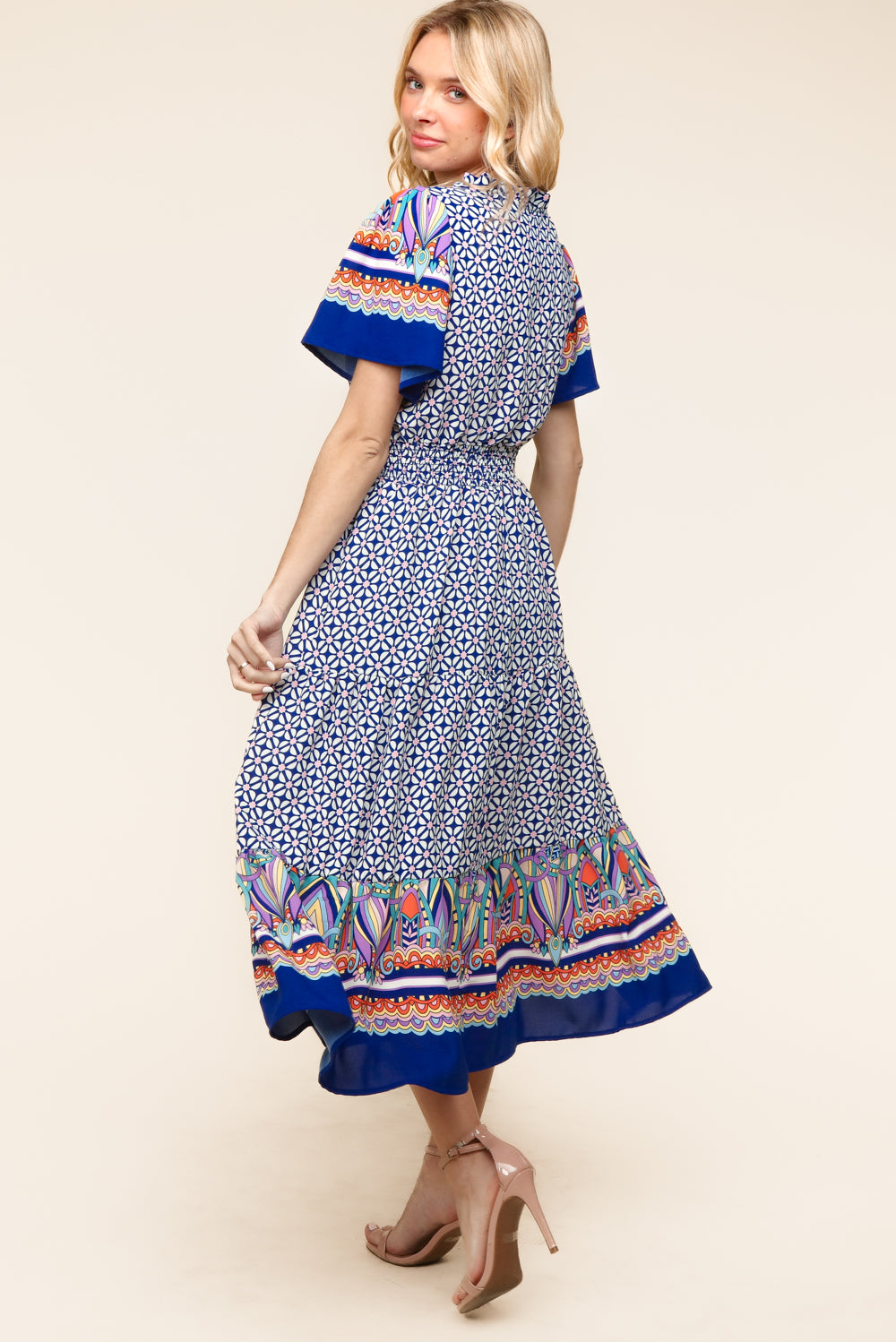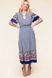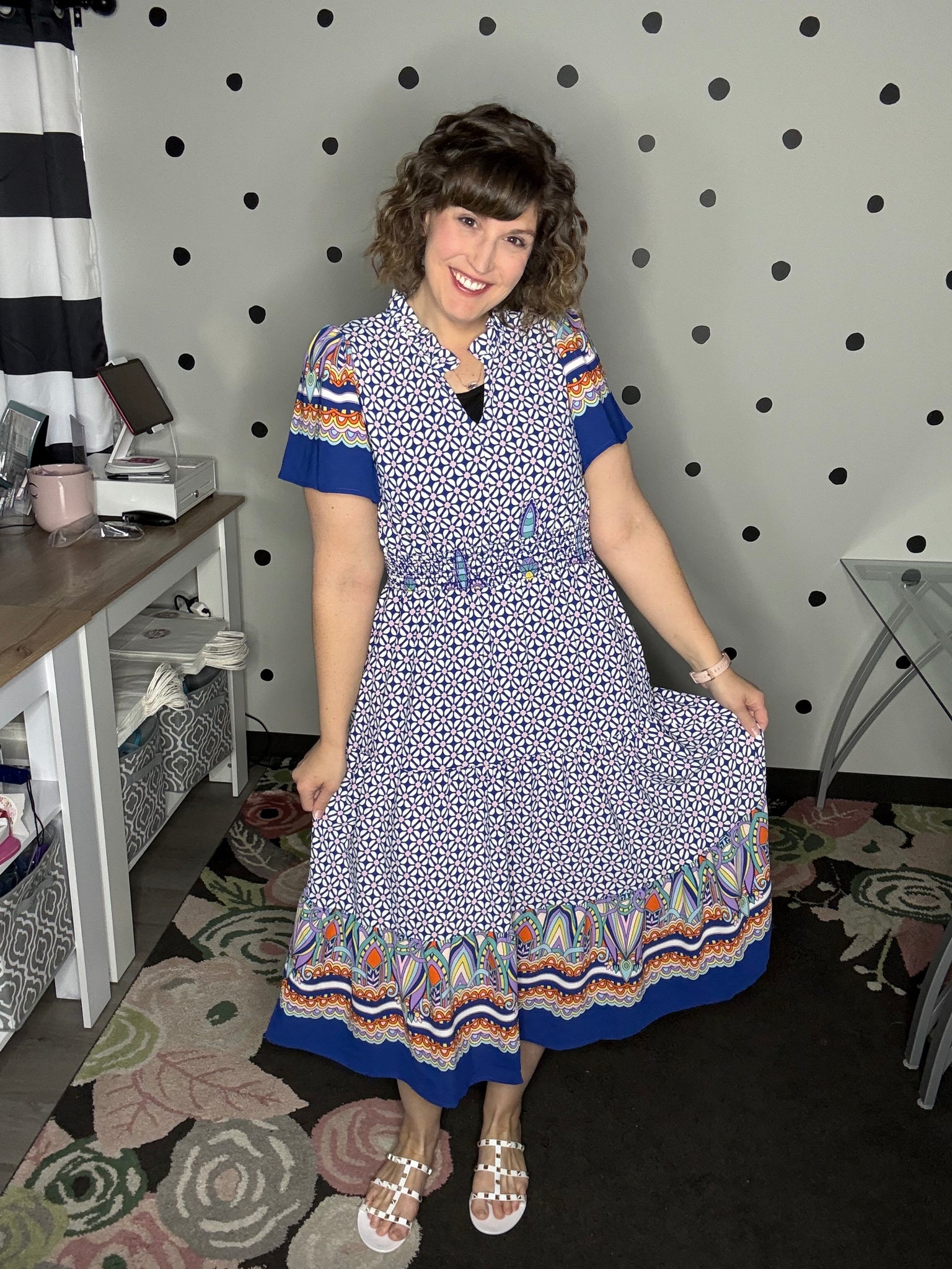 Perfect for Easter or Mother's Day! Ivory and navy border printed midi dress with flutter sleeves and side pockets. This stunning dress features a smocked waist and tiered design. Midi length. The neckline is so unique - with a combination of a keyhole and mock design. The fabric is woven 100% polyester. The fit is true to size. Alyssa is a size 12/14 and wearing the medium here.