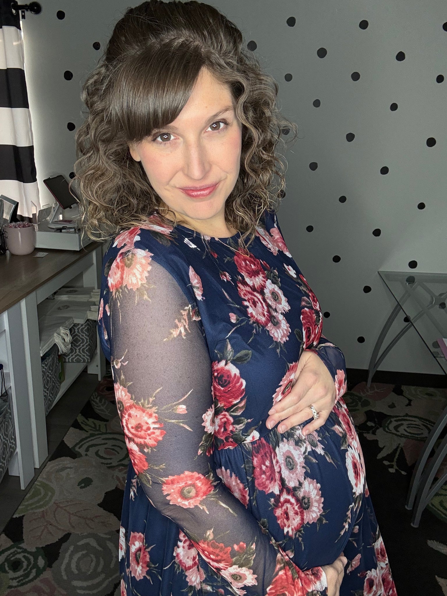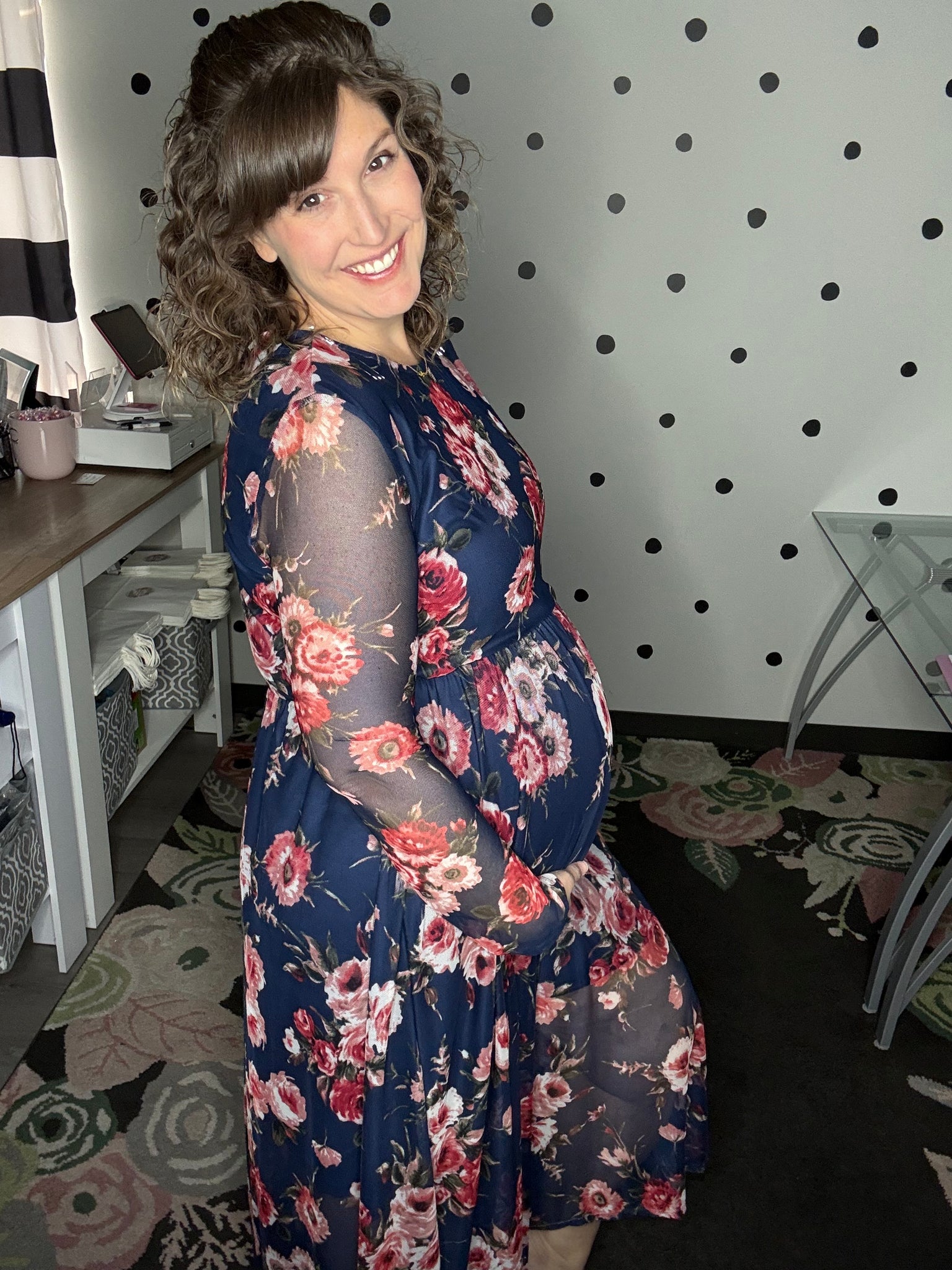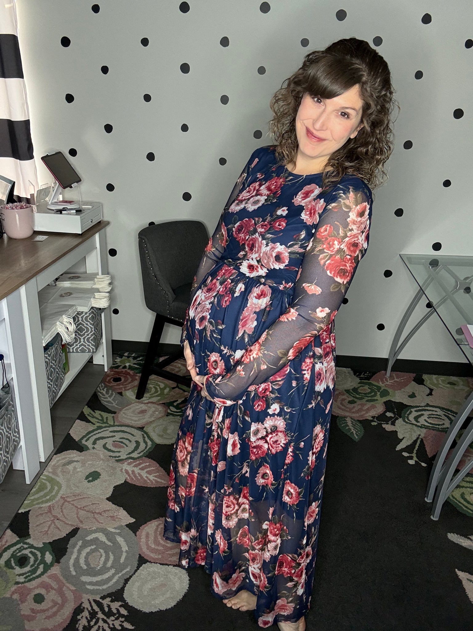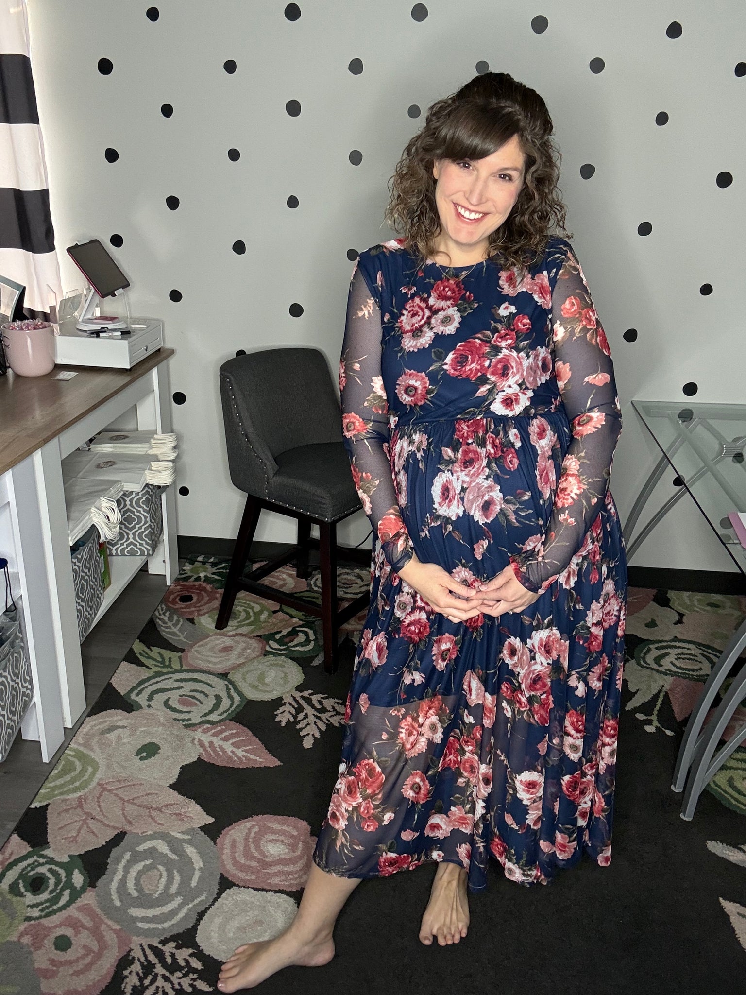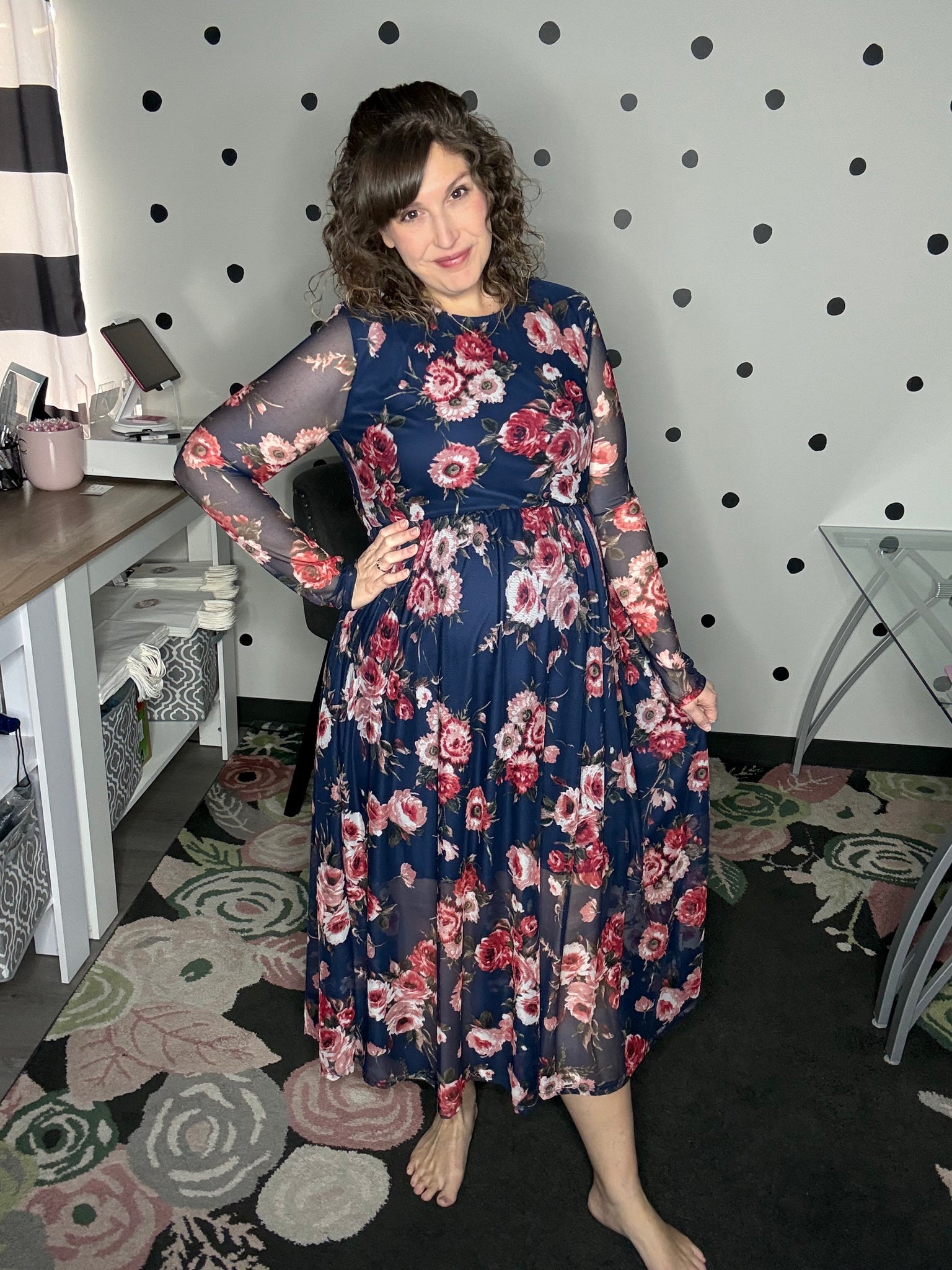 Navy floral printed mesh in a midi length dress. This stunning piece is long sleeved and features a round neck and elastic waist. The fabric is stretchy and the fit is true to size.