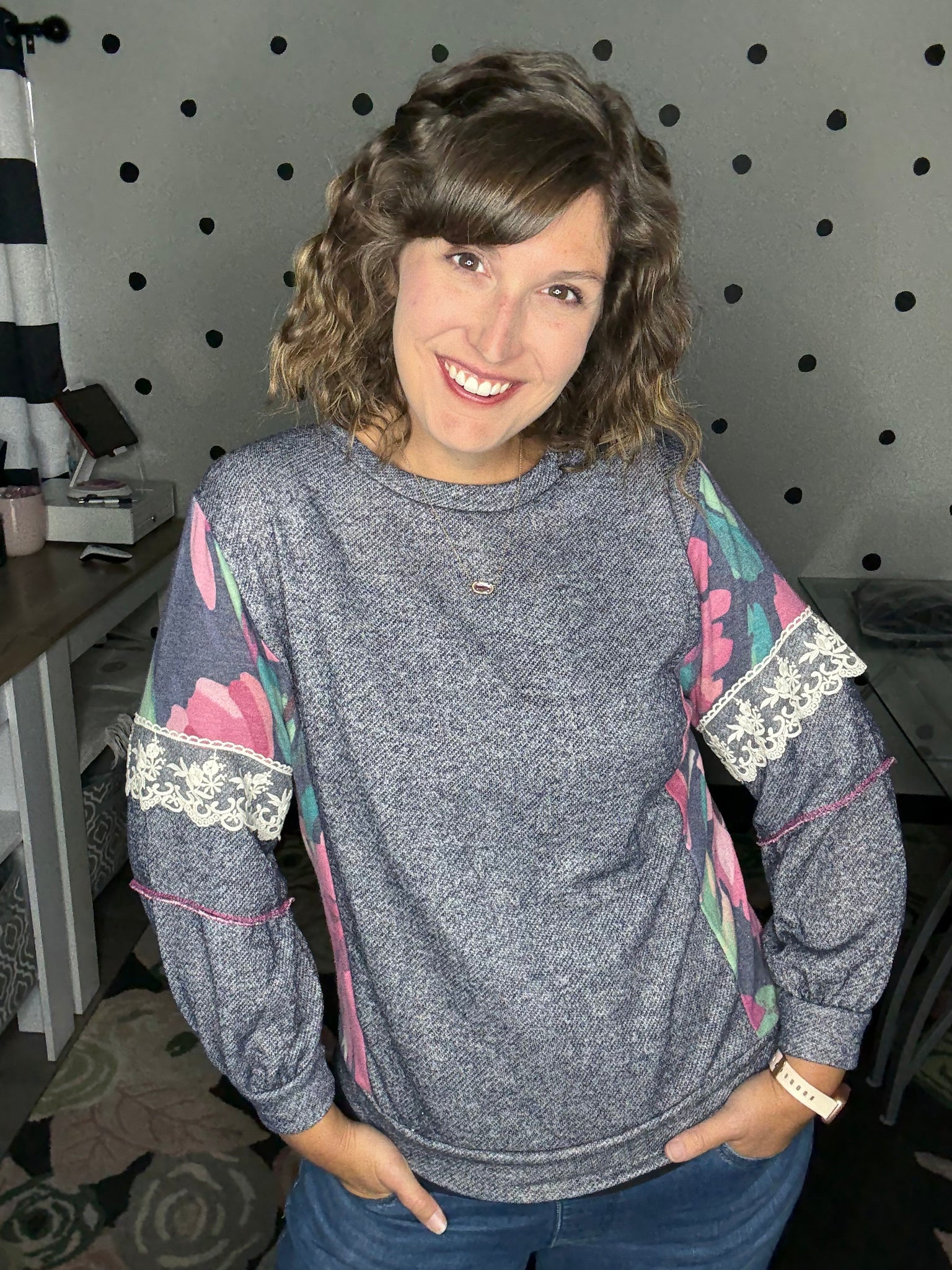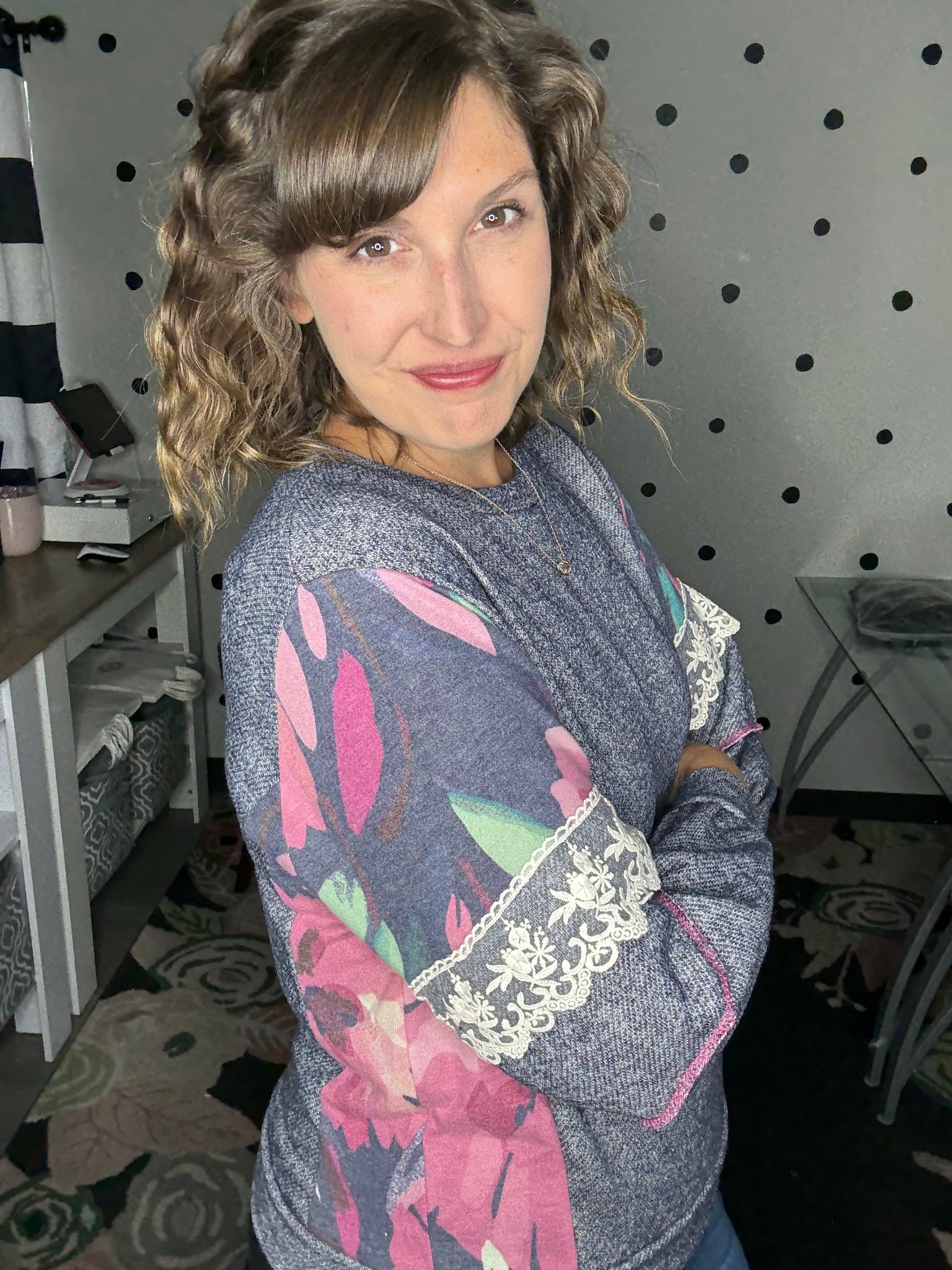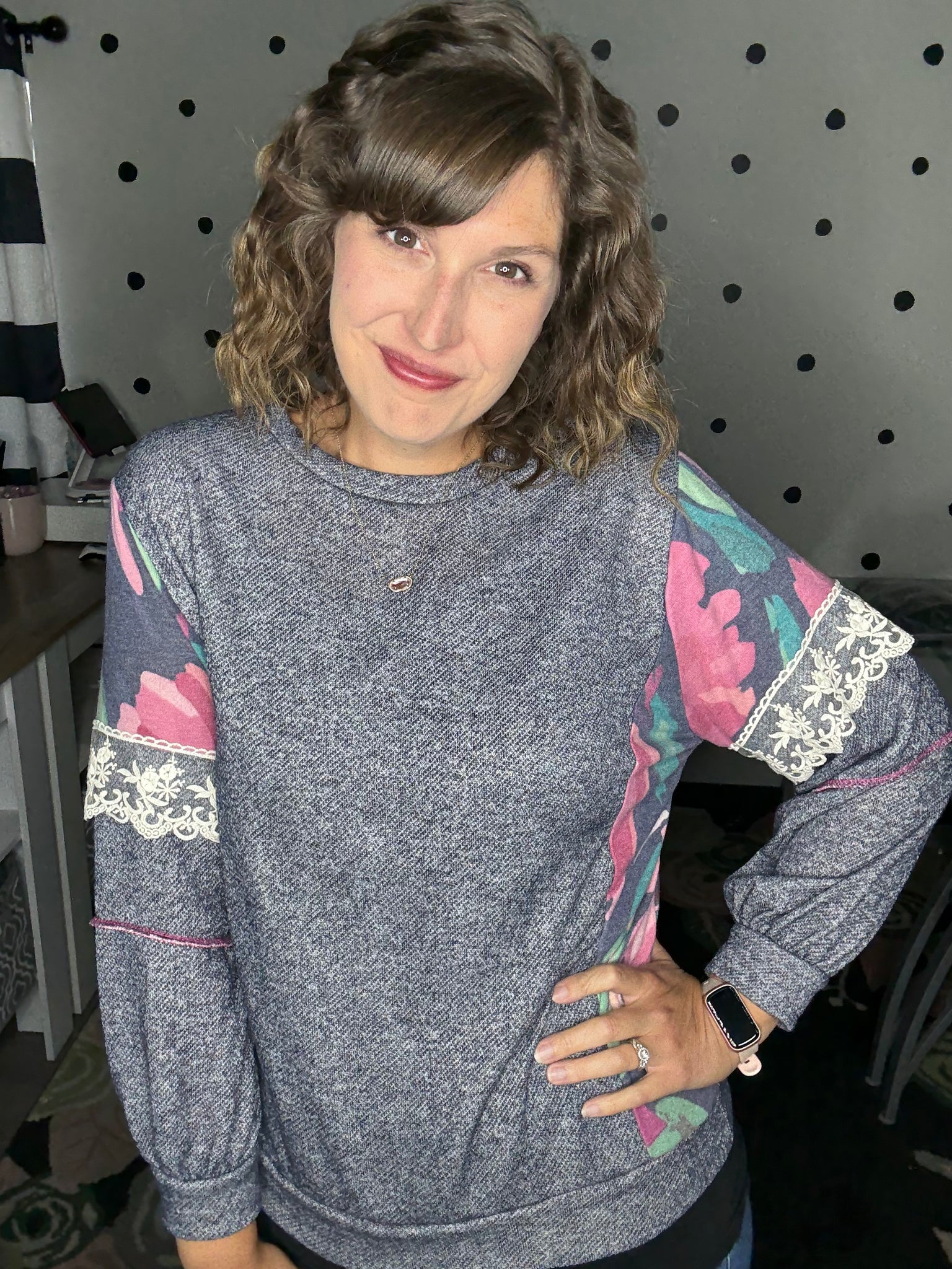 Grey/Navy sweater with floral contrast and a beautiful lace detail on the sleeve. These long sleeve tops feature a round neck, long sleeve, and true to size fit. 60% polyester 40% cotton. Alyssa is wearing her true size of a medium here.
