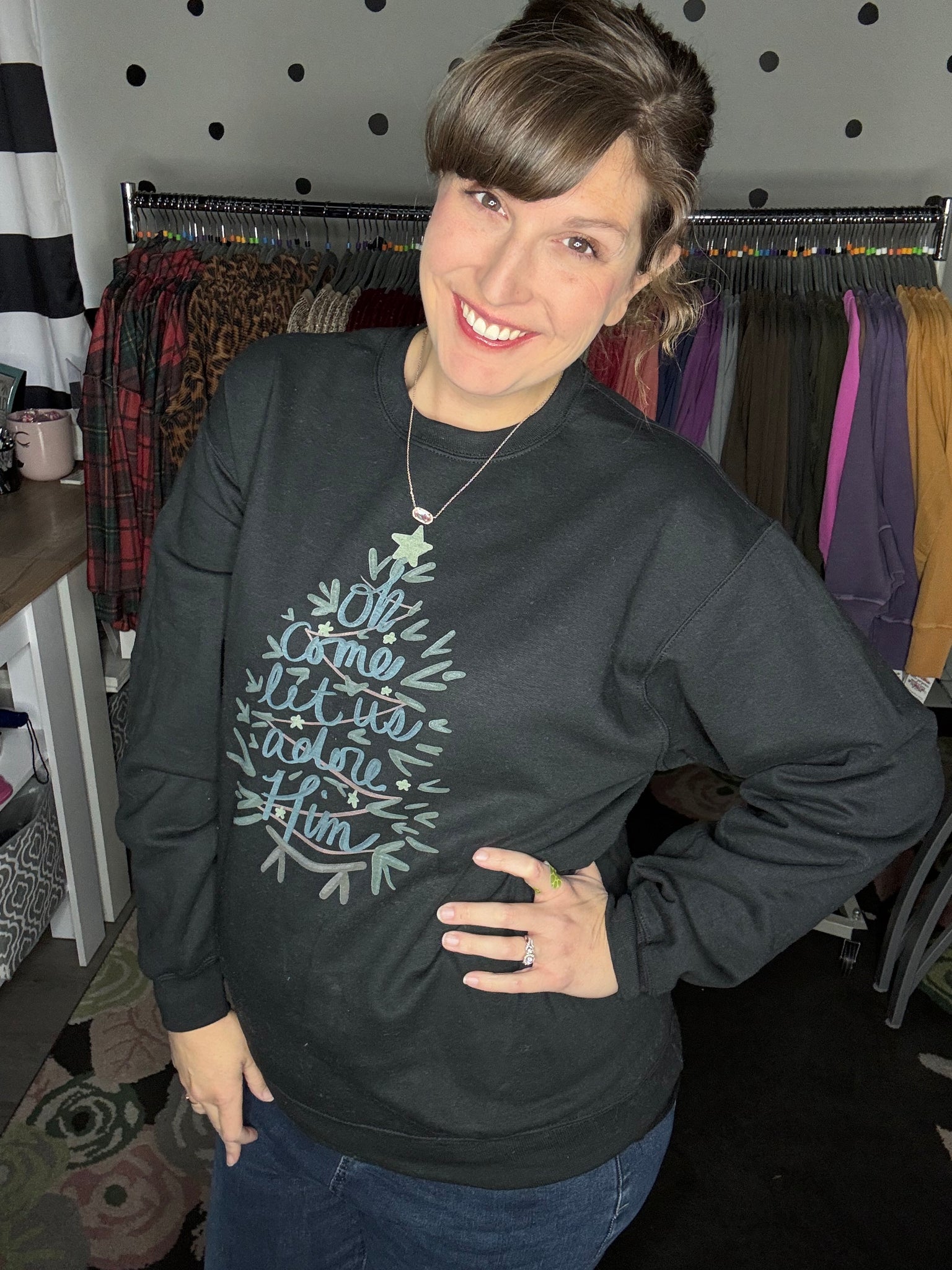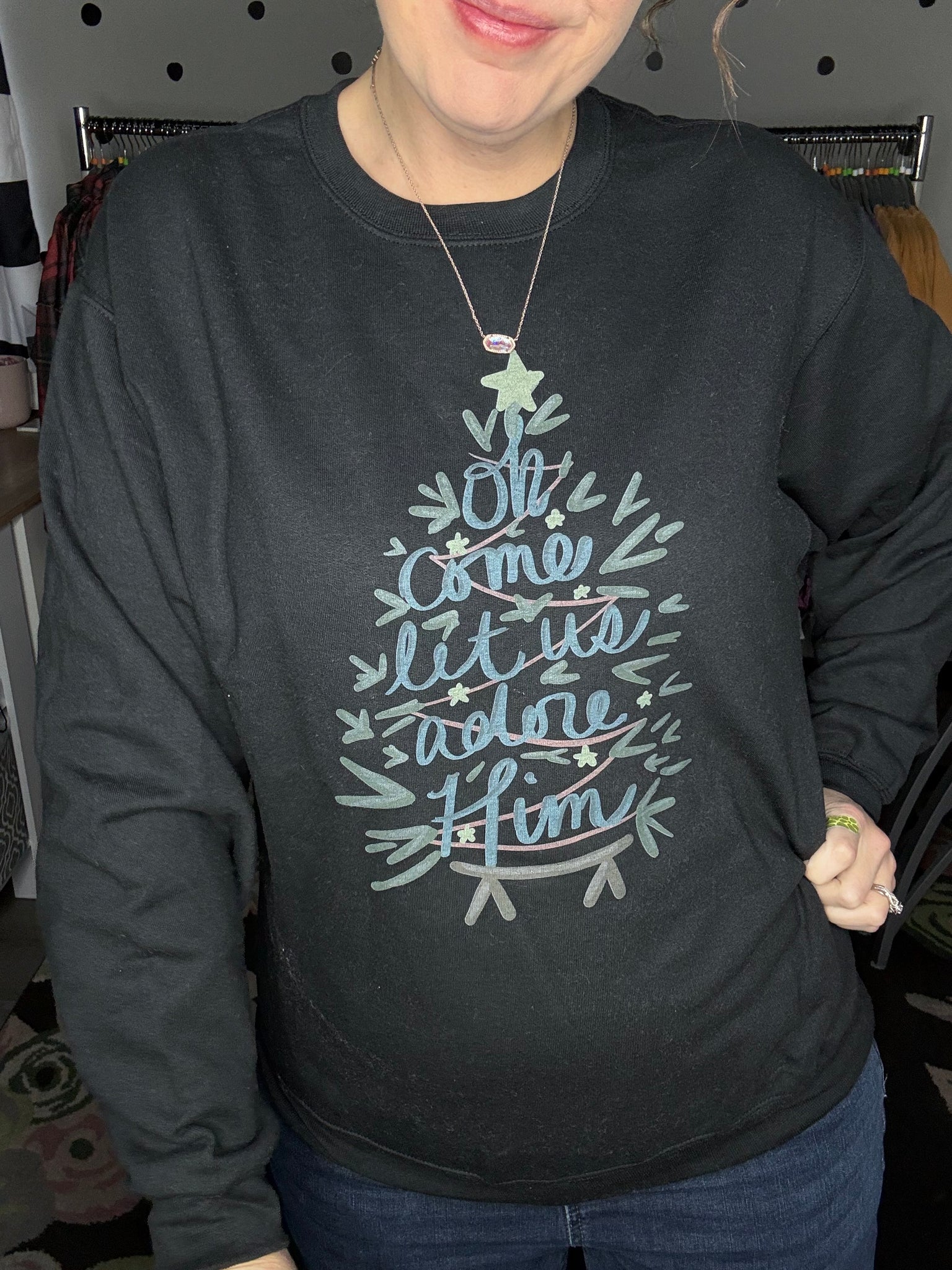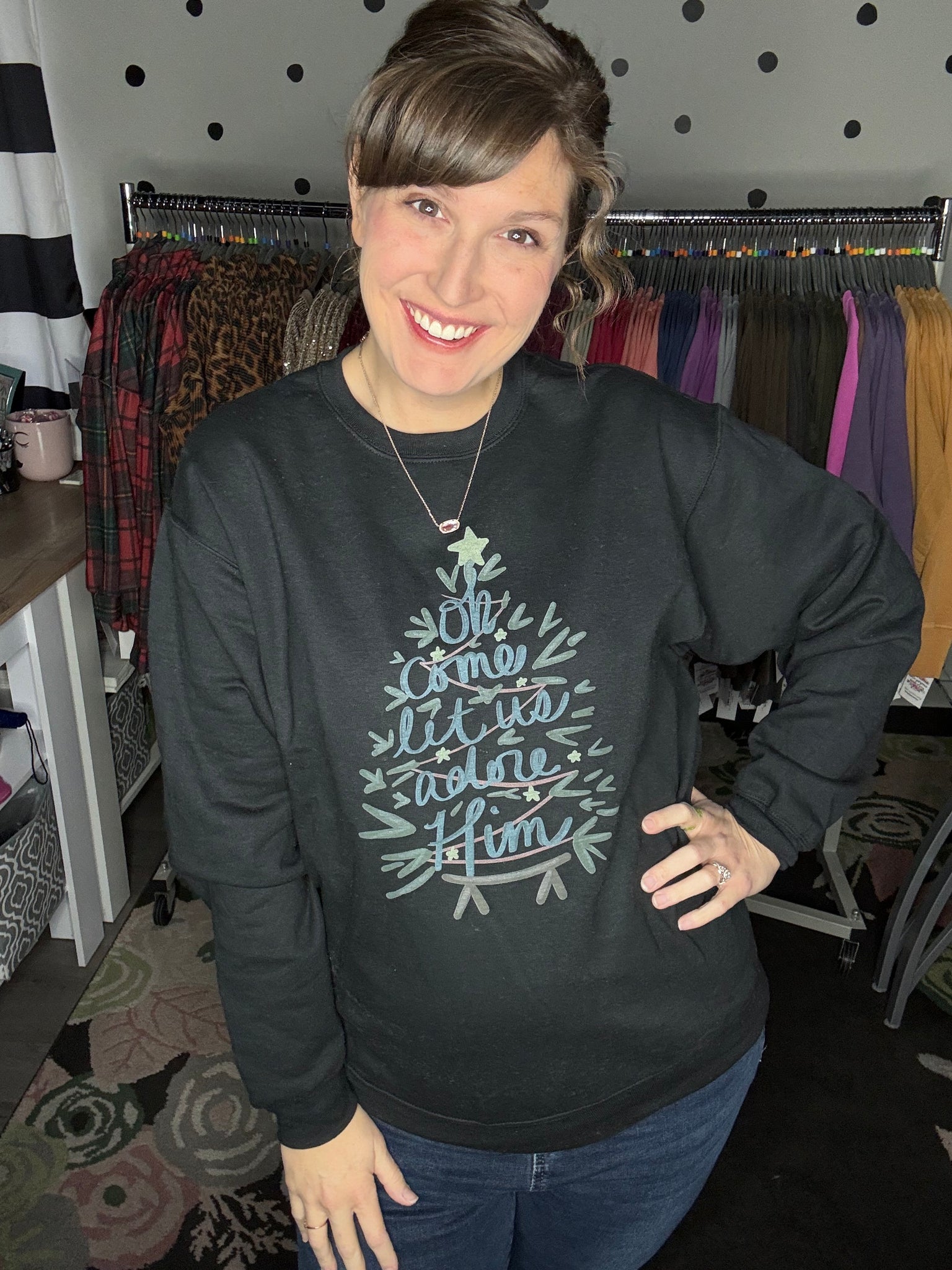 Oh Come Let US Adore Hime printed on a BLACK crewneck fleece sweatshirt. Unisex fit.