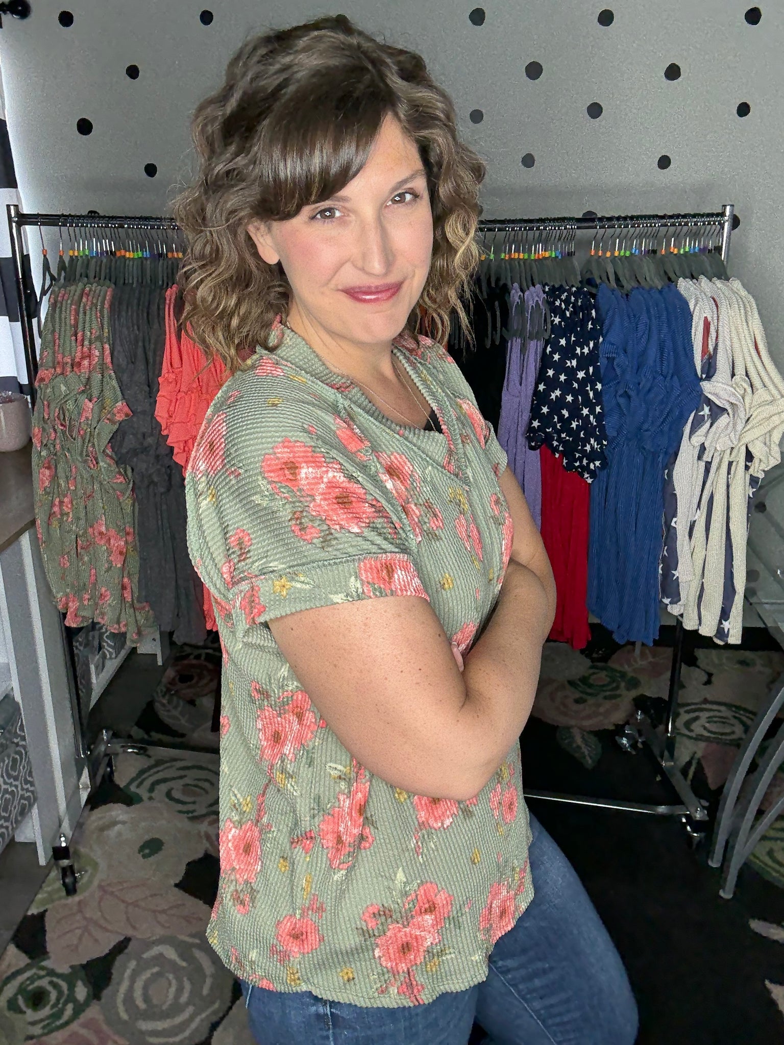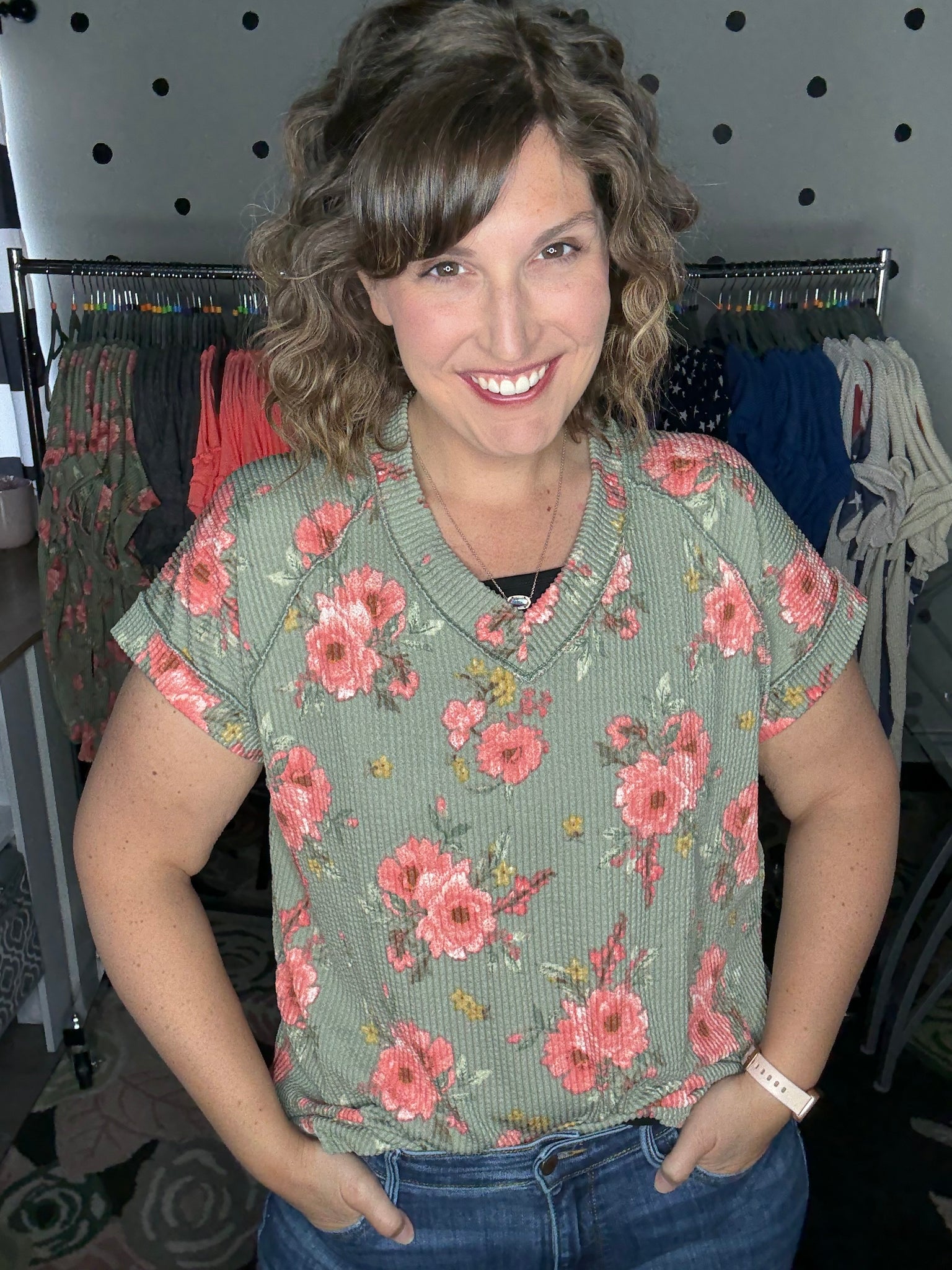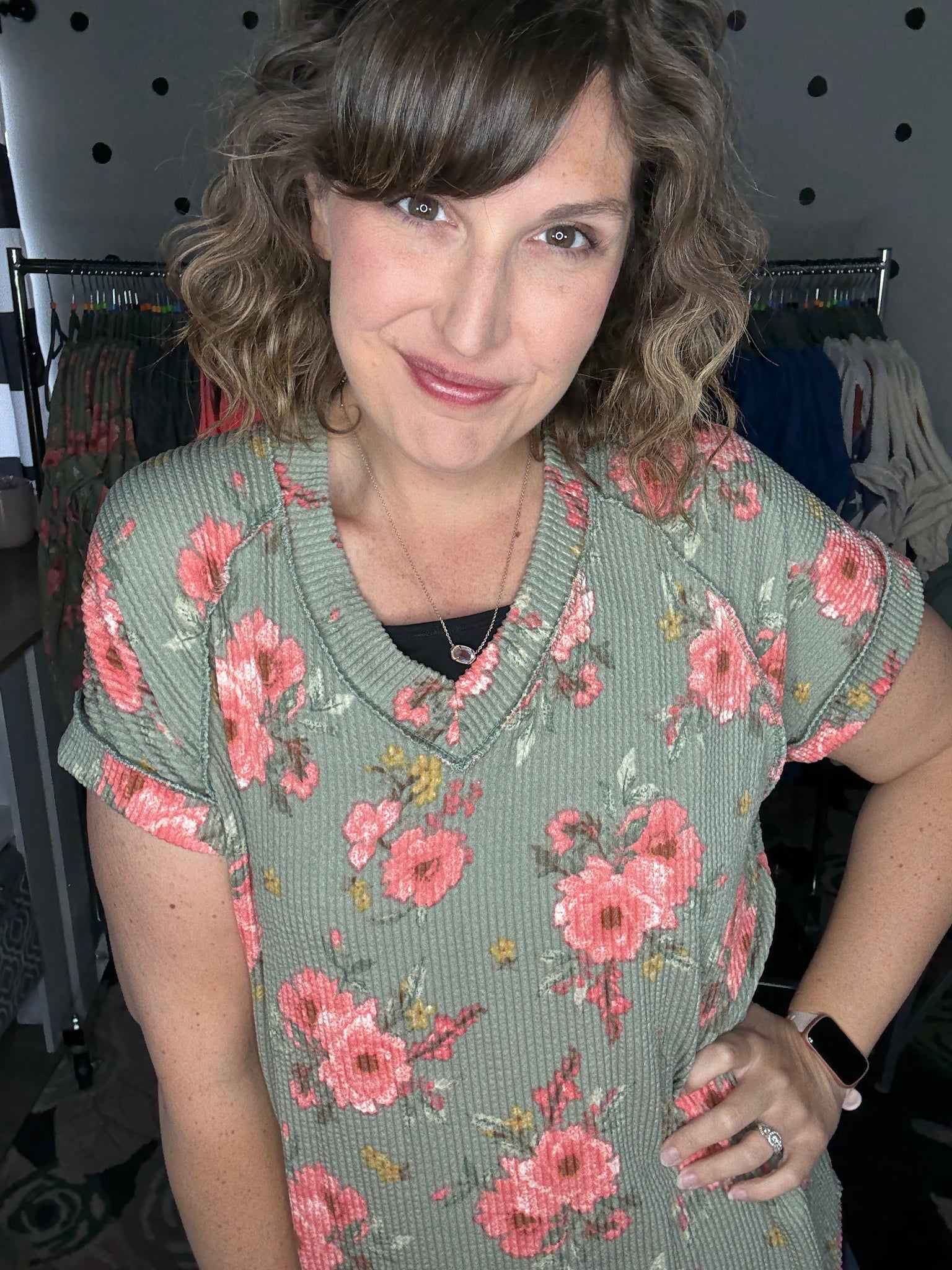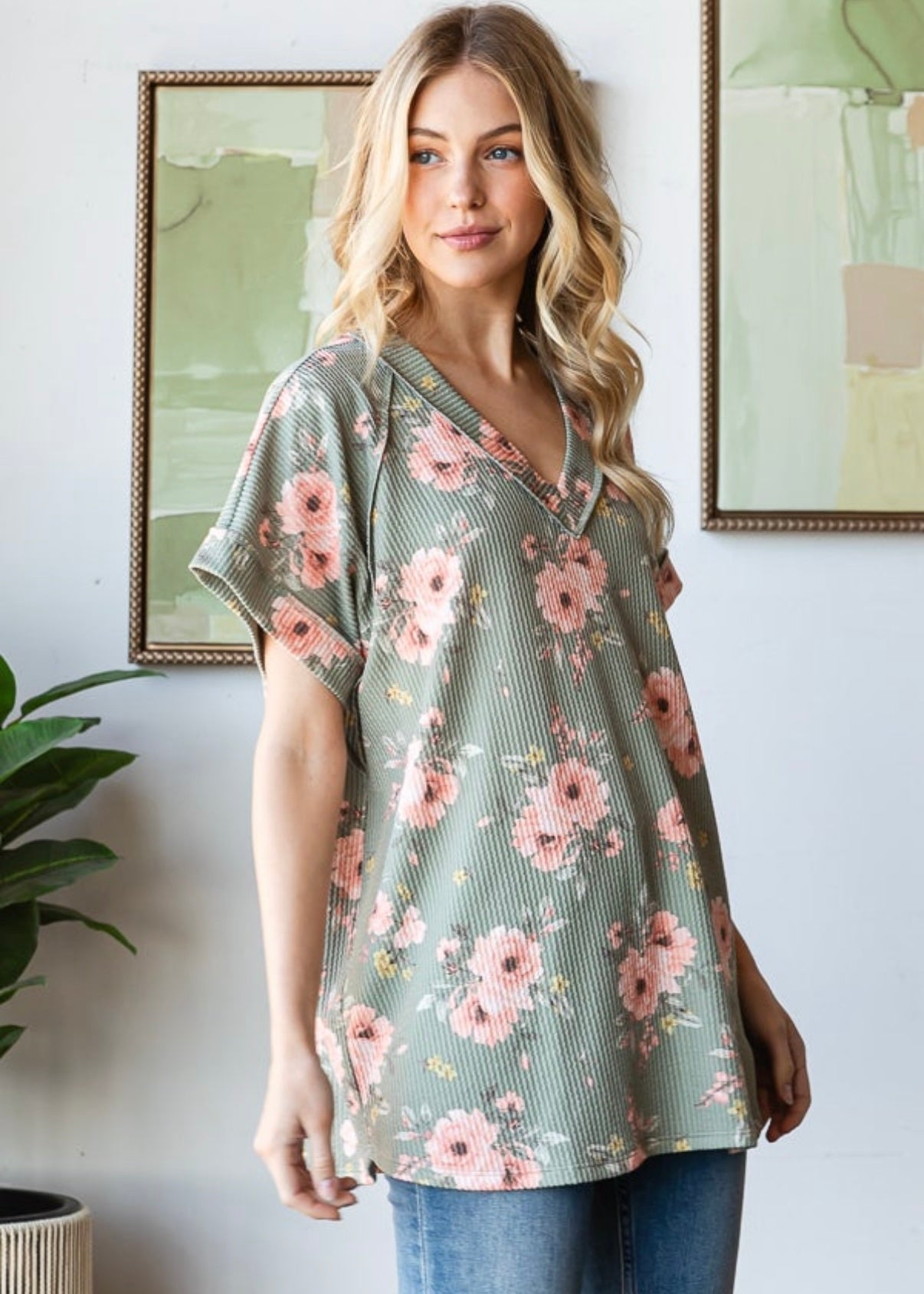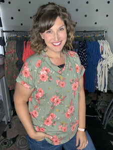 Beautiful sage and coral colored floral on this round neck tee. This top features short sleeves and an OVERSIZED fit. Alyssa is sized down to a small here. Some ladies may prefer to size down one. Fabric is a stretchy urban ribbed knit.