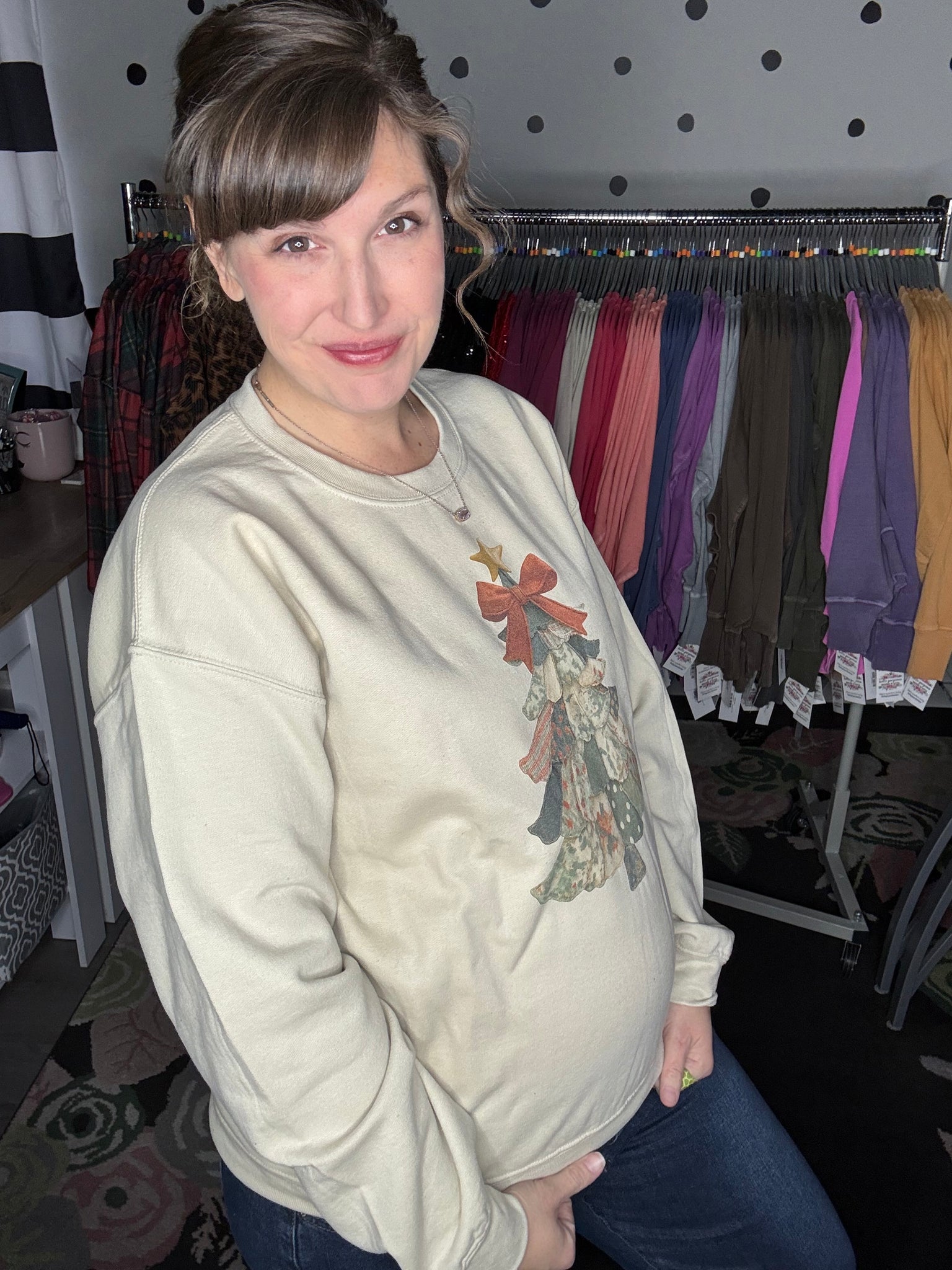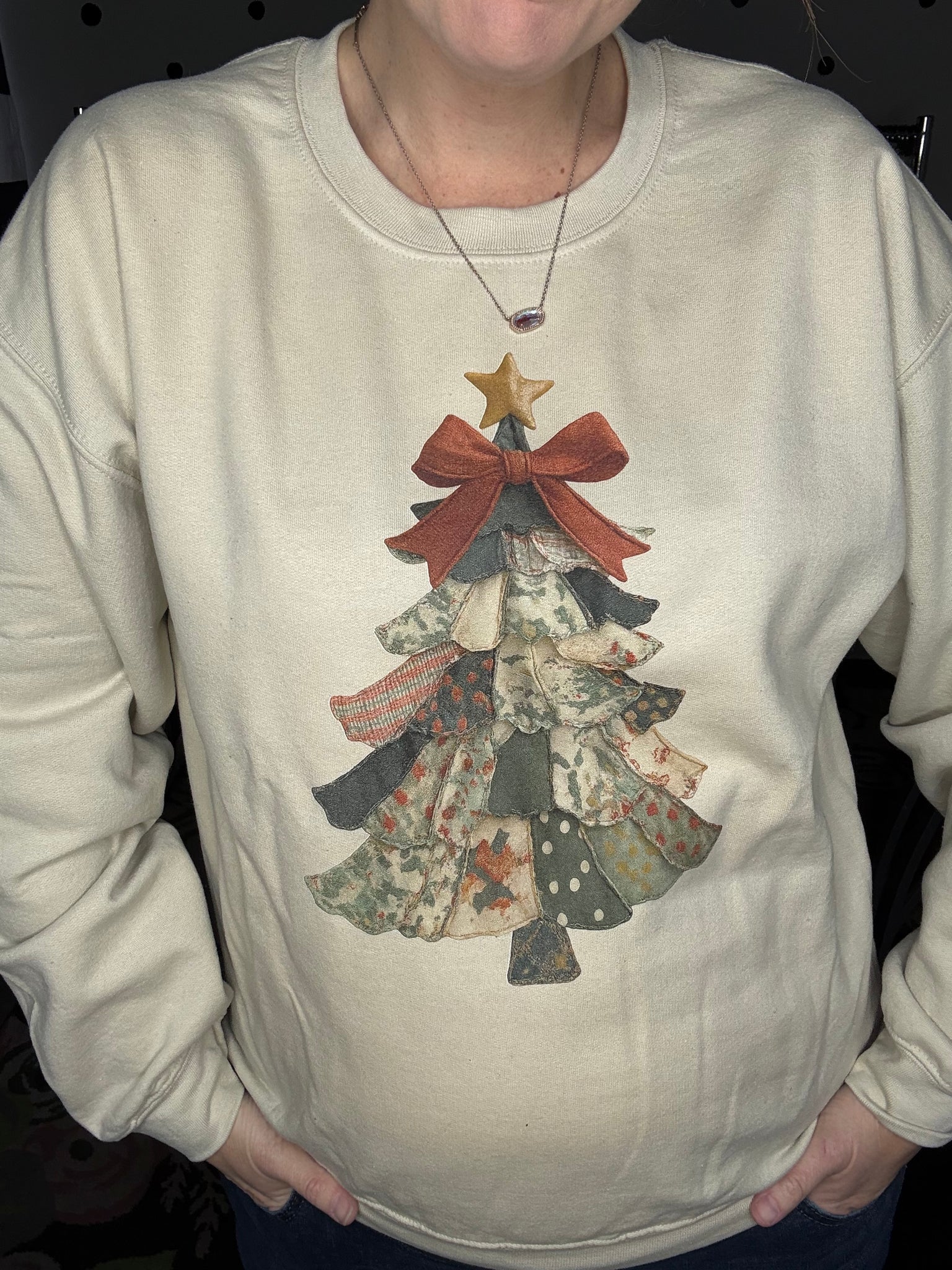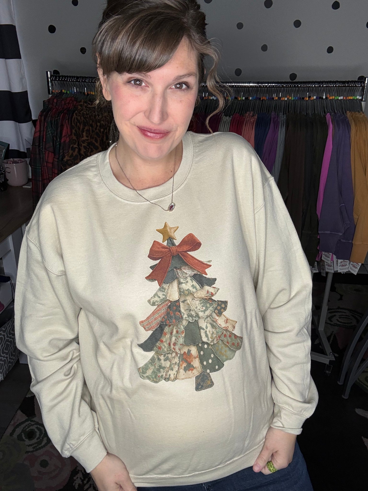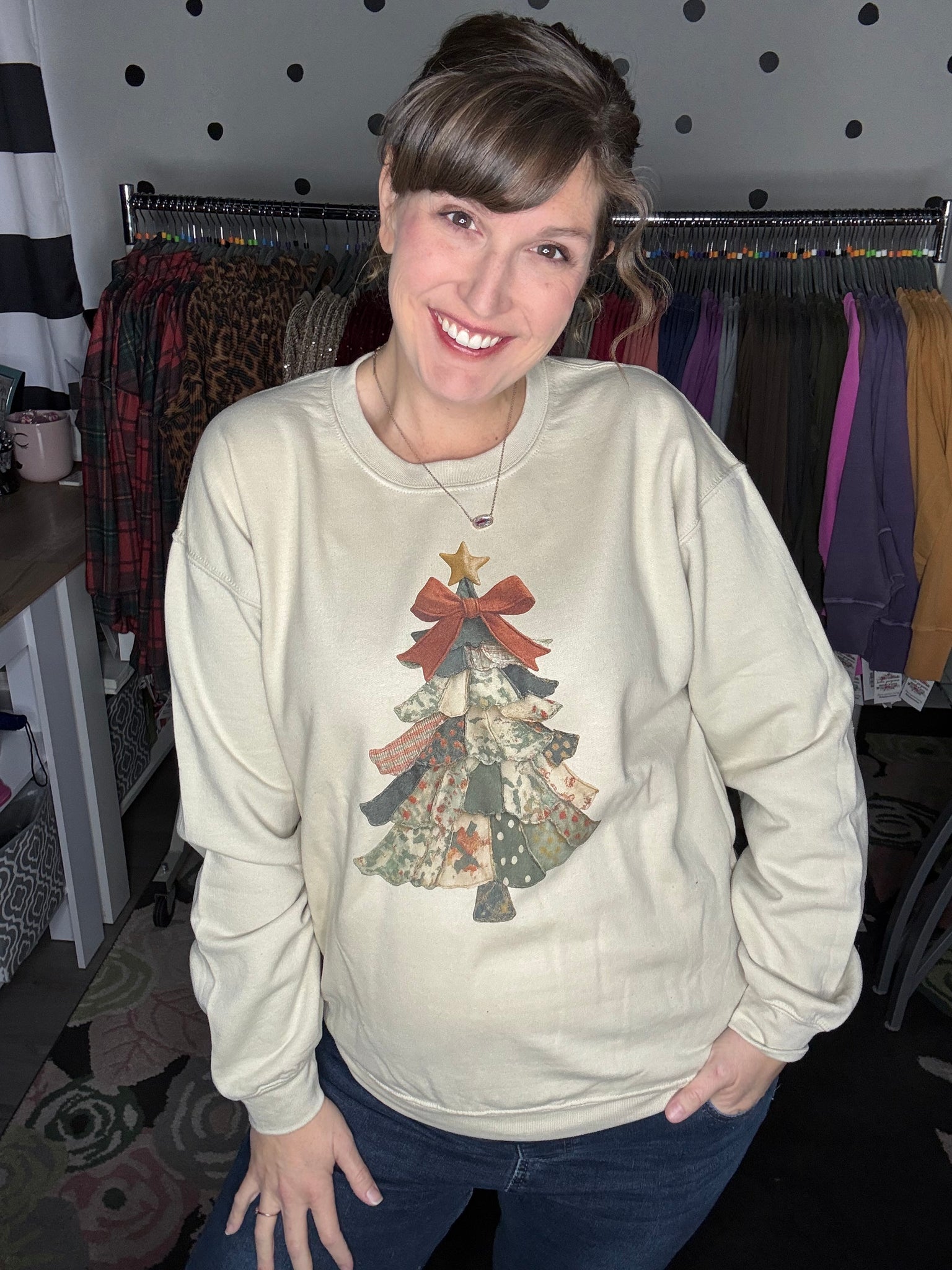 Faux patchwork Christmas tree printed on a SAND crewneck fleece sweatshirt. Unisex fit.