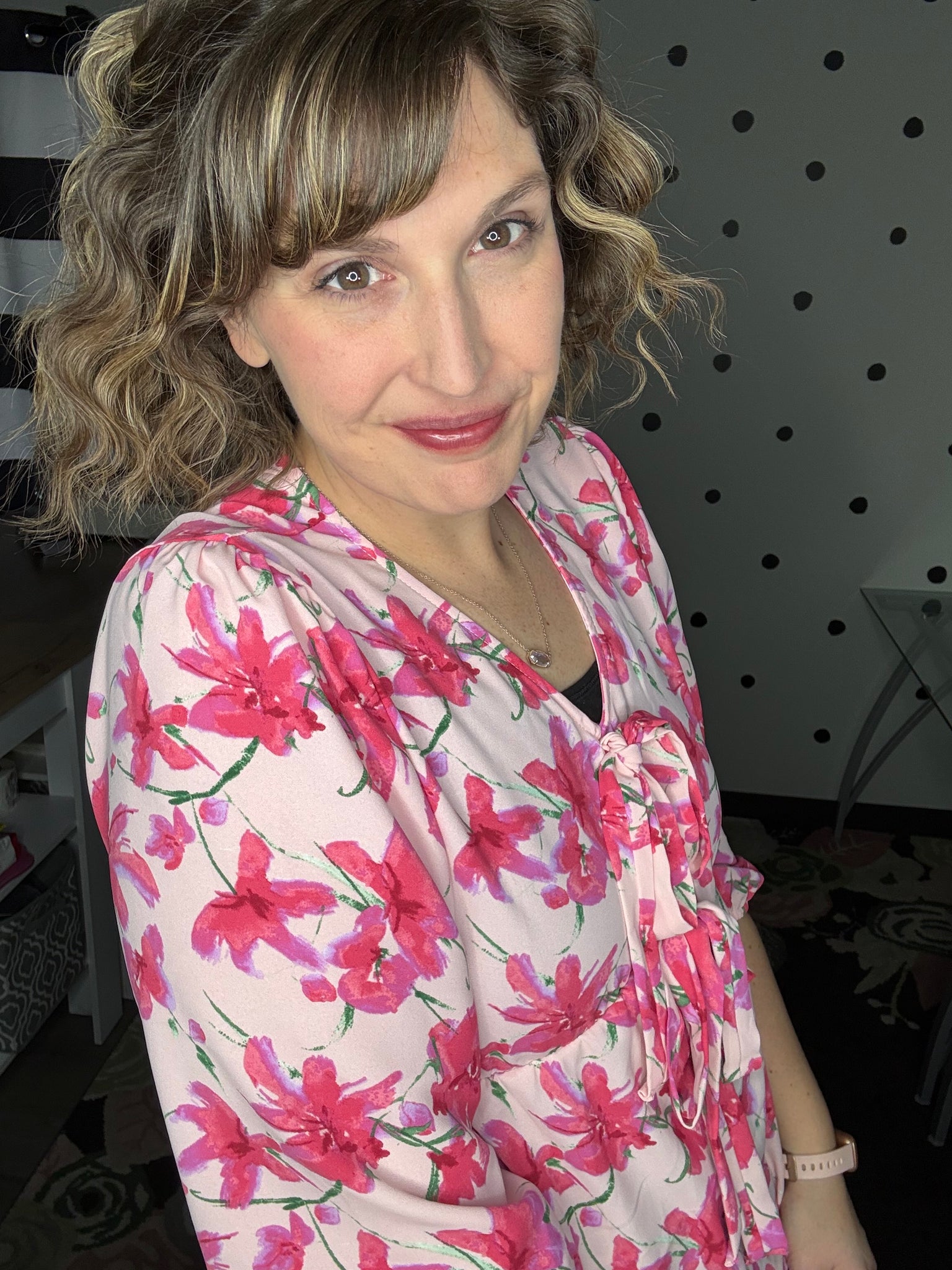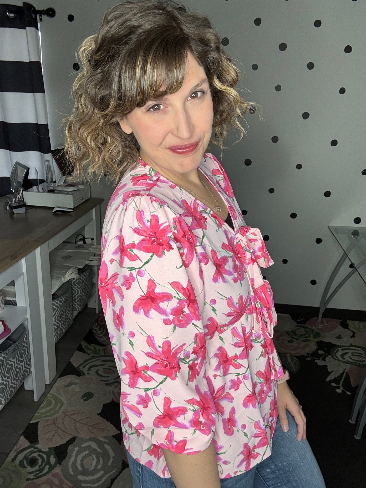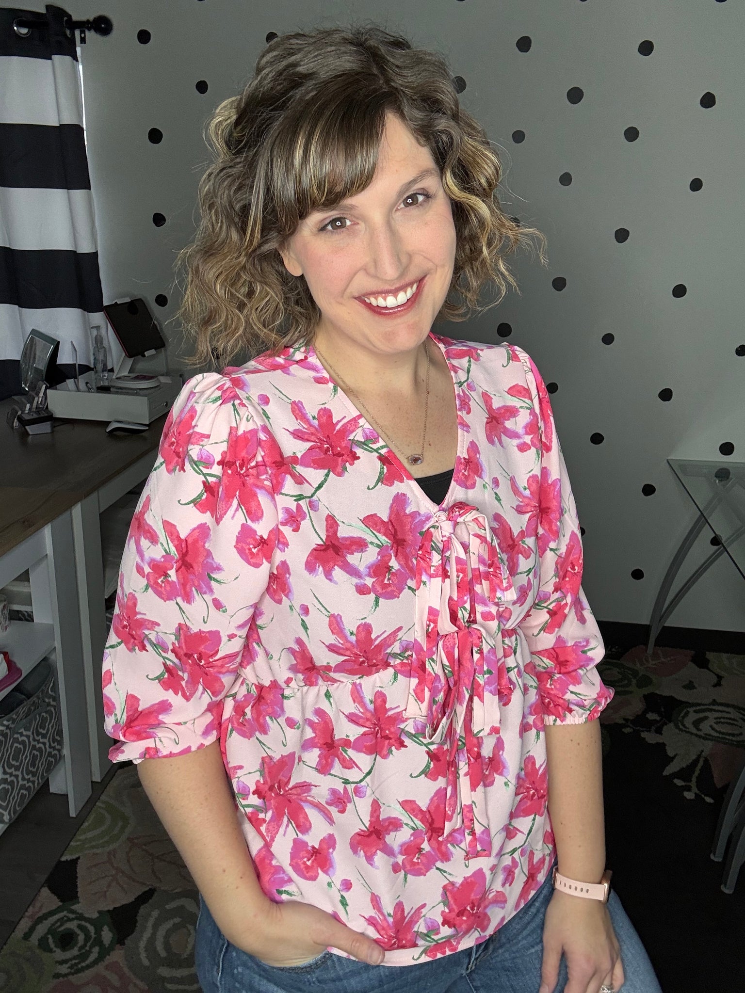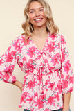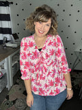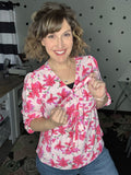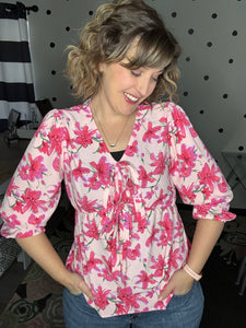 Blush and fuchsia floral blouse with 2 bow details on the front. This 3/4 sleeve top features a v-neck design and babydoll fit. True to size, Alyssa is wearing the medium here. 100% polyester.