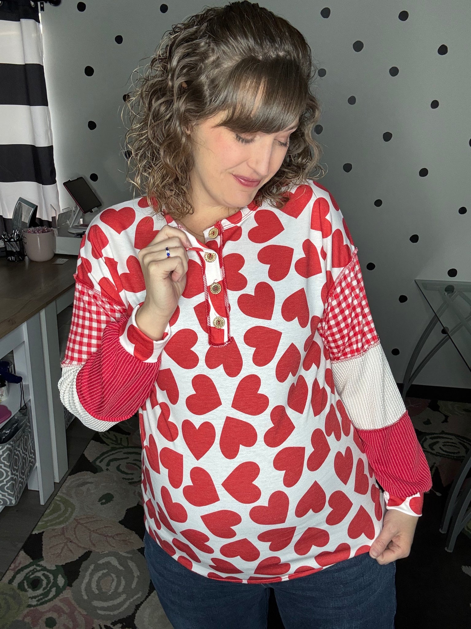 Celebrate Valentine's Day everyday with this adorable color block long sleeve. This top features a red hearts body paired with gingham plaid, oatmeal and red color blocked sleeves. The fit is true to size, relaxed. Alyssa is wearing her normal size medium here.