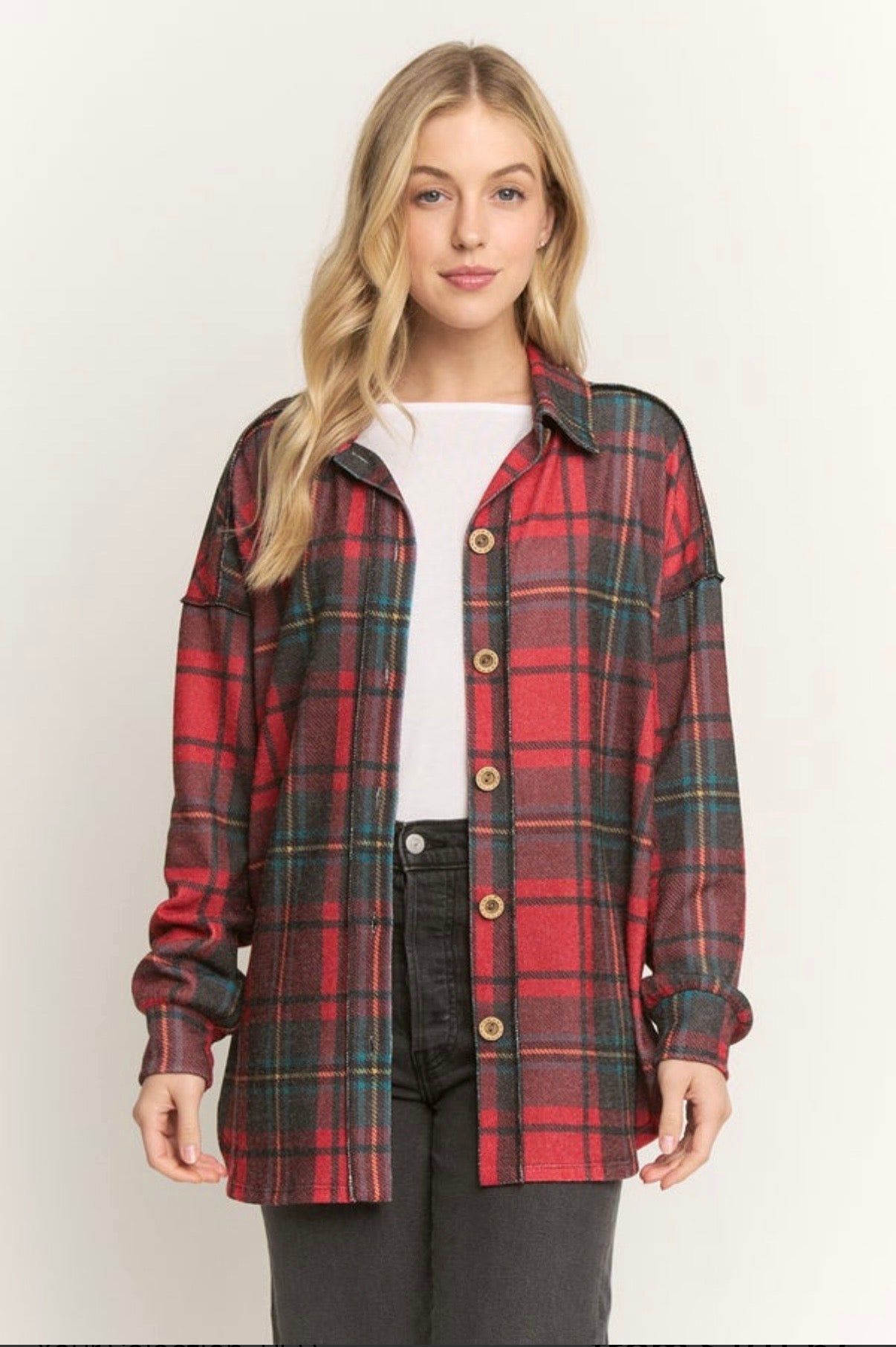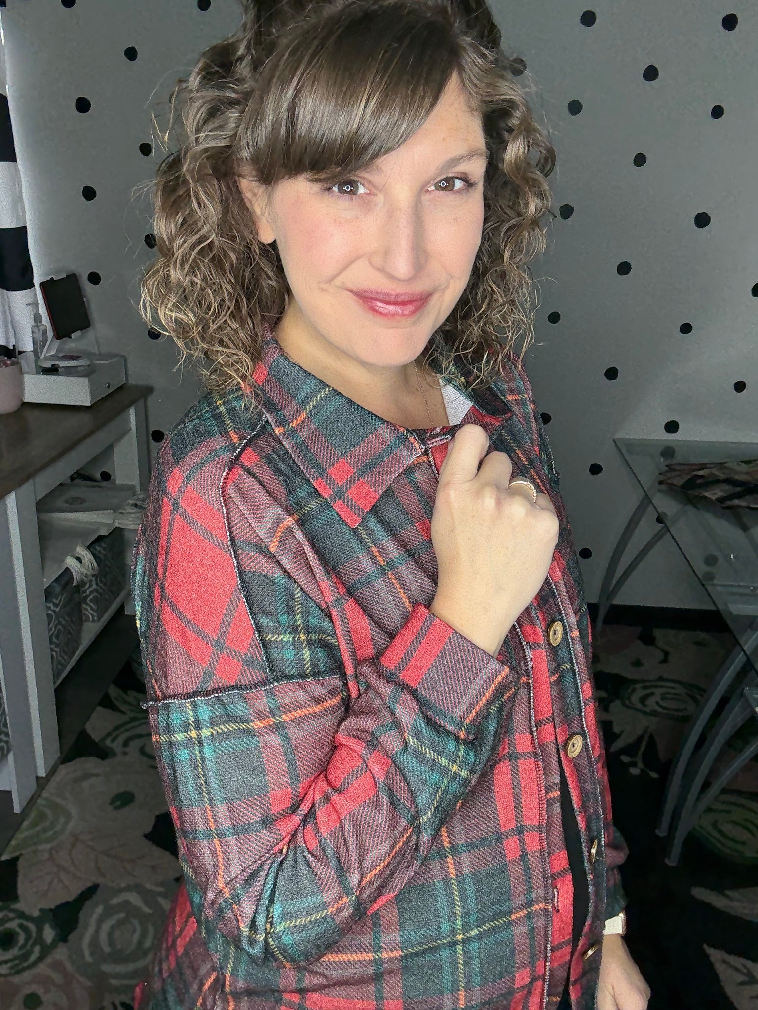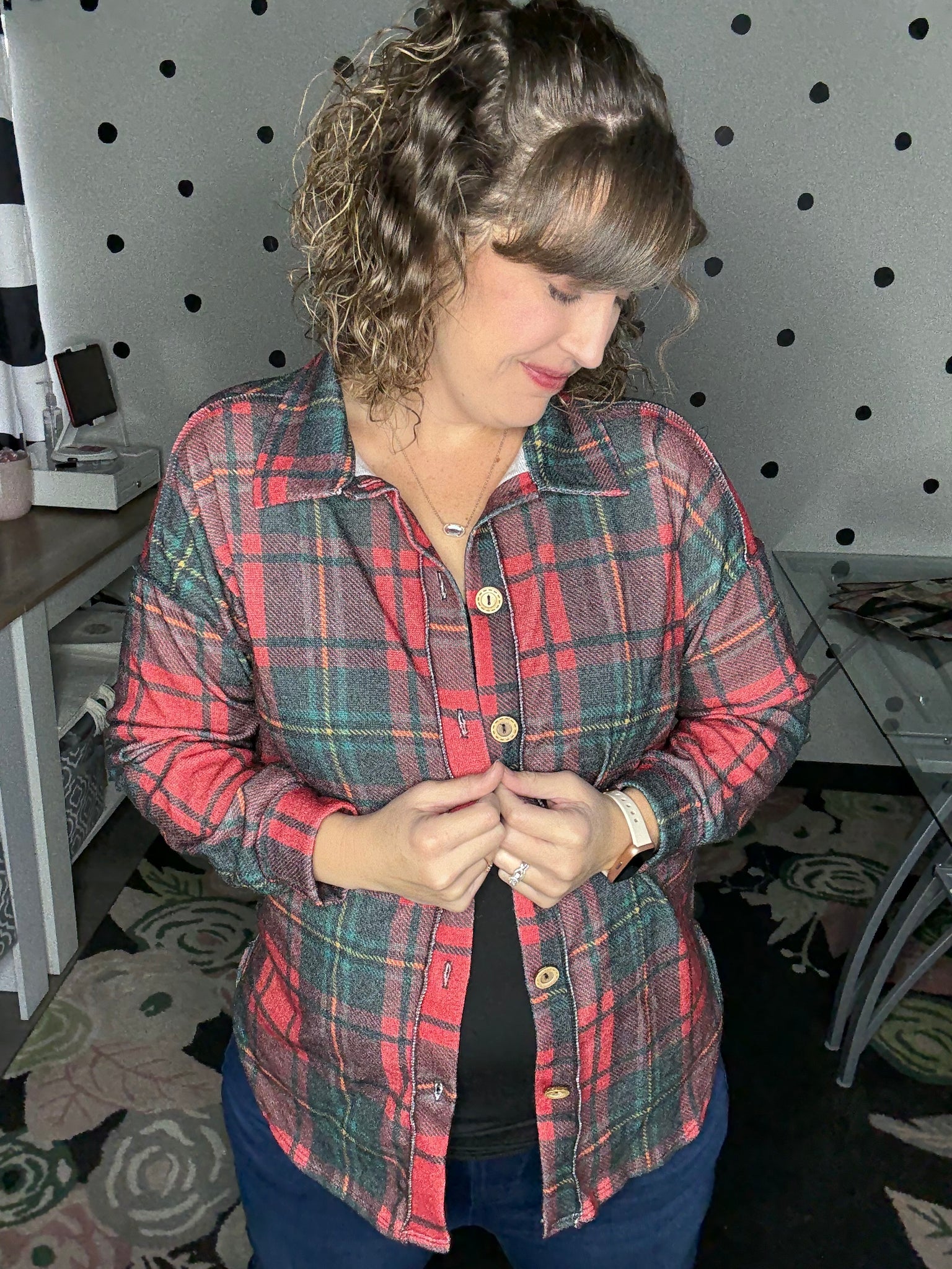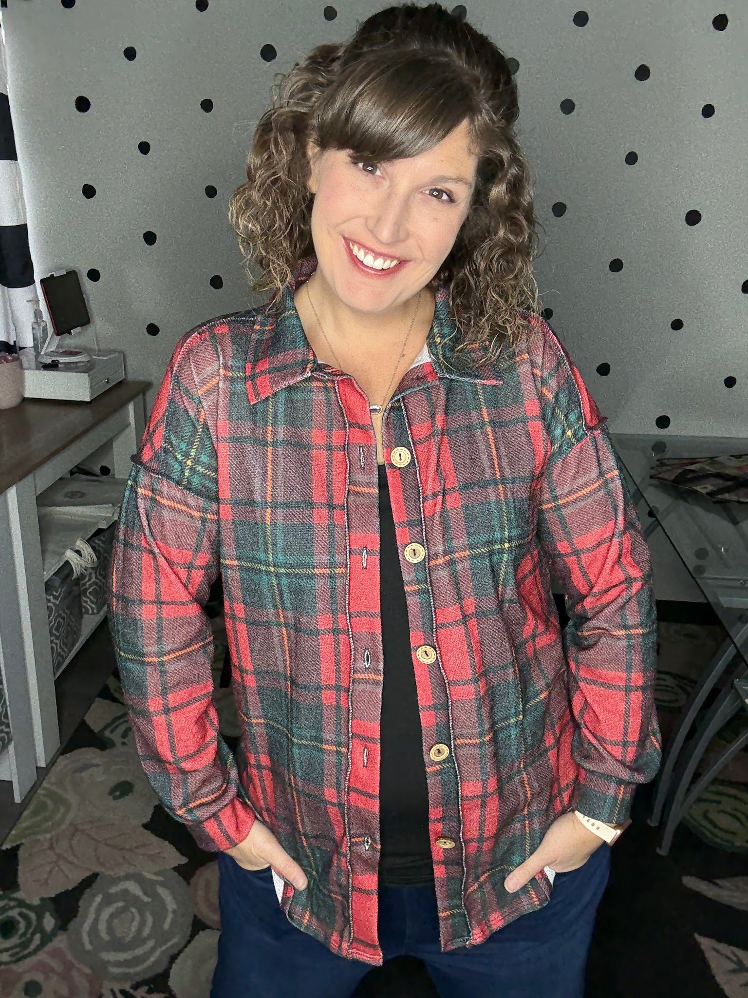 Red, charcoal, and green plaid print on a stretchy and soft knit fabric. This button up shirt is long sleeved and true to size. Alyssa is wearing a medium here.