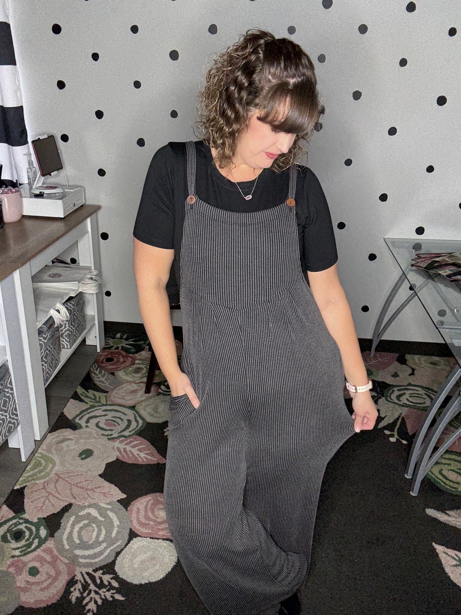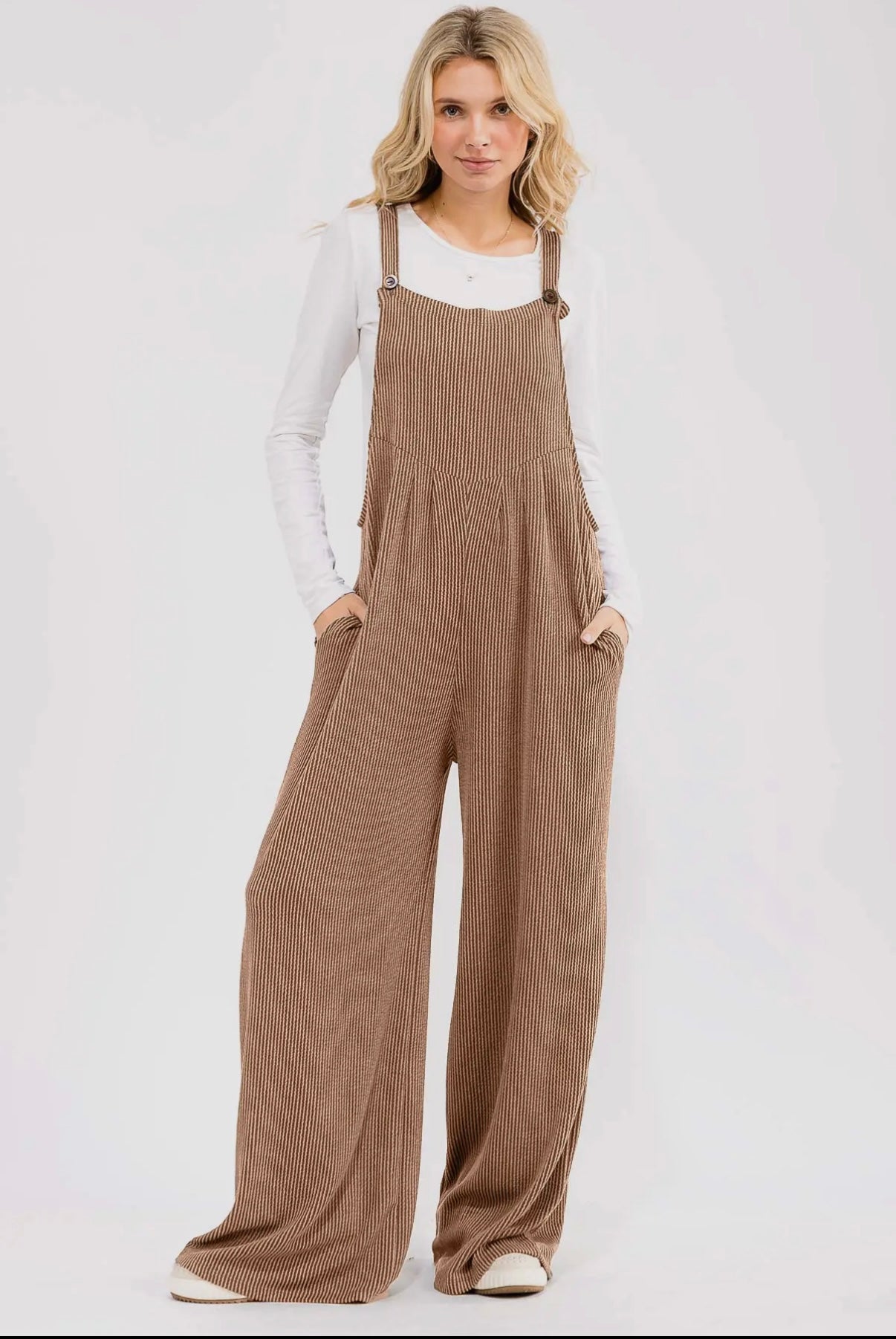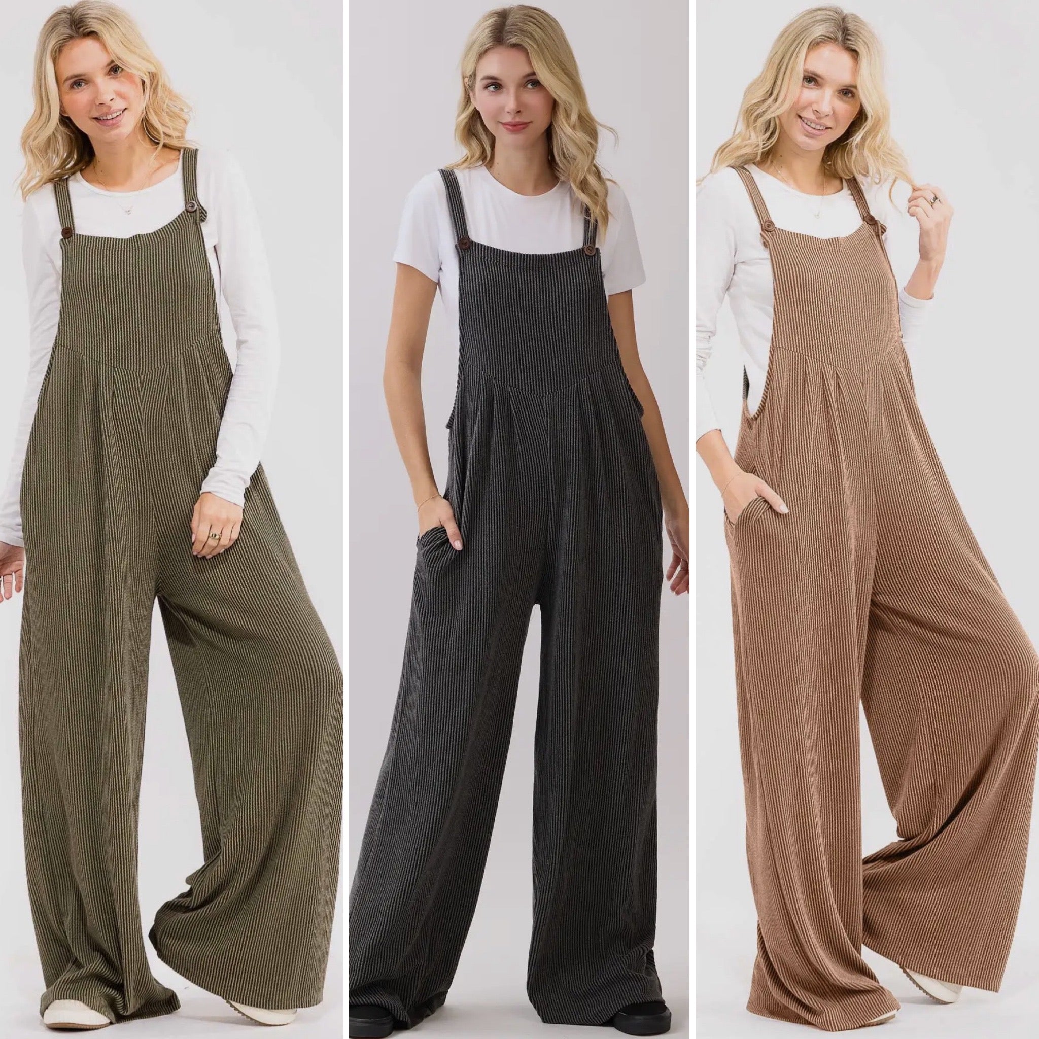 Solid ribbed knit fabric in a wide leg style jumpsuit. These overalls feature button straps, side pockets and a true to size relaxed fit. Fabric is 88% polyester 8% rayon 4% spandex. The inseam length is 28" from crotch to hem.