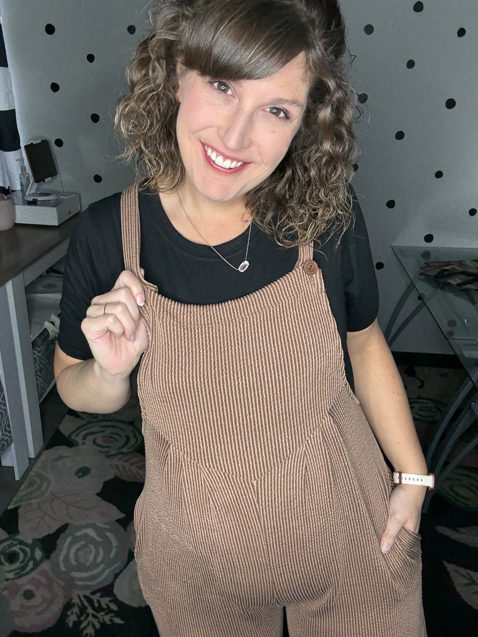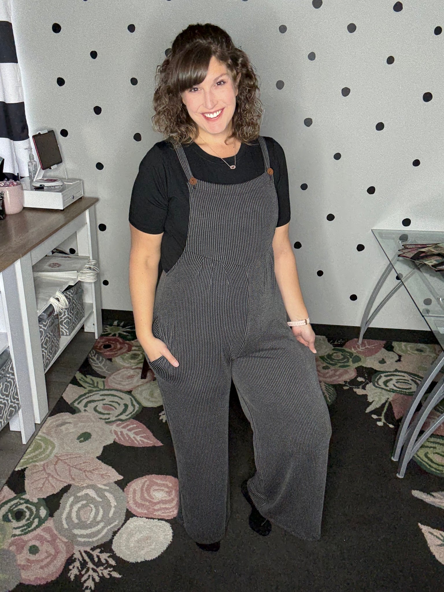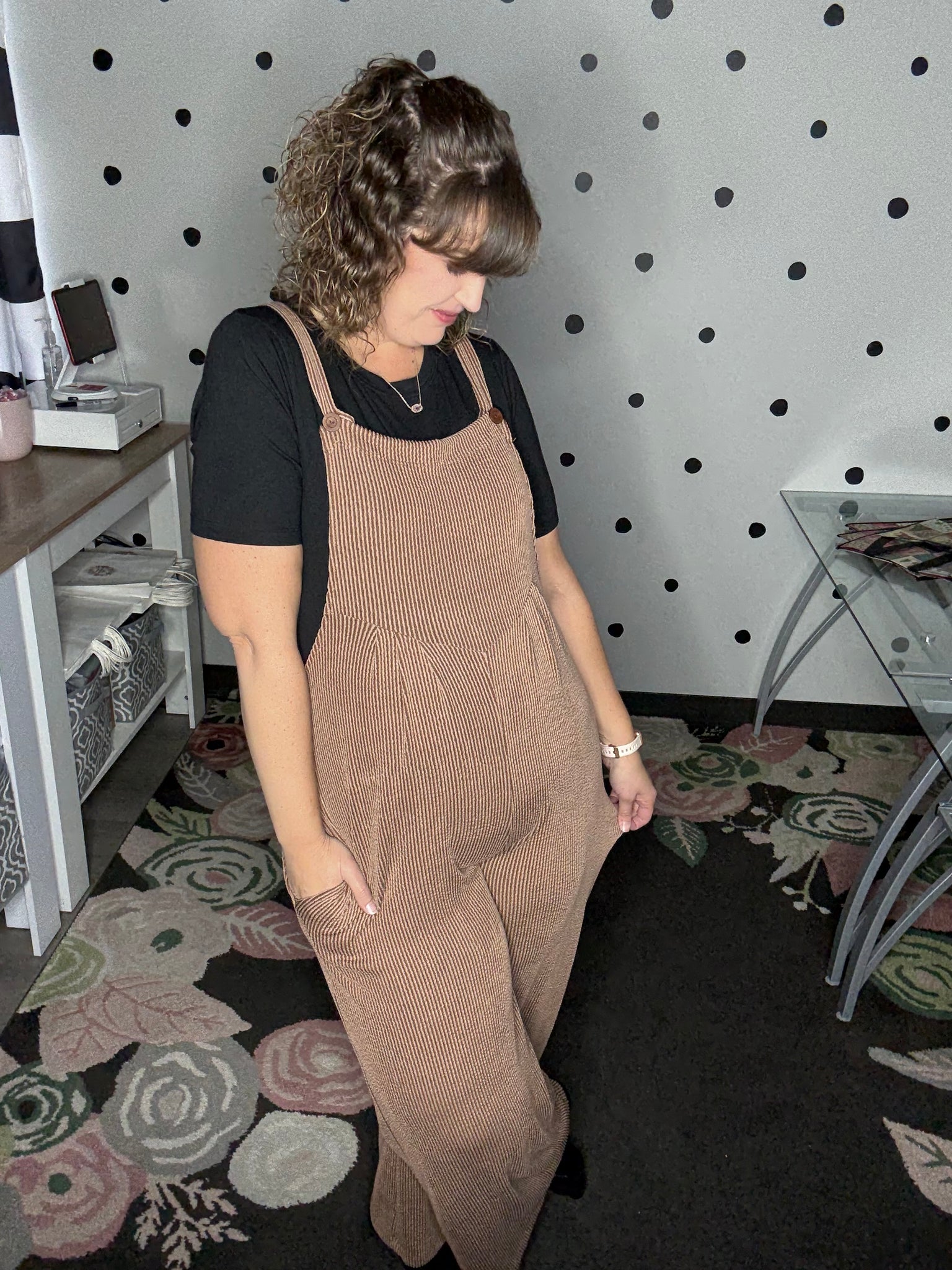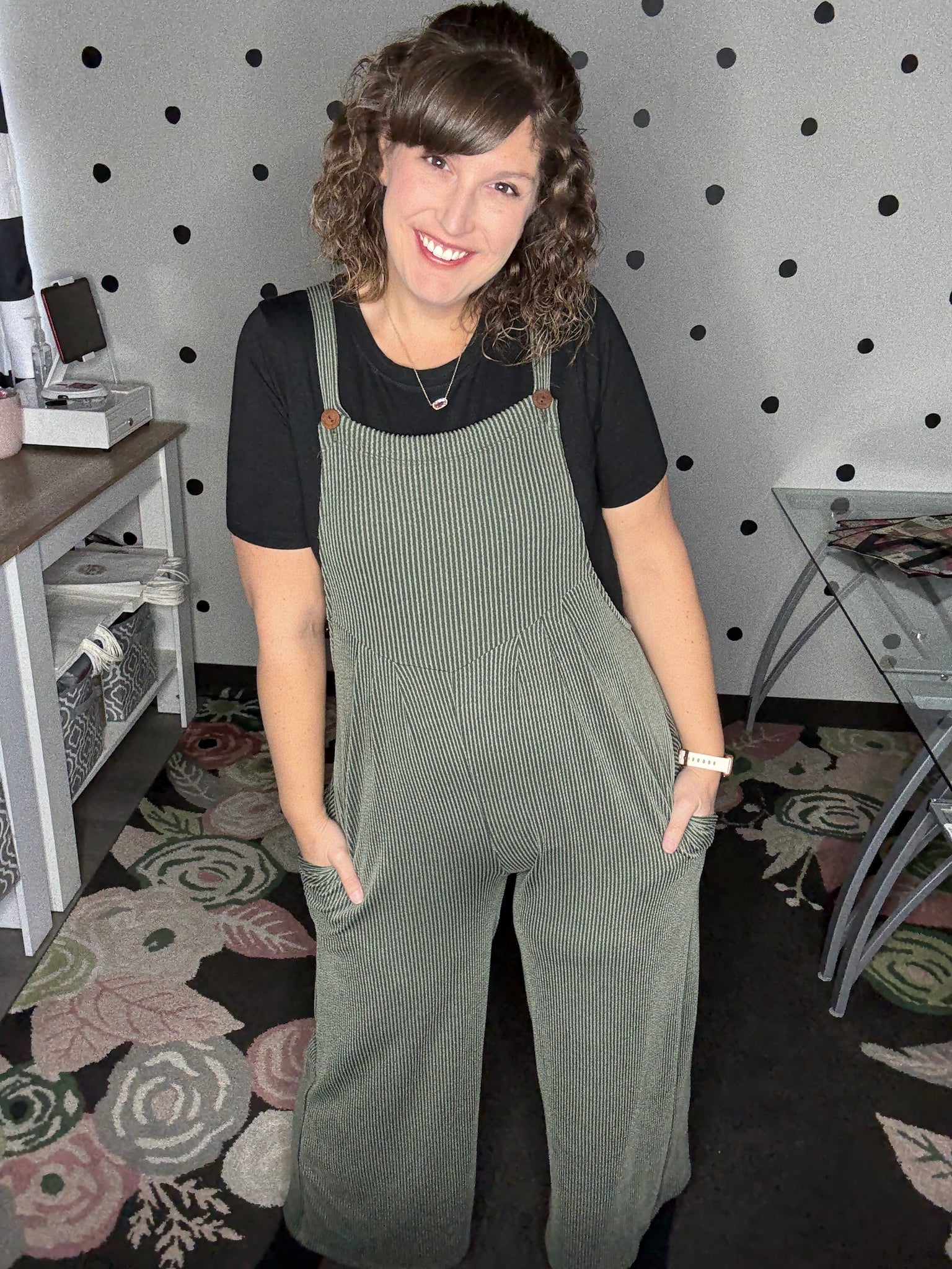 Solid ribbed knit fabric in a wide leg style jumpsuit. These overalls feature button straps, side pockets and a true to size relaxed fit. Fabric is 88% polyester 8% rayon 4% spandex. The inseam length is 28" from crotch to hem.