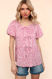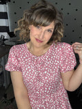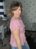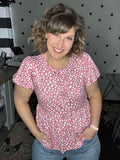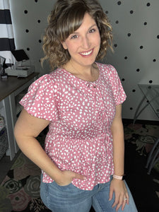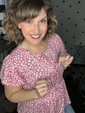 Super soft rose spotted top with puff short sleeves and a babydoll/peplum design. This round neck tee features black bow details down the front and a true to size fit. Alyssa is wearing a medium here.