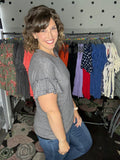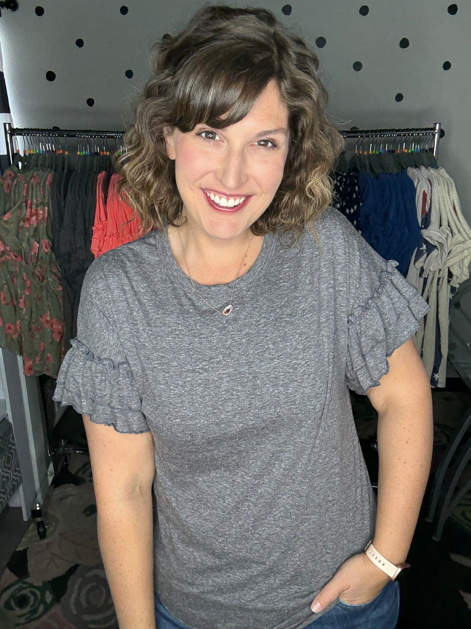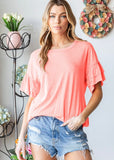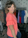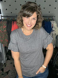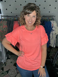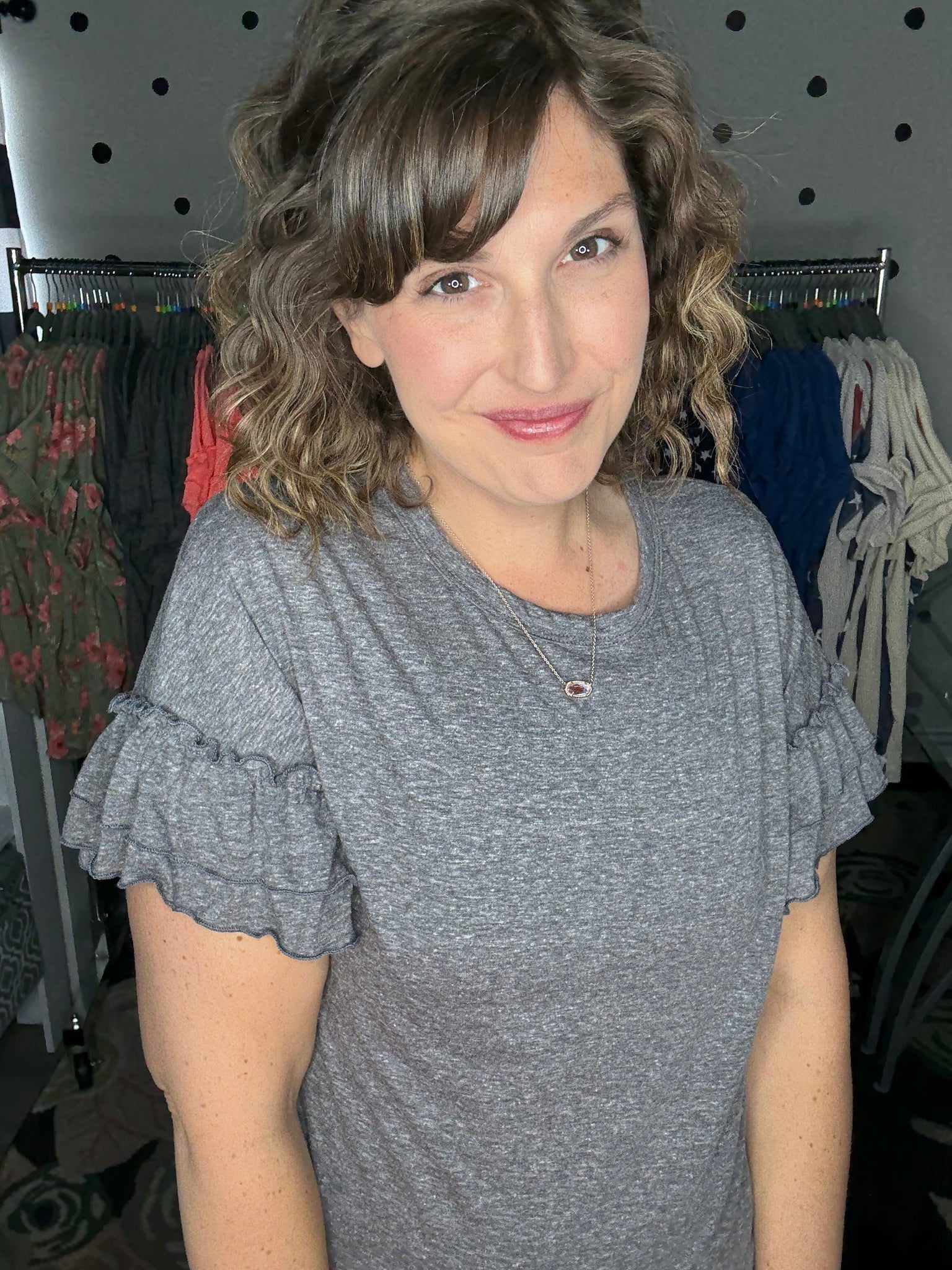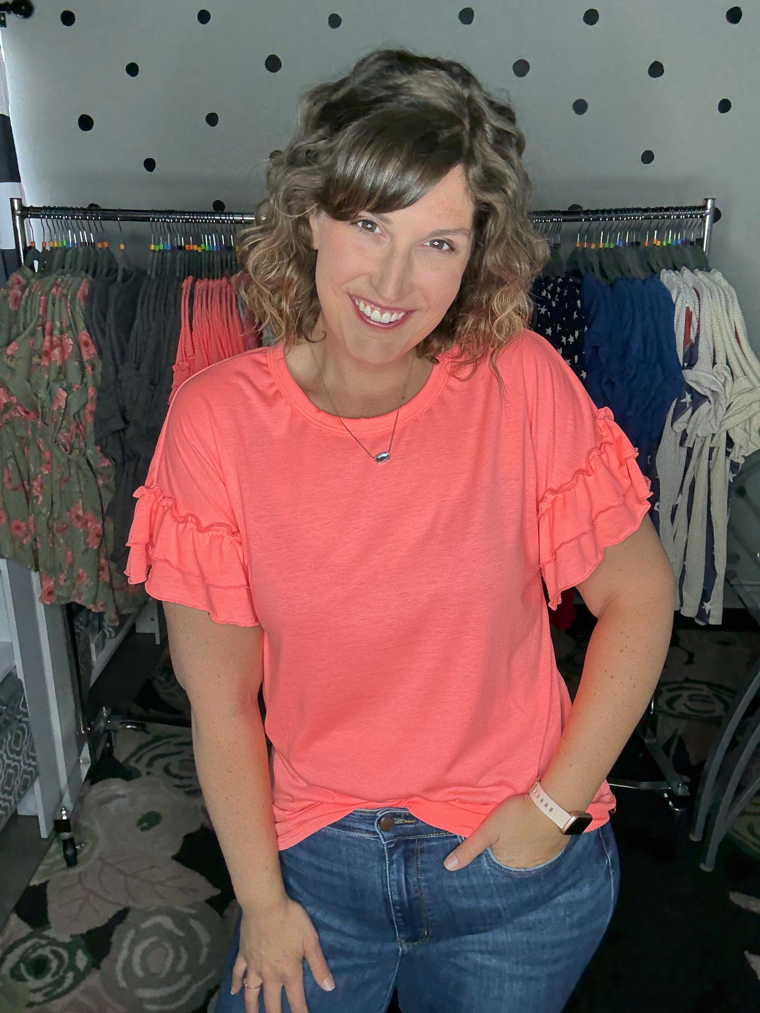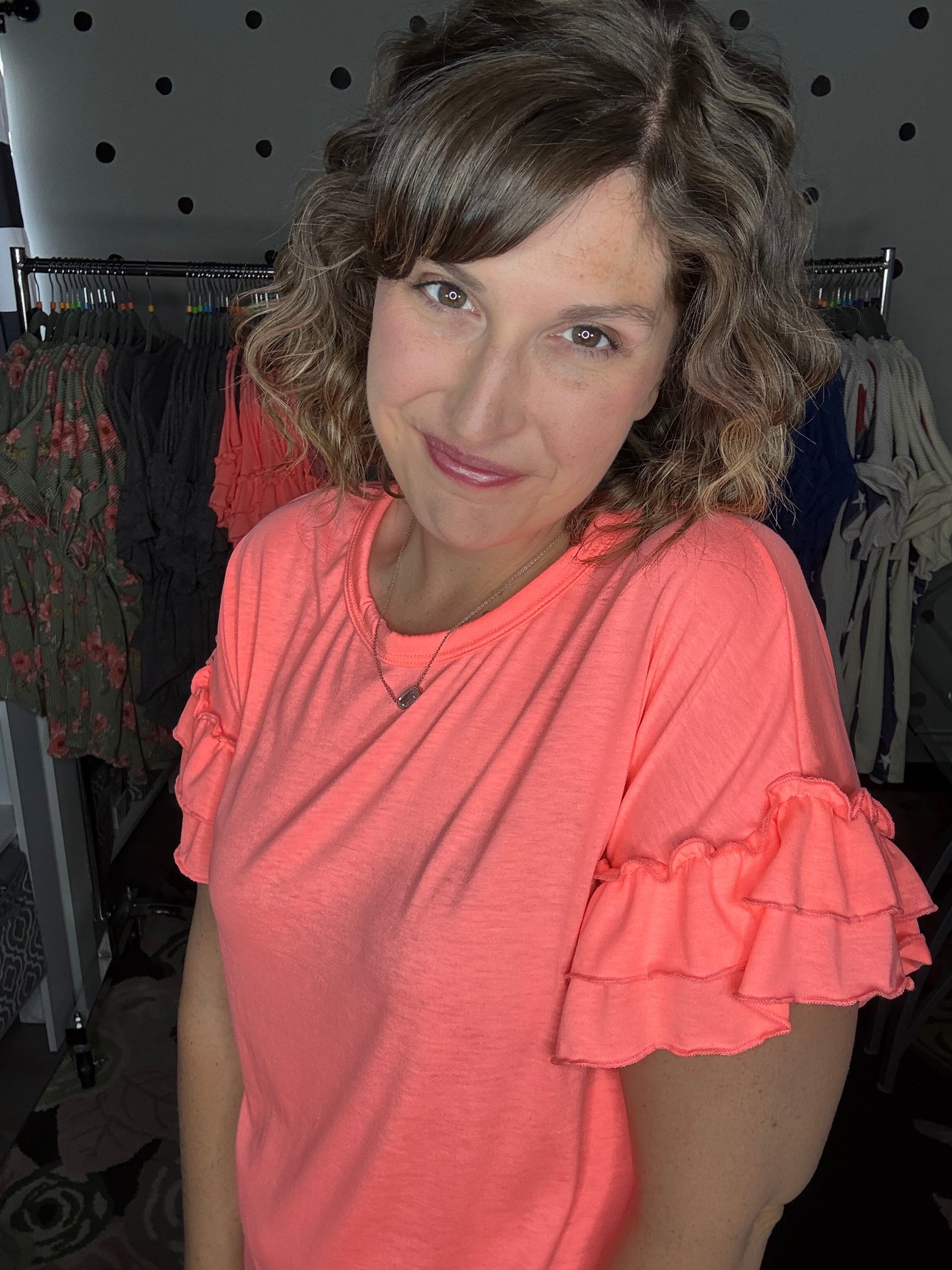 Slub knit tri-blend fabric available in neon coral or charcoal grey. This round neck tee features a ruffle short sleeve and a true to size fit. Alyssa is wearing a medium here.