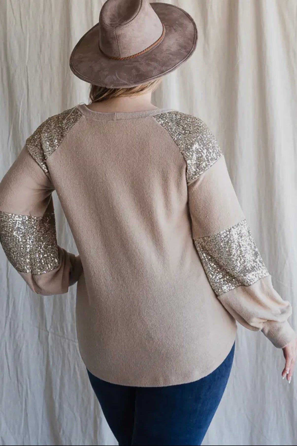 A super soft brushed sweater knit in a classic taupe color. This long sleeve top features a sparkly sequin contrast design. Curved hem, round neck, and true to size fit. Alyssa is wearing a medium here.