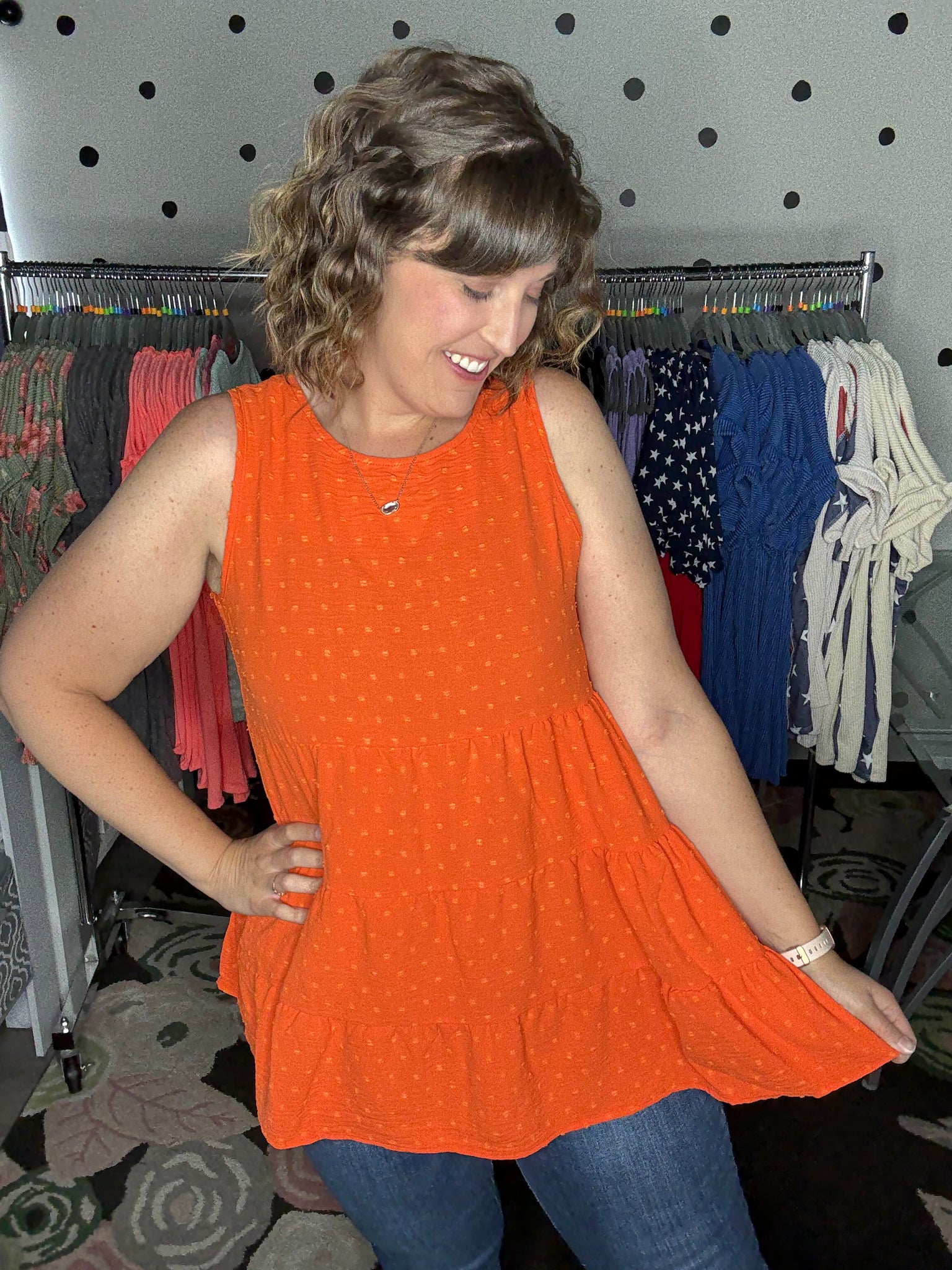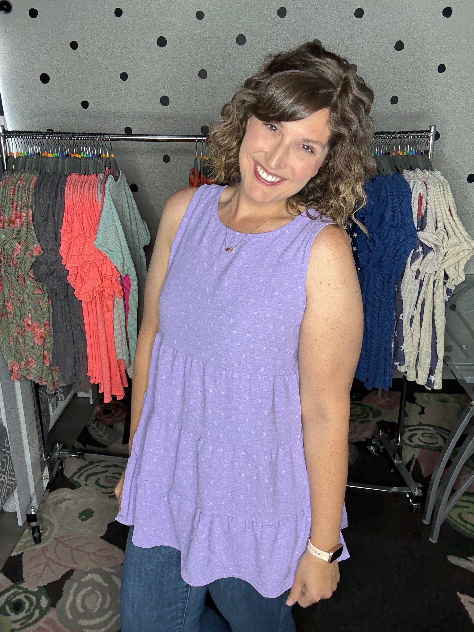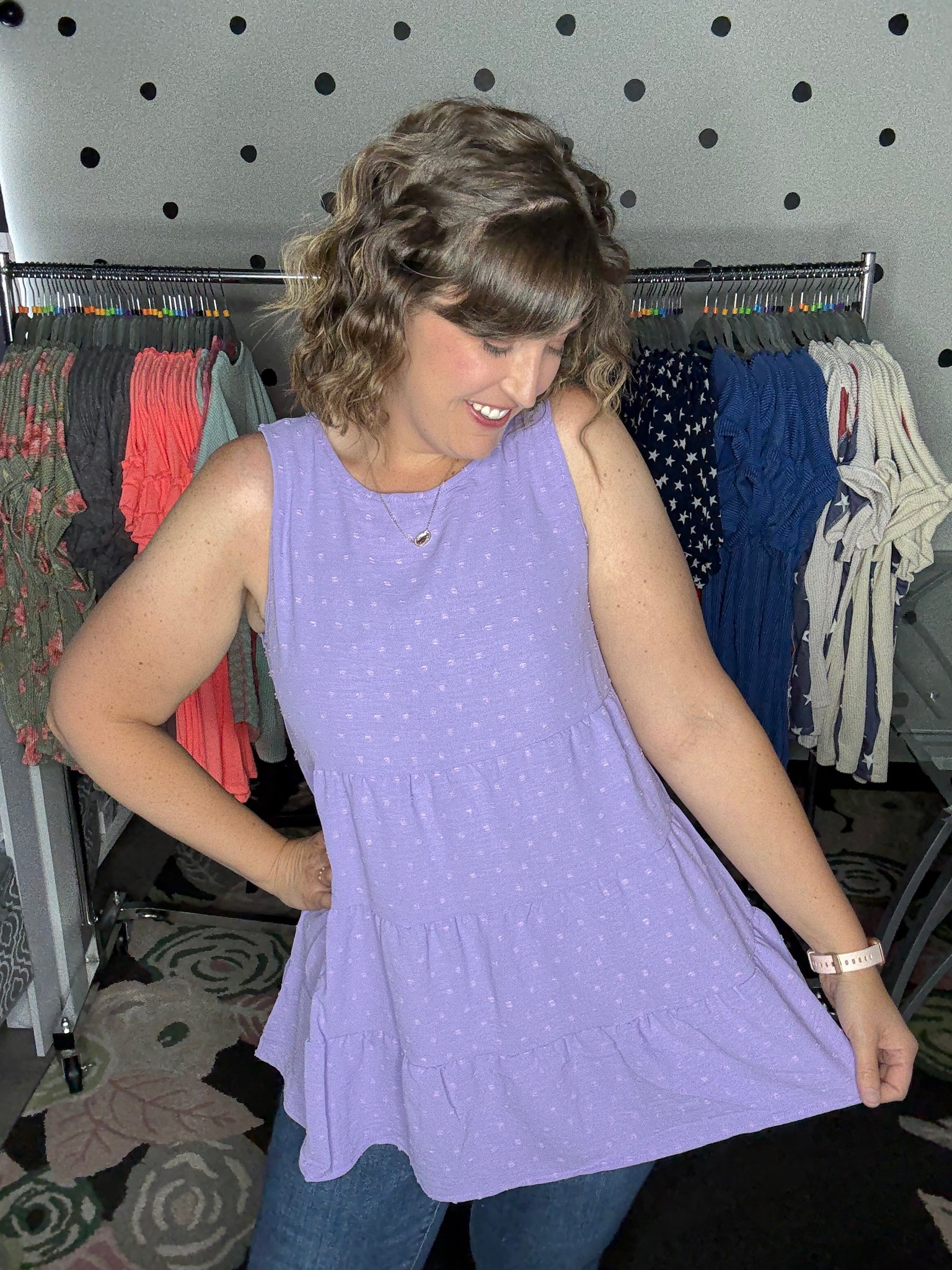 Enjoy 3 awesome colors in this swiss dot tank top. This sleeveless babydoll features a tiered design and a raised swiss dot woven fabric. 100% polyester. Relaxed fit. Alyssa is wearing a medium in all colors.