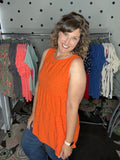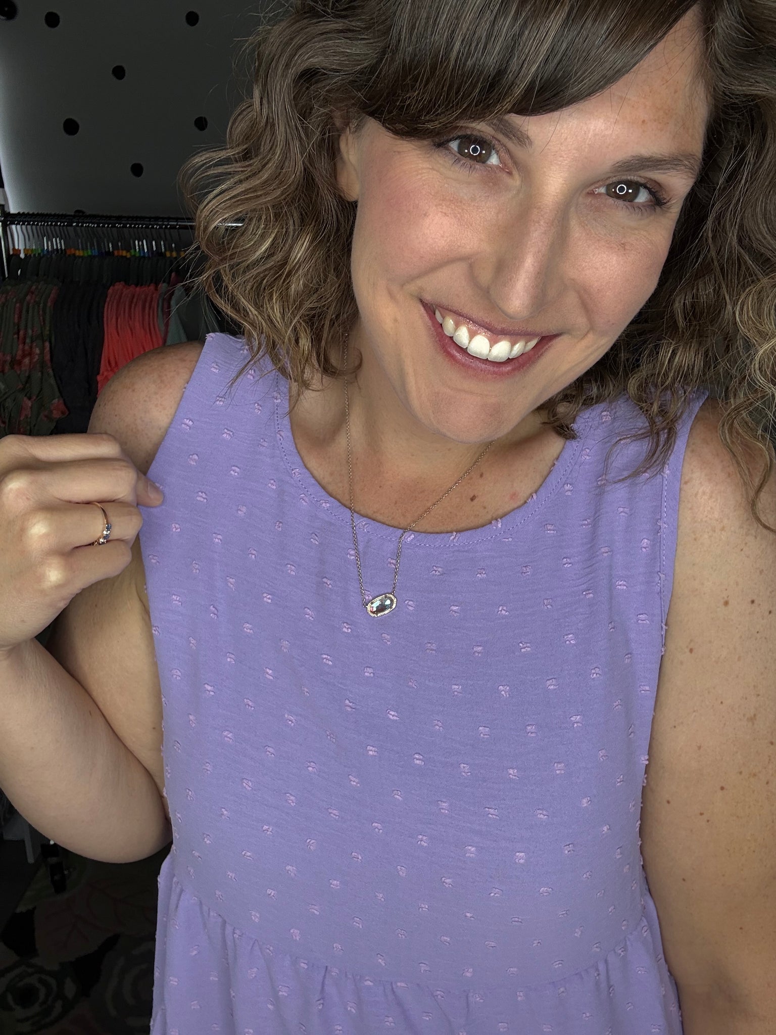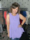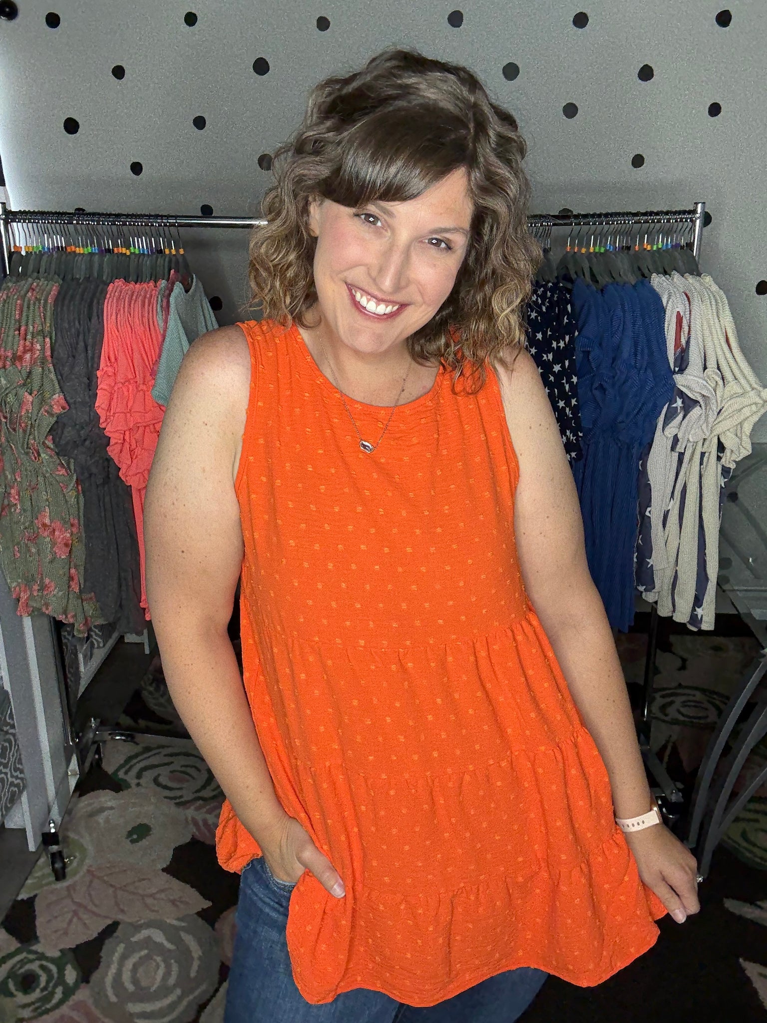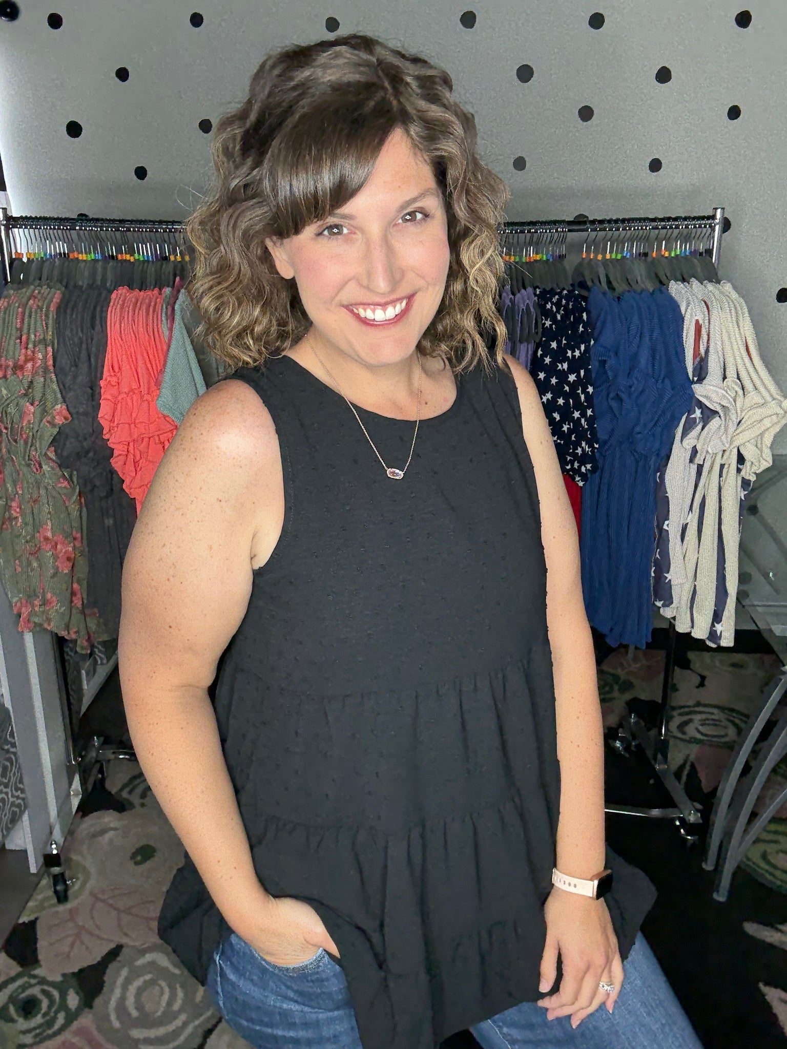 Enjoy 3 awesome colors in this swiss dot tank top. This sleeveless babydoll features a tiered design and a raised swiss dot woven fabric. 100% polyester. Relaxed fit. Alyssa is wearing a medium in all colors.