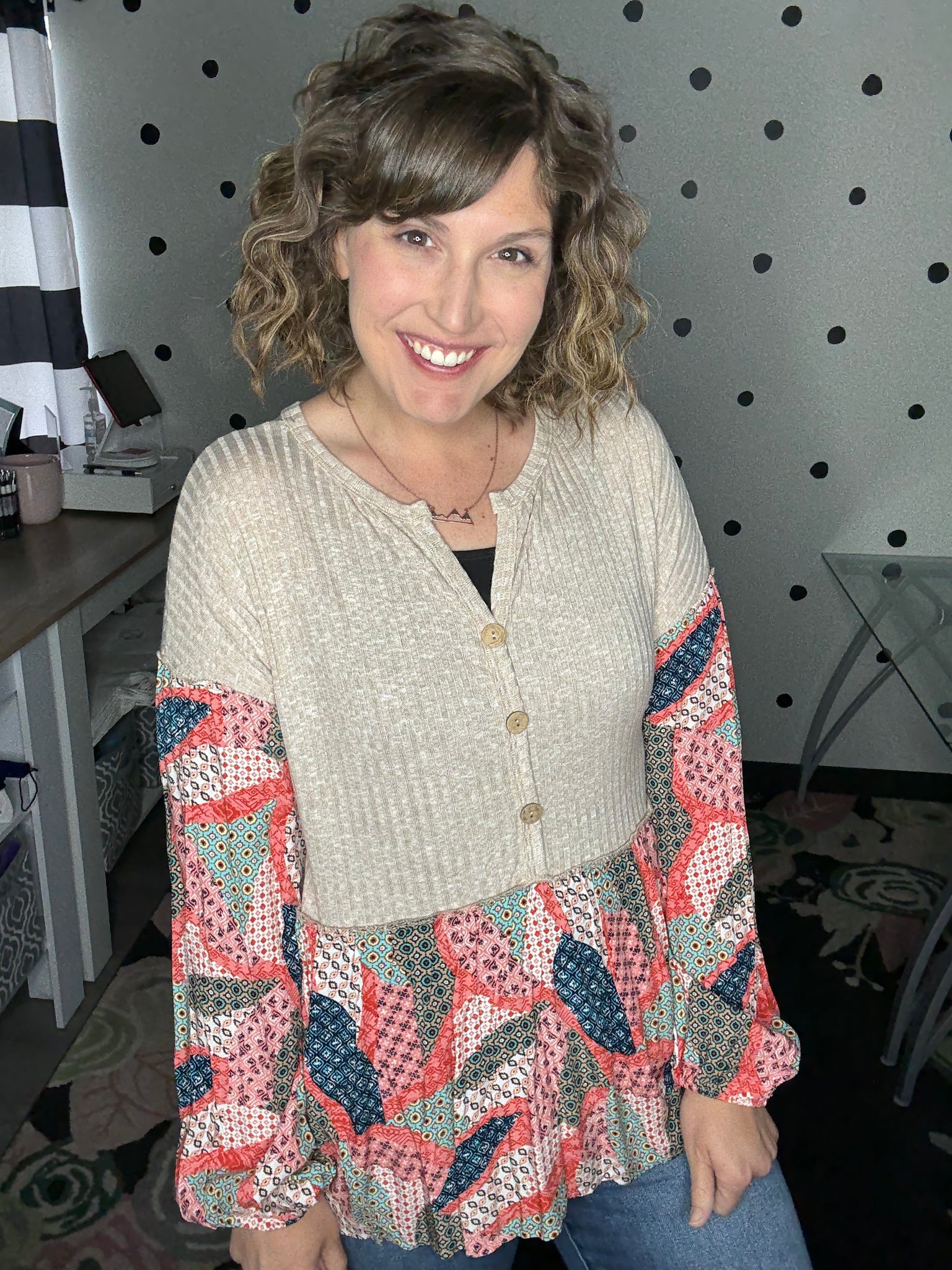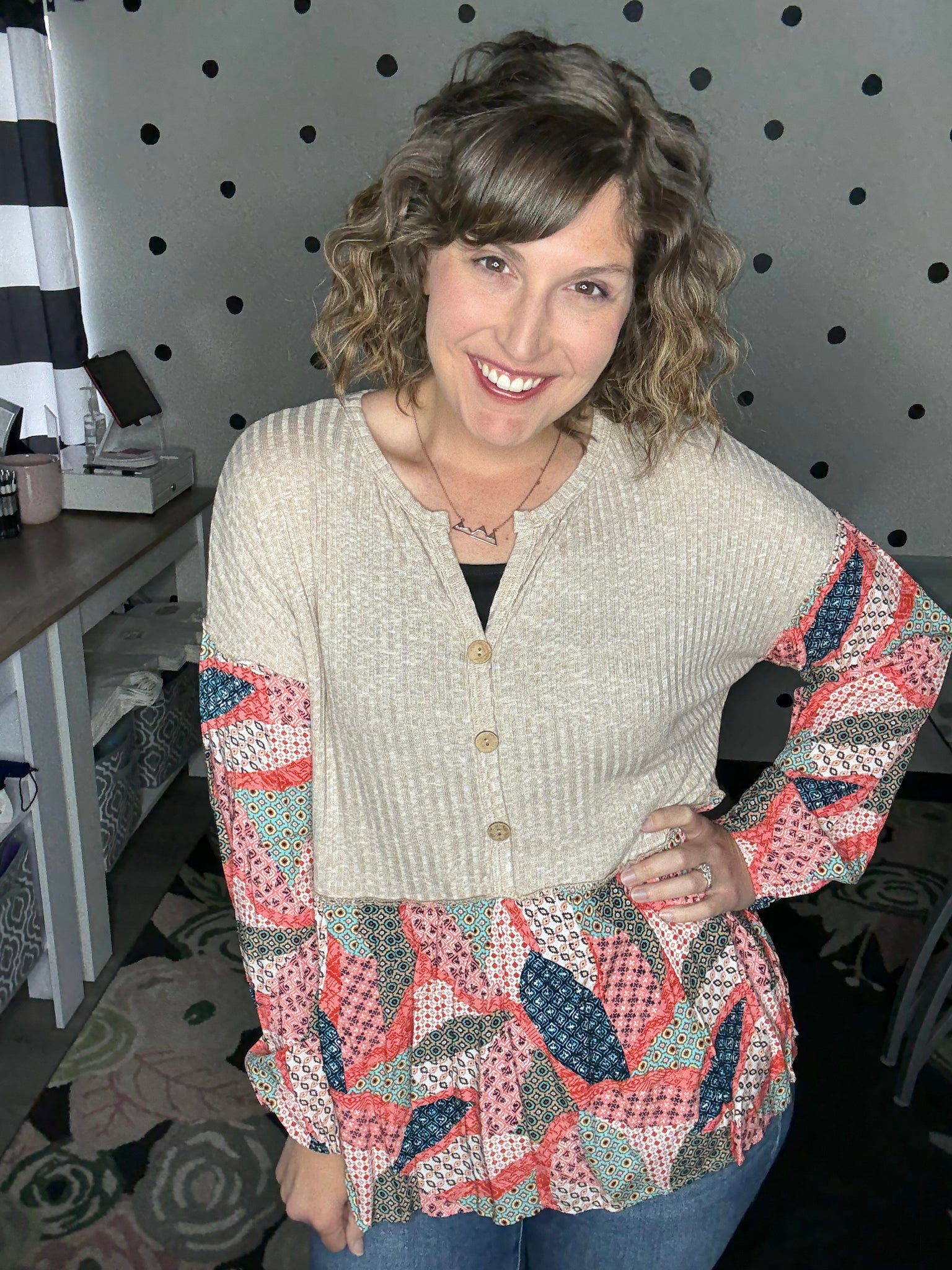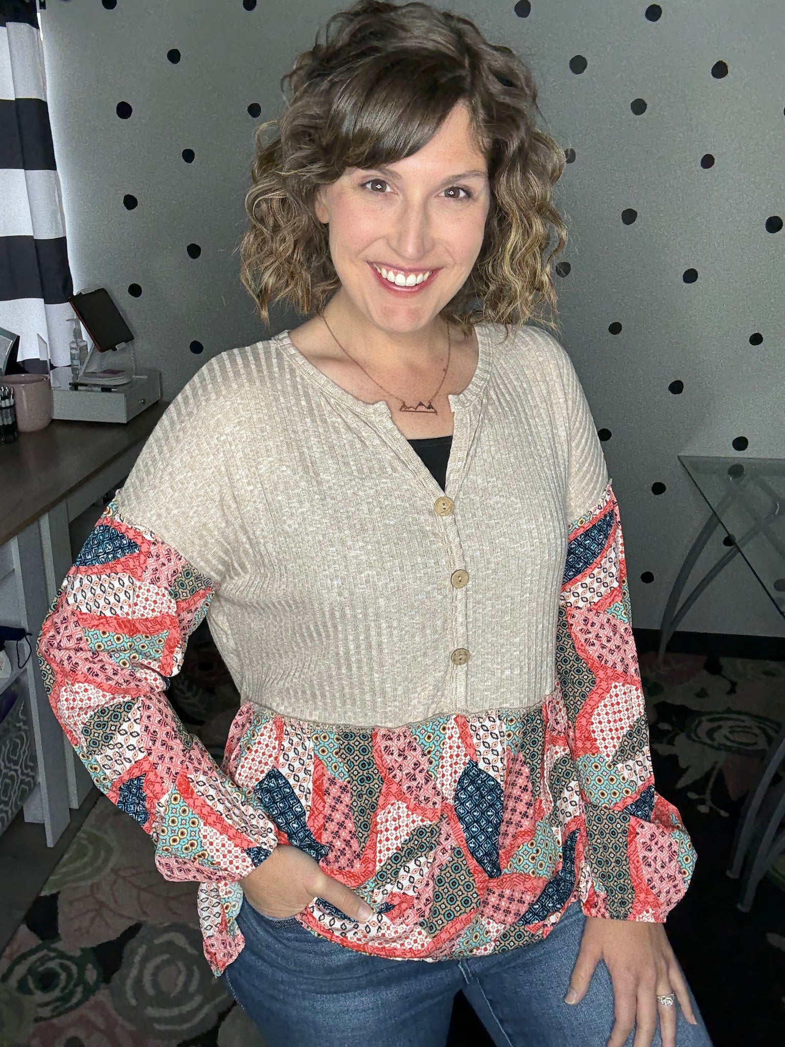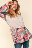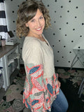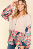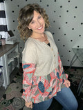 Such a soft and lightweight long sleeve top! This one is giving bohemian vibes with it's taupe rubbed fabric, balloon sleeves, babydoll design, and patchwork print. The fit is very relaxed, Alyssa is wearing a medium here and could easily size down to the small.