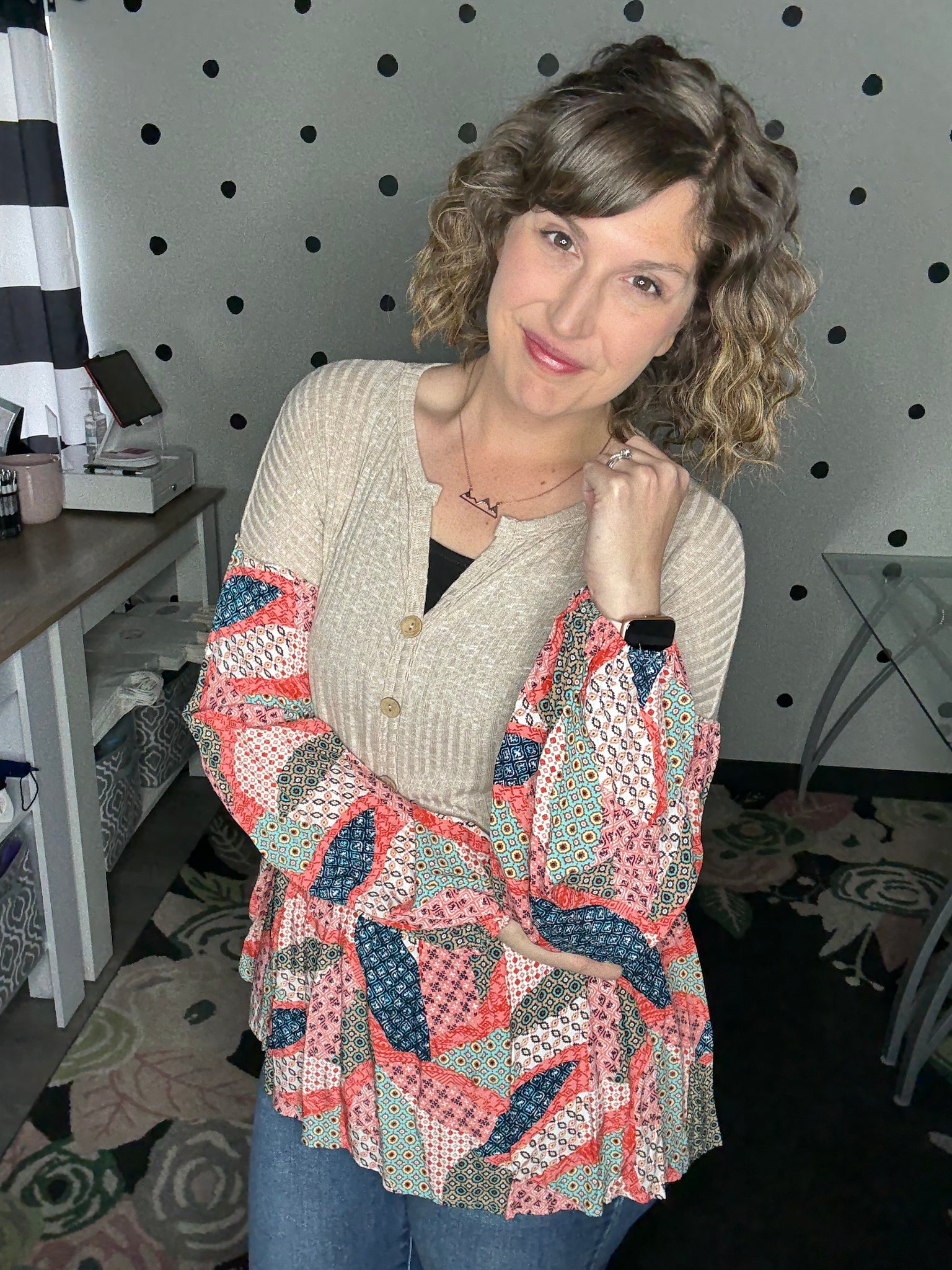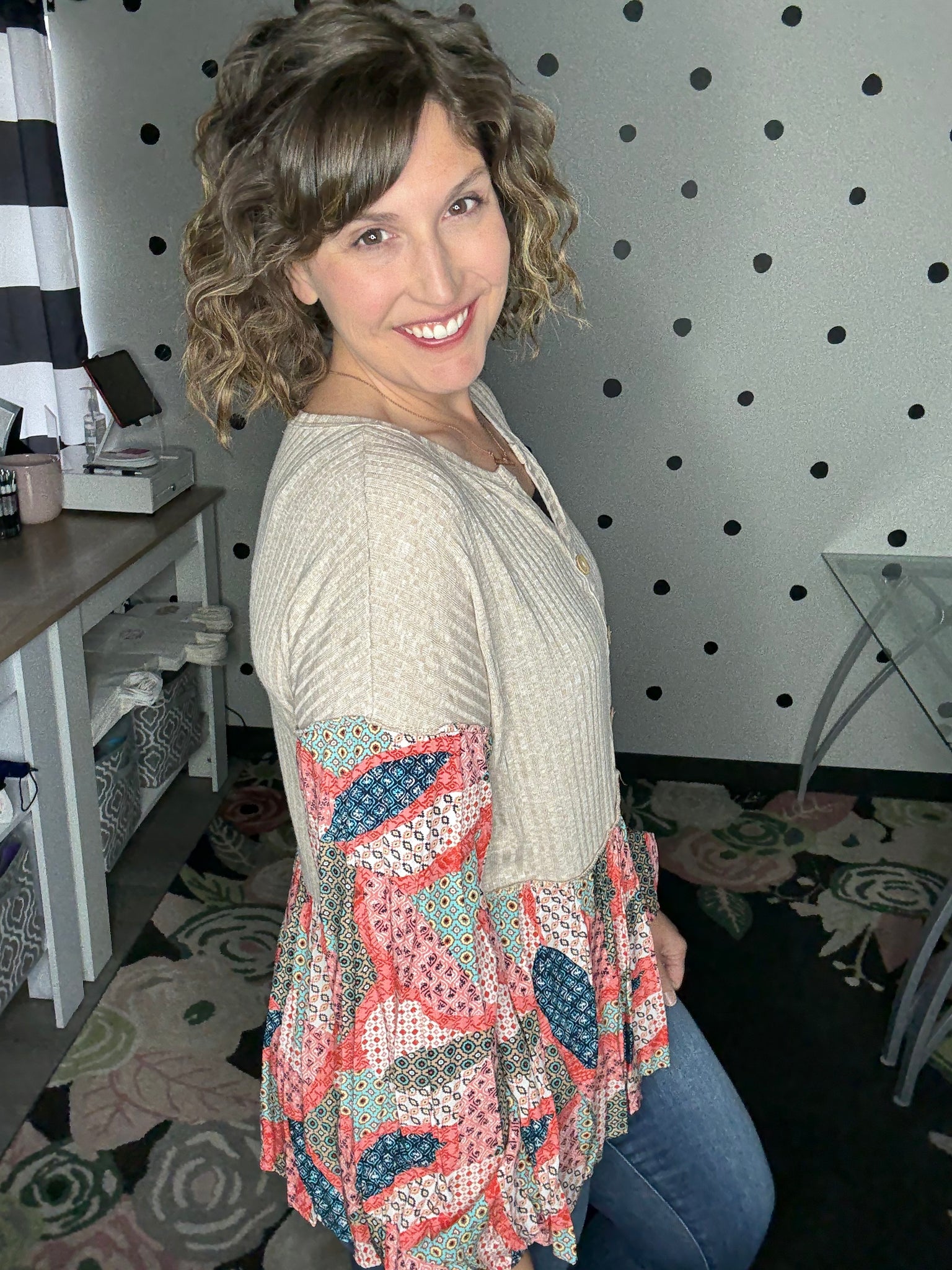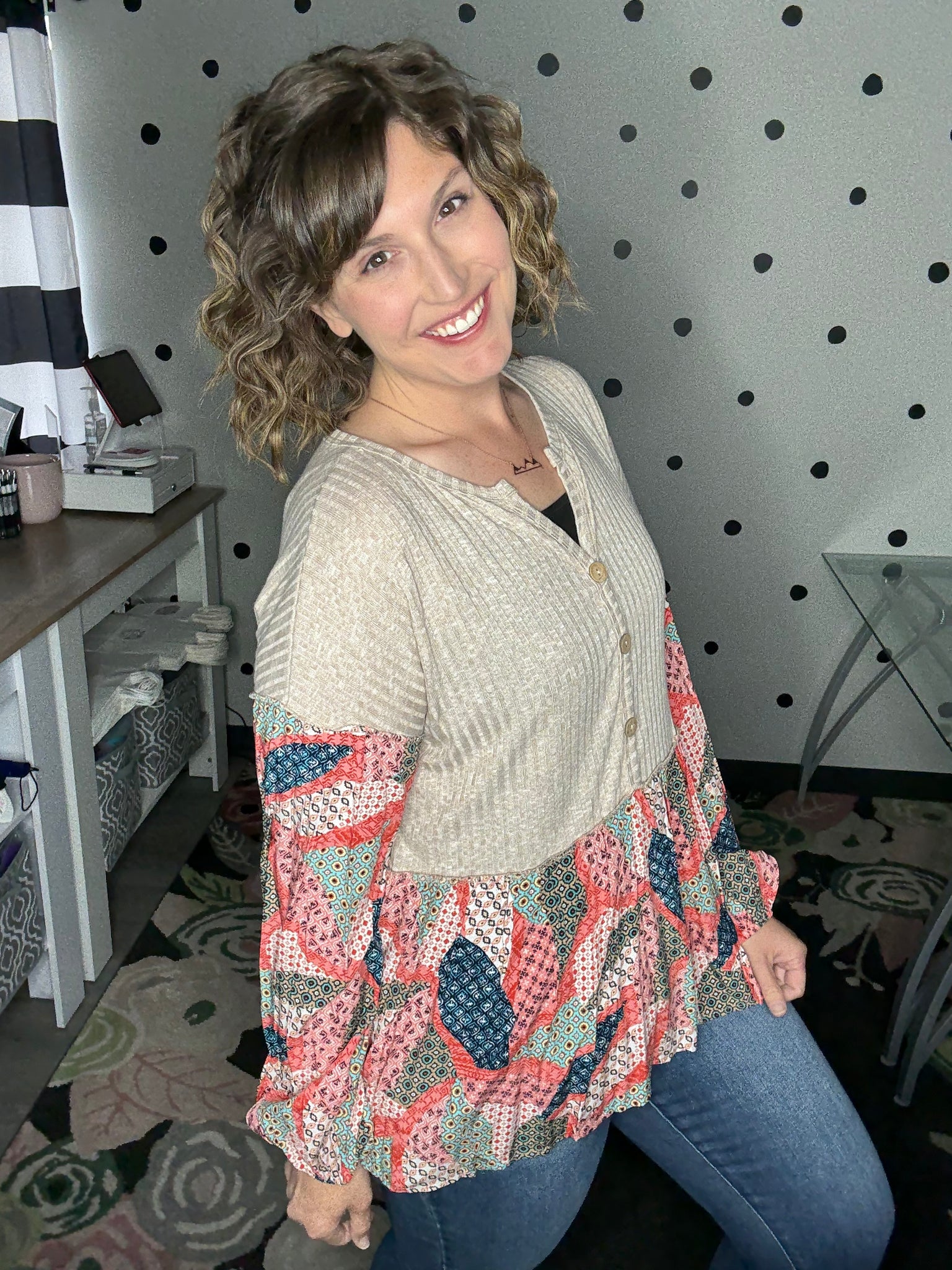 Such a soft and lightweight long sleeve top! This one is giving bohemian vibes with it's taupe rubbed fabric, balloon sleeves, babydoll design, and patchwork print. The fit is very relaxed, Alyssa is wearing a medium here and could easily size down to the small.