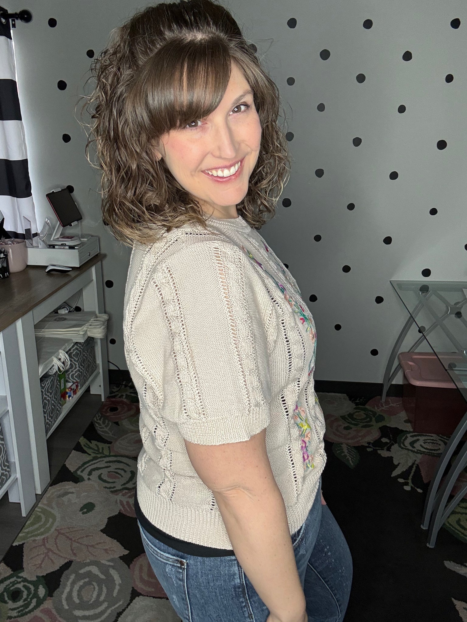 Enjoy the beautiful details on this short sleeve taupe sweater such as the embroidered floral design or the cable knit pattern. This round neck sweater features short sleeves and a true to size fit. Alyssa is wearing a medium here.