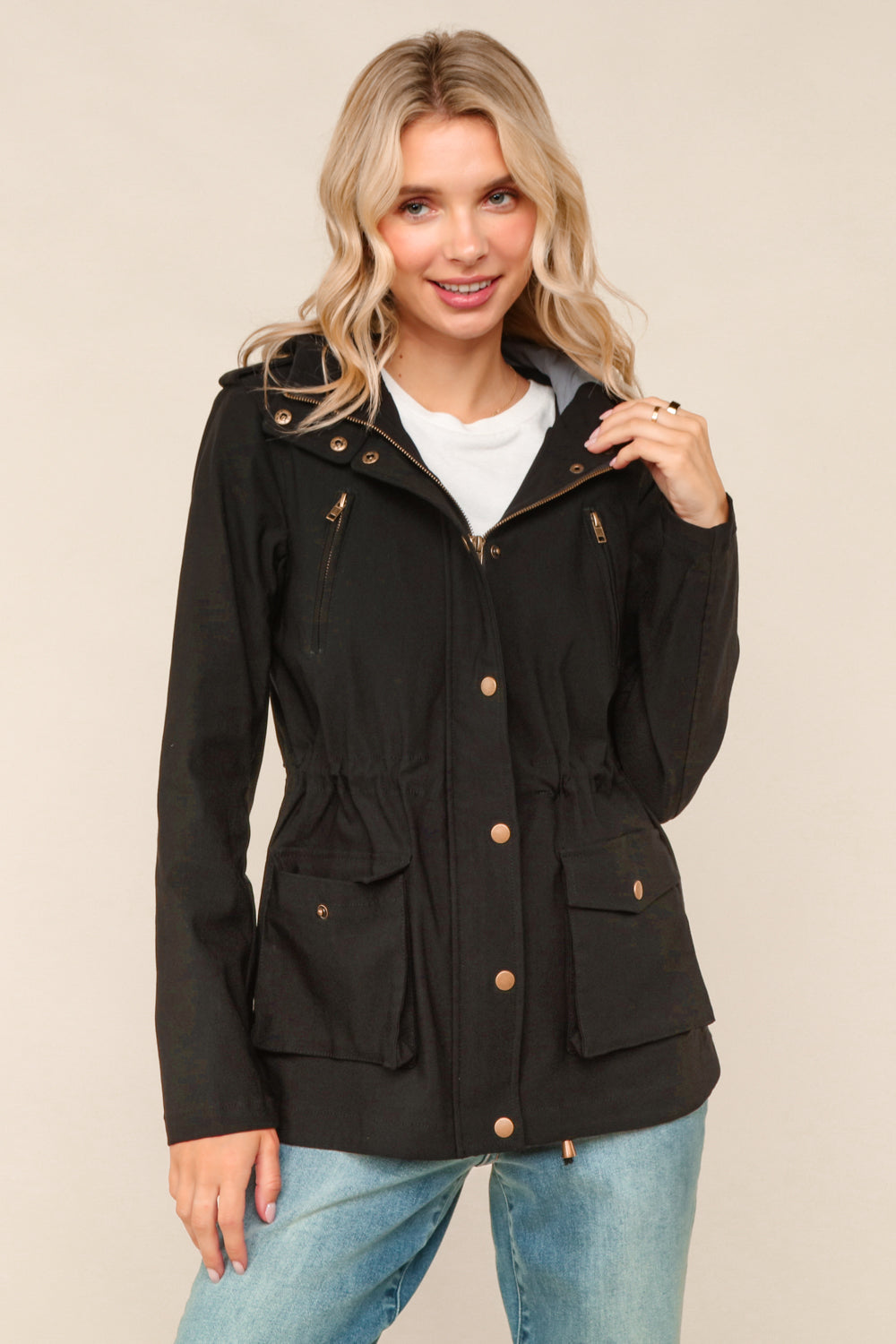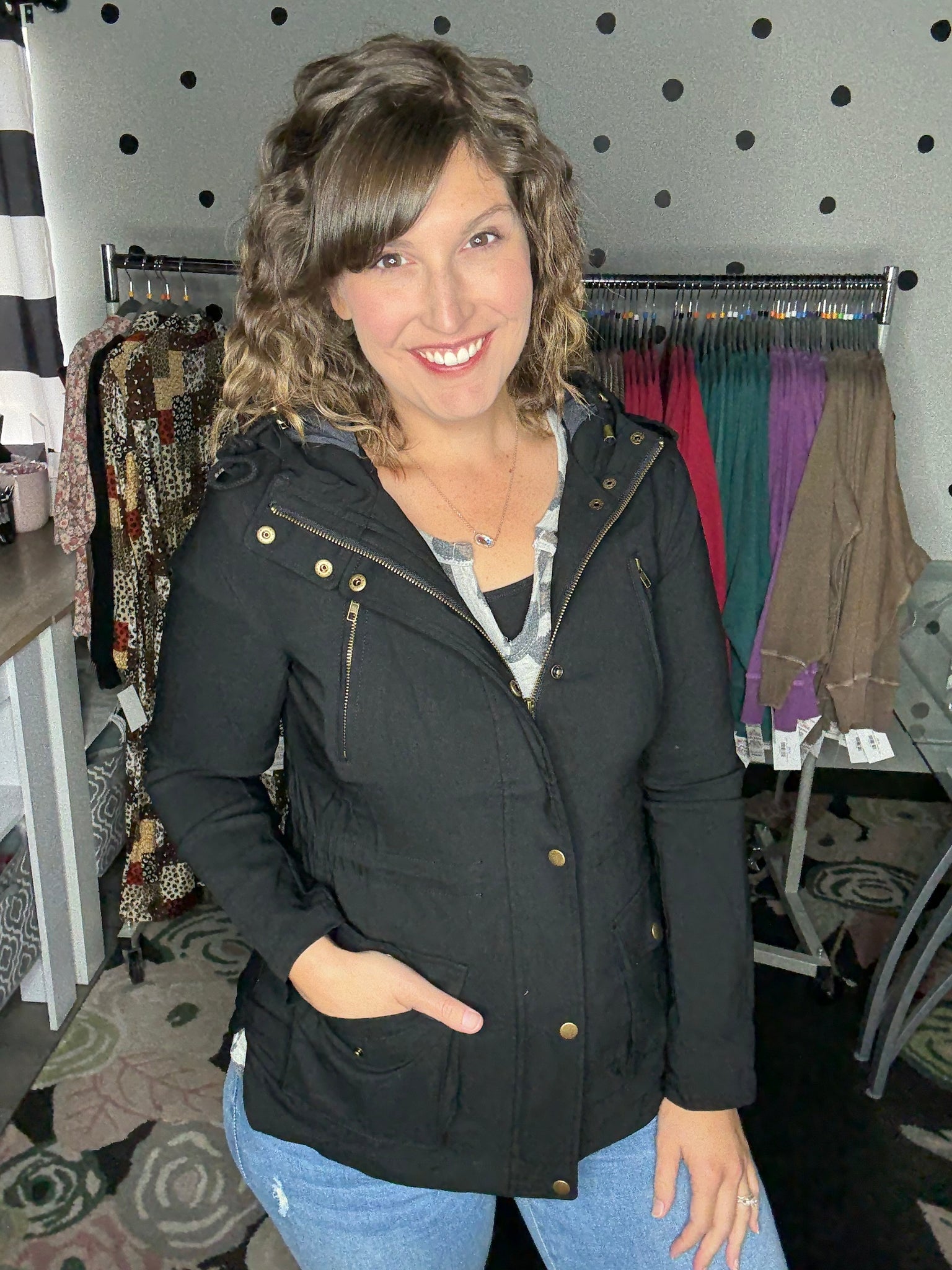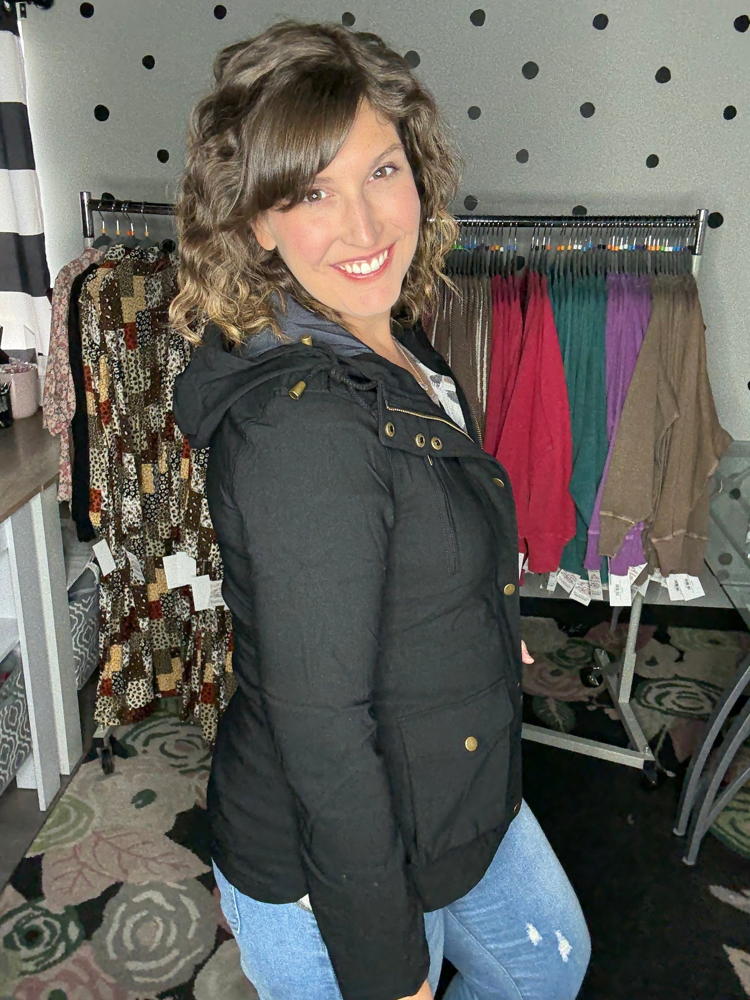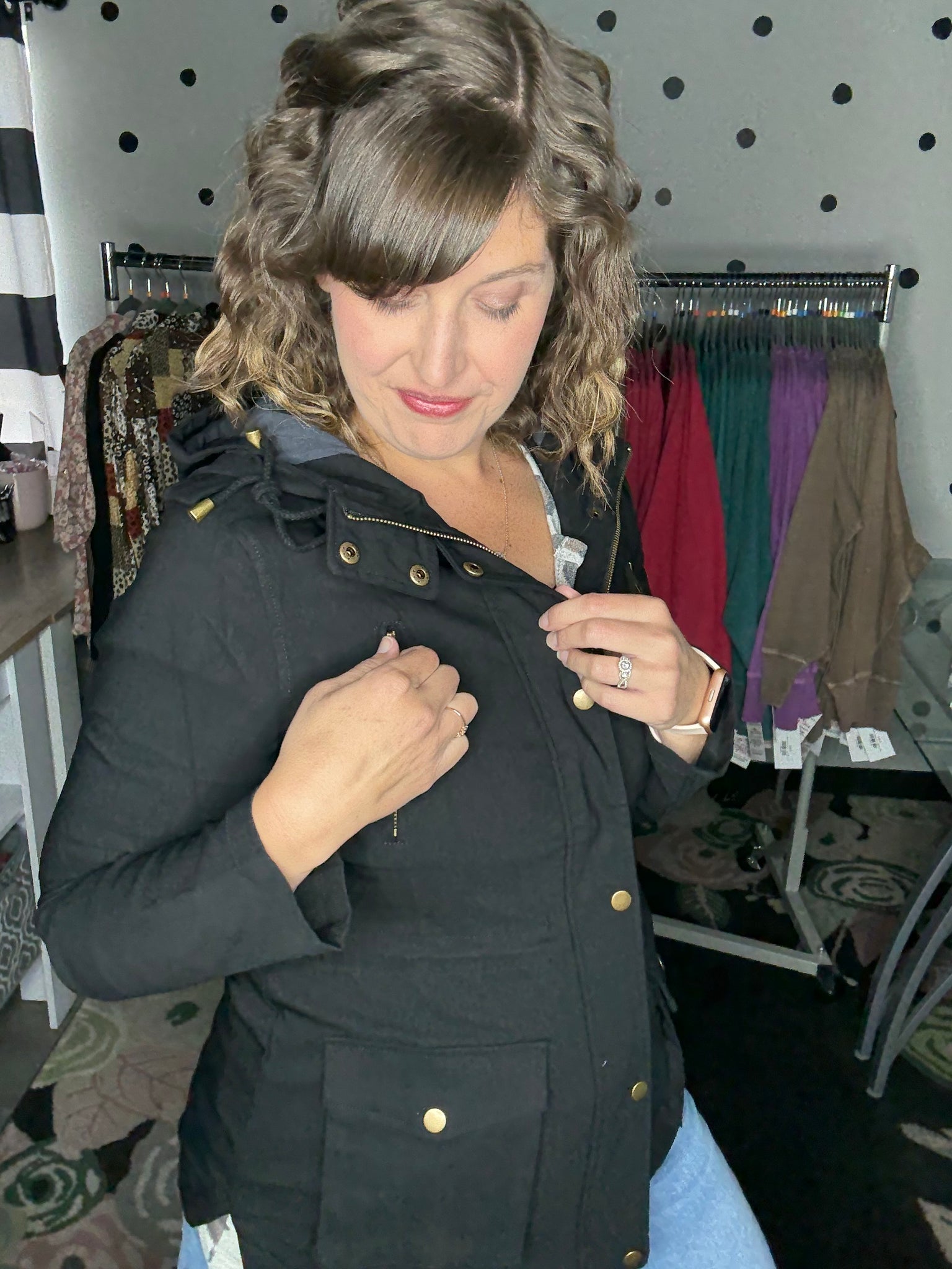 The perfect black jacket for fall! This medium weight coat features both a zip up or snap option. The adjustable waist, hood, and pockets are fantastic too. The fit is true to size. Alyssa is wearing her true size of a medium here. Fabric is 82% rayon, 16% nylon, 2% spandex.